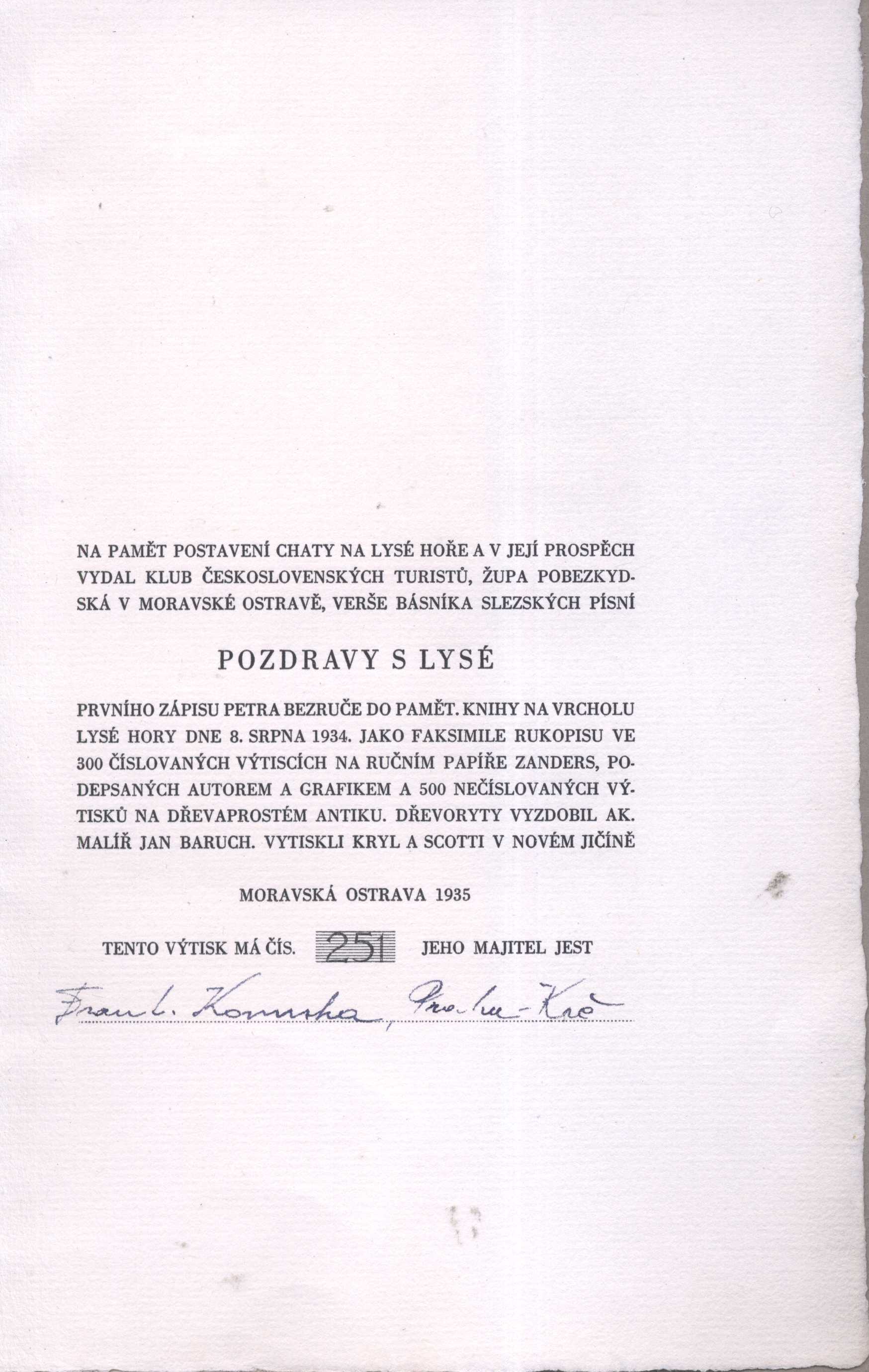 Názvové údaje Pozdravy s Lysé / Petr Bezruč ; [dřevoryty vyzdobil J. Baruch] Osobní jméno Bezruč, Petr, 1867-1958 (Autor) Další autoři Baruch, Jožka, 1892-1966 (Ilustrátor) Korp. Klub československých turistů (Nakladatel, vydavatel) Kryl a Scotti (firma) (Tiskař) Nakladatel Moravská Ostrava : Klub československých turistů, župa Pobezbydská, 1935 Výrobce Kryl a Scotti) Rozsah [8] s. : il. + faksimile ISBN brož. Země vyd. Česko Jazyk dok. čeština Poznámky Vydáno jako faksimile rukopisu ve 300 číslovaných výtiscích na ručním papíře Zanders, podepsaných autorem a grafikem a 500 nečíslovaných výtisků na dřevaprostém Antiku