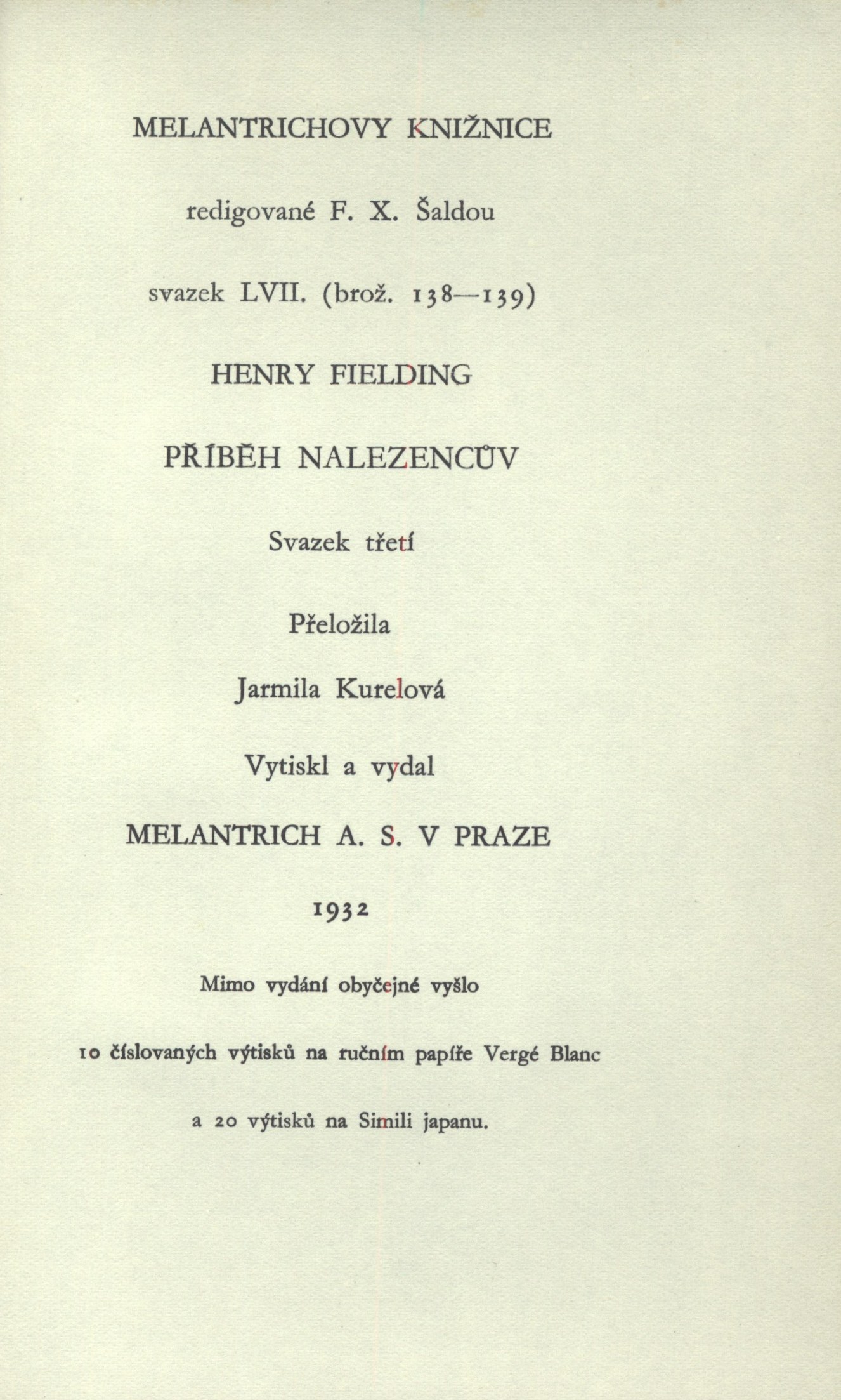 Z tiráže: "Mimo vydání obyčejné vyšlo 10 číslovaných výtisků na ručním papíře Vergé Blanc a 20 výtisků na Simili japanu."