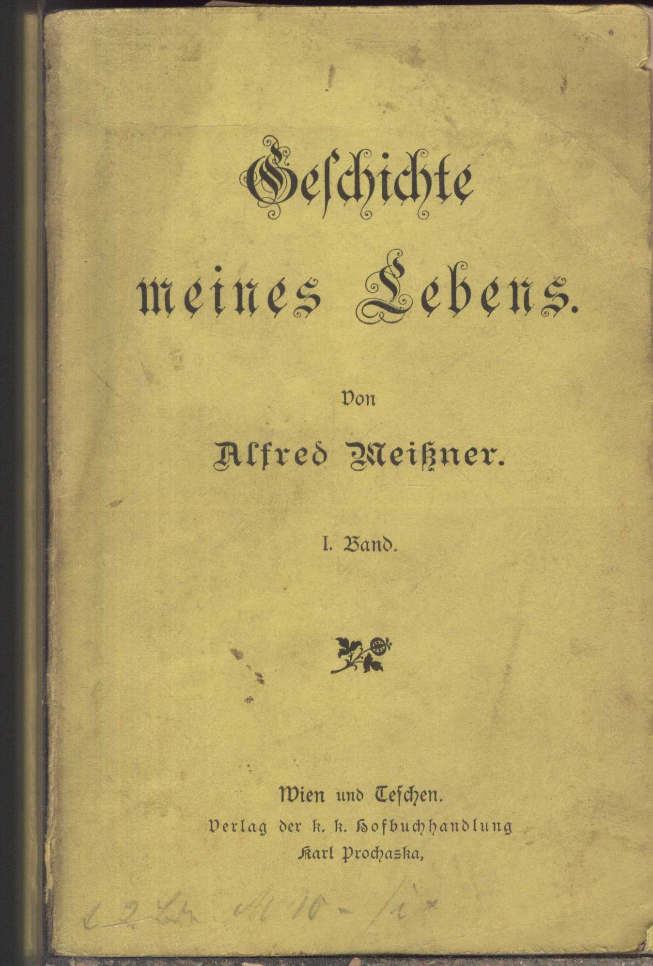 Názvové údaje Geschichte meines Lebens : billige Ausgabe. Band 1. / von Alfred Meissner Osobní jméno Meissner, Alfred, 1822-1885 (Autor) Další autoři Blaschka, Maria (Dřívější majitel) Korp. Karl Prochaska Gesellschaft m. b. H. (Tschechisch Teschen) (Nakladatel, vydavatel) (Tiskař) Nakladatel Wien ; Teschen : Verlag der k. k. Hofbuchhandlung Karl Prochaska, 1885 Rozsah viii, 291 s. ISBN (brož.) Země vyd. Česko * Rakousko Jazyk dok. němčina Poznámky Typografická obálka. - Sazba gotikou. - Ozdobné linky. - Ornamentace. - Reklama.