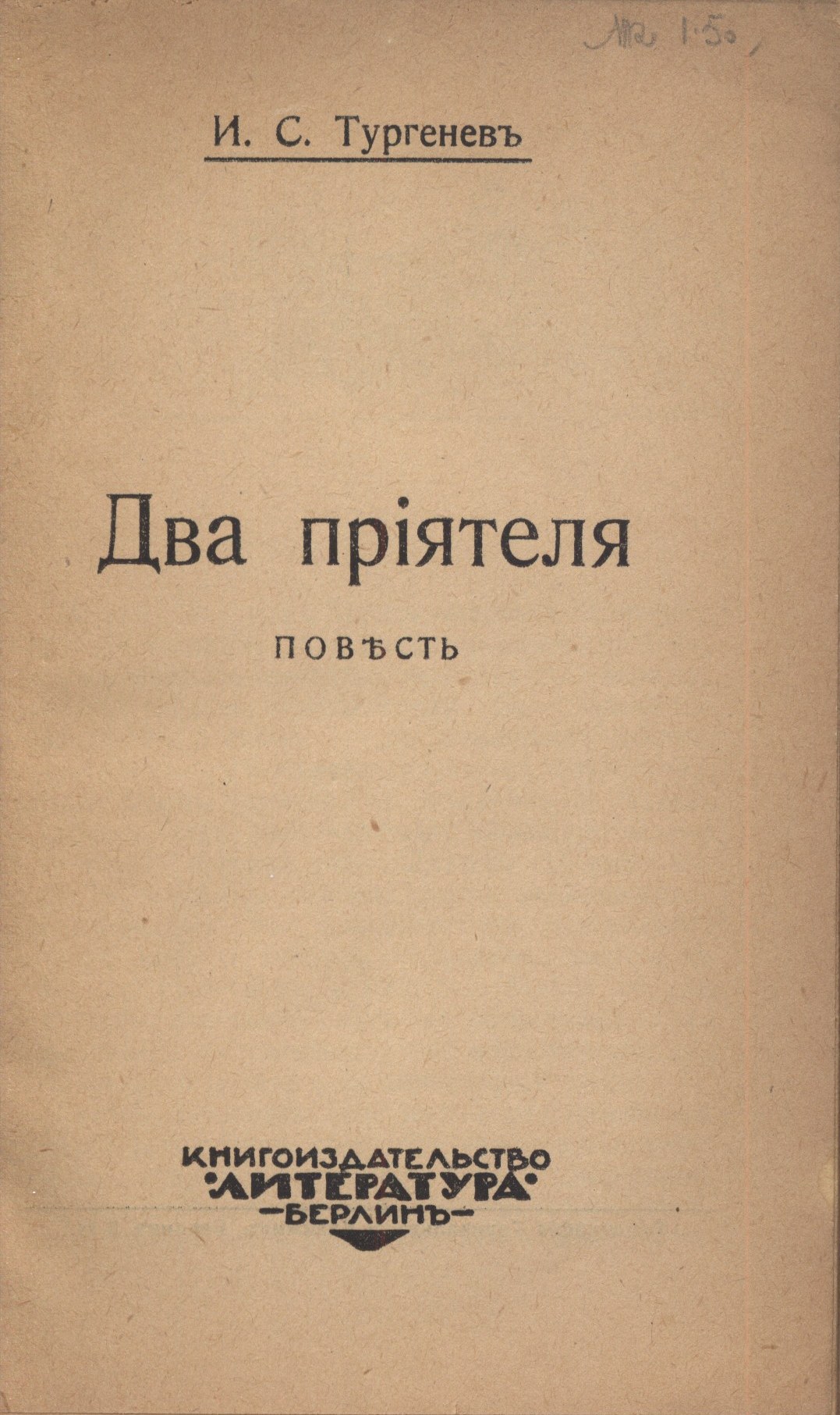 Názvové údaje Dva prijatelja : pověst' / I. S. Turgenev Osobní jméno Turgenev, Ivan Sergejevič, 1818-1883 (Autor) Další autoři Literatura (Nakladatel, vydavatel) Další var.názvy Zwei Freunde Nakladatel Berlin : Knigoizdatel'stvo Literatura, [1921] Výrobce Tipografija Grunval'd i Kazimir) Rozsah 79 s. : il. ; 16 cm ISBN (Brož.) Země vyd. Německo Jazyk dok. ruština Poznámky Obálka s ilustrací. - Titulní list. - Text rusky, azbukou. - Vstupní ilustrované záhlaví. - Bez tiráže. - Na zadní straně obálky název německy.