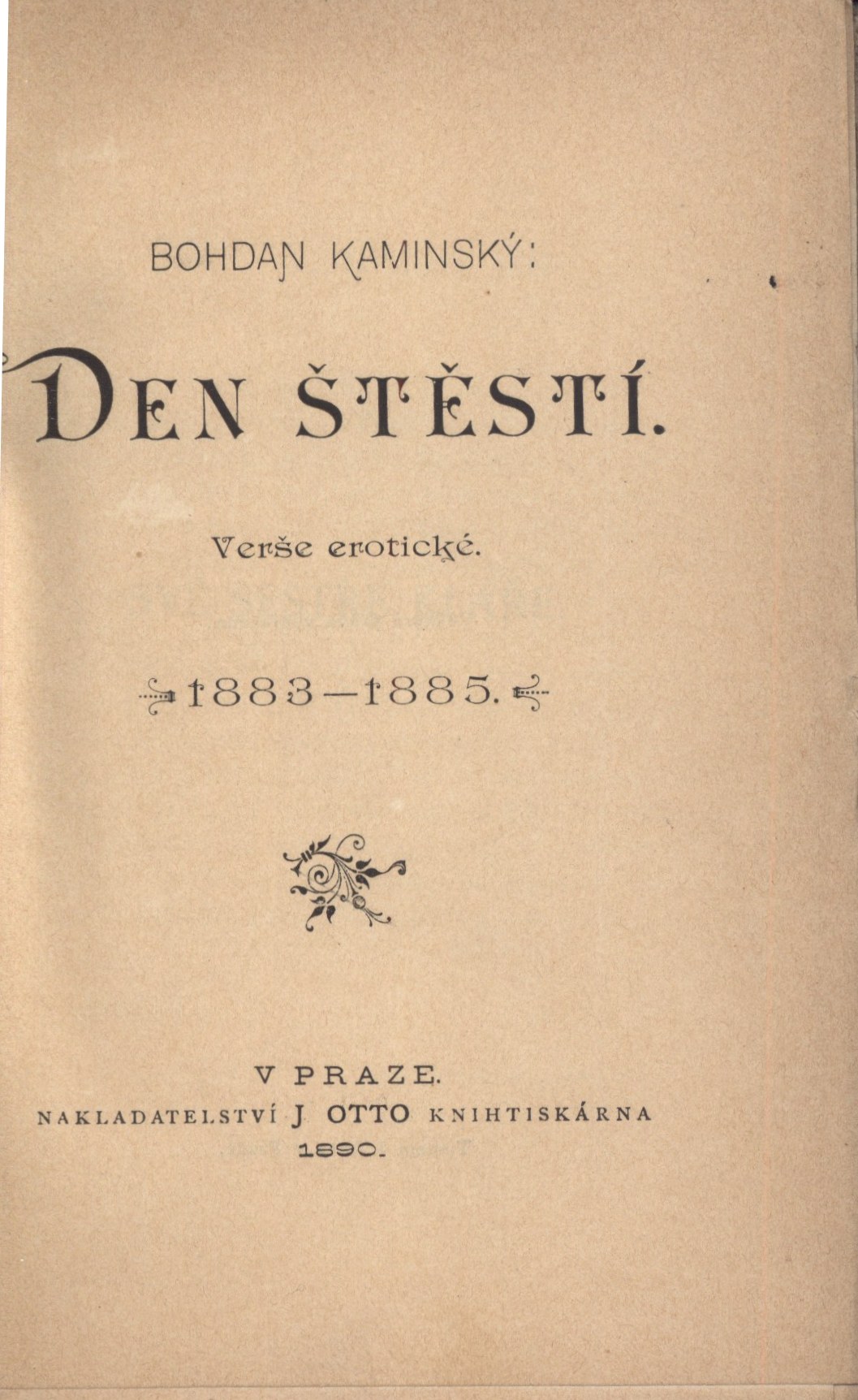 Názvové údaje Den štěstí : verše erotické : 1883-1885 / Bohdan Kaminský Osobní jméno Kaminský, Bohdan, 1859-1929 (Autor) Další autoři J. Otto (nakladatelství) (Nakladatel, vydavatel) J. Otto (knihtiskárna) (Tiskař) Další var.názvy Den štěstí : verše erotické 1883-1885 Nakladatel V Praze : Nakladatelství J. Otto knihtiskárna, 1890 Výrobce (tiskem J. Otty) Rozsah 114 s. : il. ; 16 cm ISBN (Brož.) Země vyd. Česko Jazyk dok. čeština Poznámky Dvoubarevná zdobená obálka. - Titulní list. - Tiskárna. - Zdobná záhlaví. - Iniciály. - Obsah. - Nakladatelské upoutávky tištěné na přídeštích a zadní straně obálky.