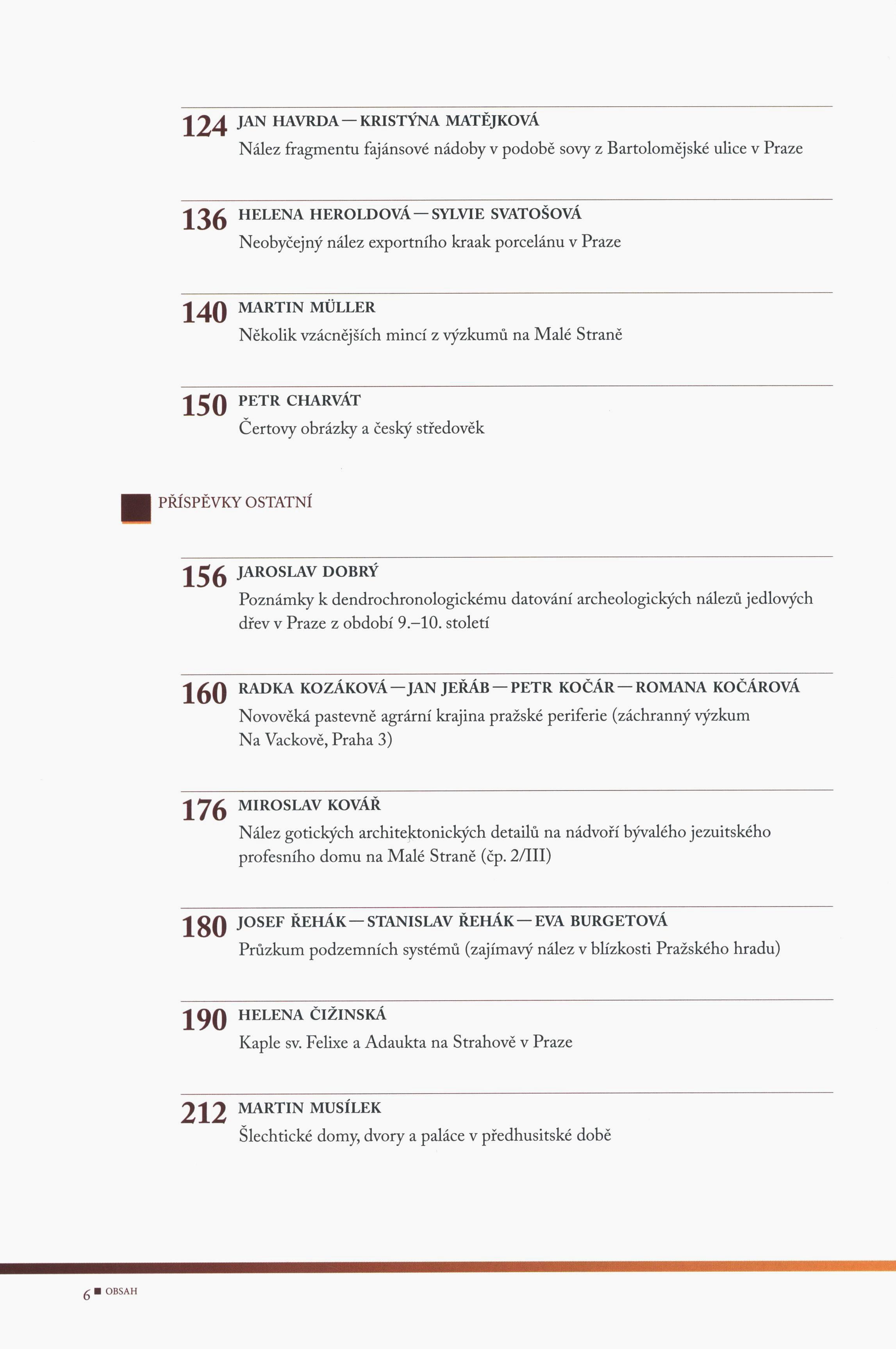 Anotace Sborník příspěvků o různých typech archeologických nálezů na území Prahy. Sborník statí z oblasti archeologie vyšel při příležitosti 60. narozenin české archeoložky Jarmily Čihákové. Ve sborníku najdeme její medailón, seznam všech jejích výzkumů (převážně na Malé Straně) a bibliografii všech článků a statí (seřazený podle let vydání). Vlastní sborník obsahuje osmnáct statí, jejichž námětem jsou archeologické nálezy keramiky, mincí, karet či zbytků opevnění v různých pražských lokalitách. Další stati pojednávají například o podzemních prostorách, o agrární krajině periferie, o šlechtických domech v předhusitské době. Stati obsahují fotografie, mapky, nákresy, tabulky a seznam literatury. Druh dok. monografie Osobní hesla Čiháková, Jarmila - archeoložka Geografické heslo Praha (Česko : oblast) Klíčová slova archeoložky * archeologické výzkumy * archeologické nálezy * archeologie * archeologie středověku * Česko * stol. 20.-21. * sborníky * jubilejní publikace MDT (437.10) * 821.162.3 * 902 * 94(437.311) * (437.311) Signatura Přír.číslo Lokace Info C12d 2110 1063/2016 Fond