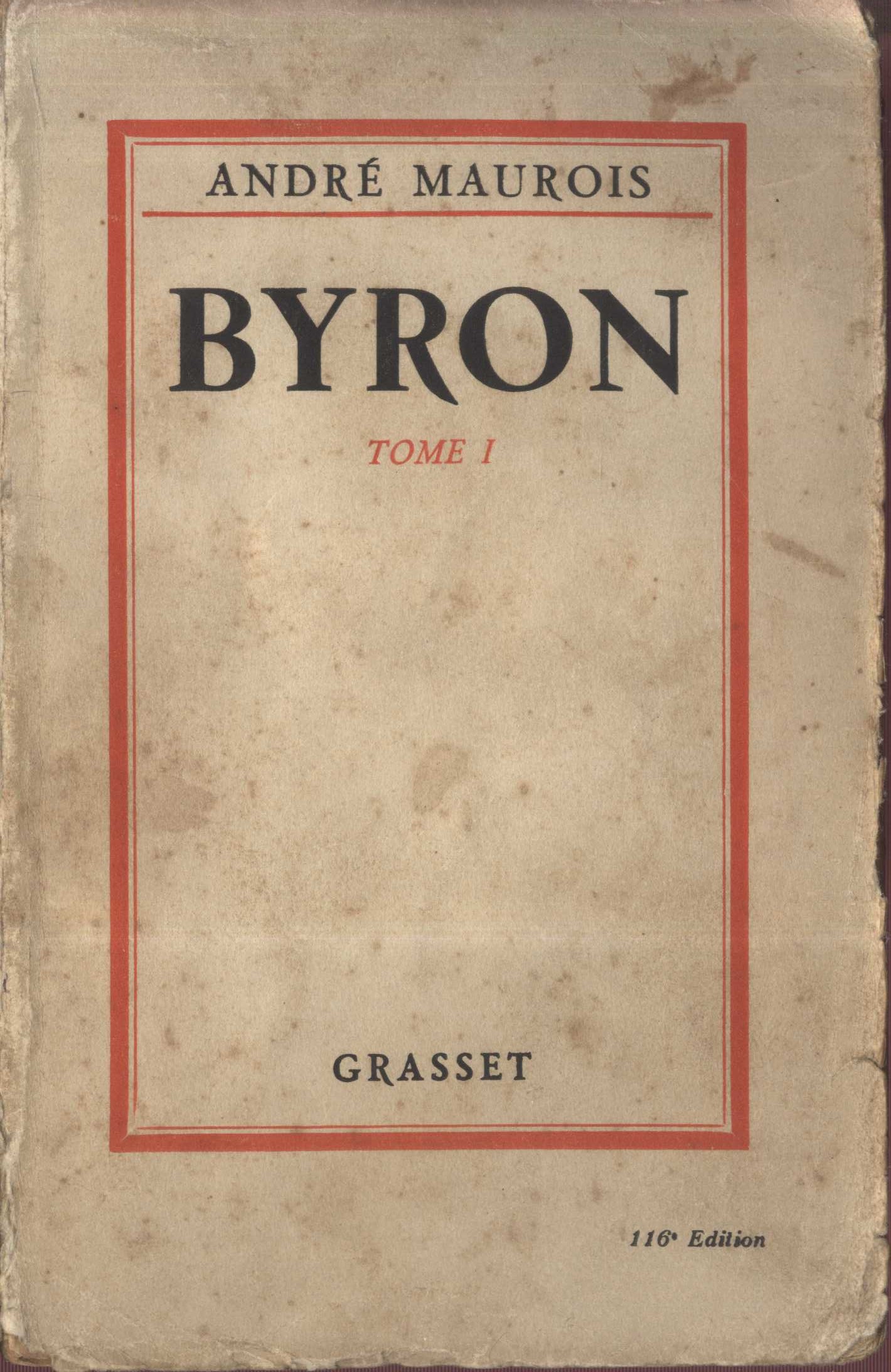 Názvové údaje Byron. 1 / André Maurois Osobní jméno Maurois, André, 1885-1967 (Autor) Další autoři Bernard Grasset (firma) (Nakladatel, vydavatel) Imprimerie Moderne (Montrouge, Francie) (Tiskař) Údaje o vydání 116e edition Nakladatel Paris : Bernard Grasset, 1930 Výrobce A Montrouge : Imprimerie Moderne, 1930 Rozsah 368 stran ISBN (brožováno) Země vyd. Francie Jazyk dok. francouzština Poznámky Přední strana obálky zdobena dvojitým rámcem a tištěna černě a červeně. - Předmluva. - Na zadní straně nakladatelská reklama. - Informace o dalších dílech autora. - Na titulním listu nakladatelský signet.
