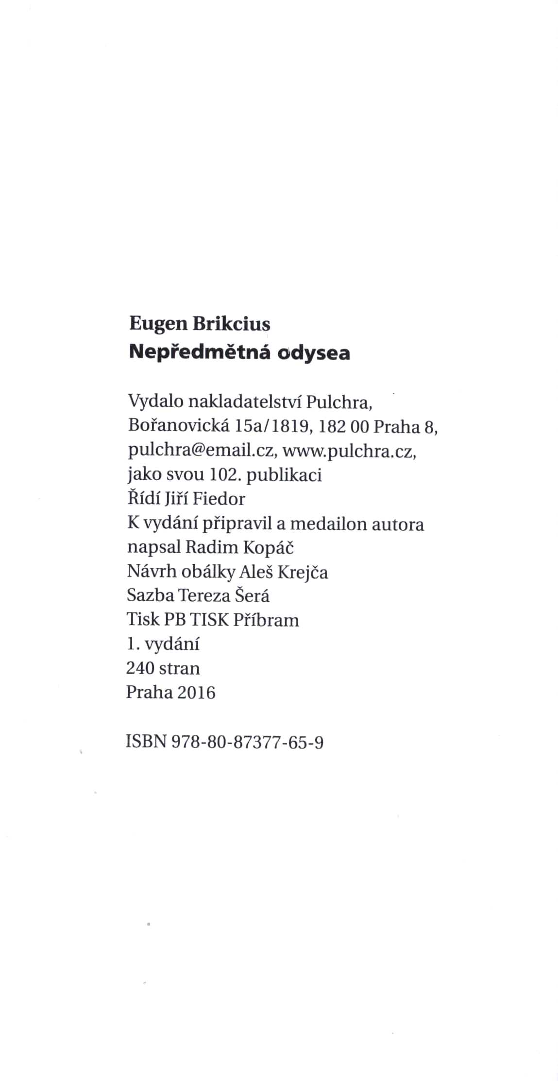 Anotace Román částečně veršovaný, milostný, detektivní, cestopisný a metafyzický, jako je ostatně celý autorův život. Nepředmětná Odyssea měla být původně další sbírkou poezie Eugena Brikciuse. Složené básně ale automaticky doplňoval prozaickými texty a vše posléze chronologicky i významově řadil, takže plánovaná sbírka začala kategoriálně přecházet v román. Příběh vykazuje mnohé autobiografické prvky. Druh dok. monografie Klíčová slova česká próza * česká poezie * román * verše * autobiografické prvky MDT 821.162.3-3 * 821.162.3-1 * 82-311.8 * 82-312.4 * 82-31 * 82-1 Uživatelské pole PNP Nepředmětná Odyssea je volným pokračováním Brikciových pamětí, které nakladatelství Pulchra vydalo pod názvem Můj nejlepší z možných životům (2012). Signatura Přír.číslo Lokace Info C12b 16793 1596/2016 Sbírka