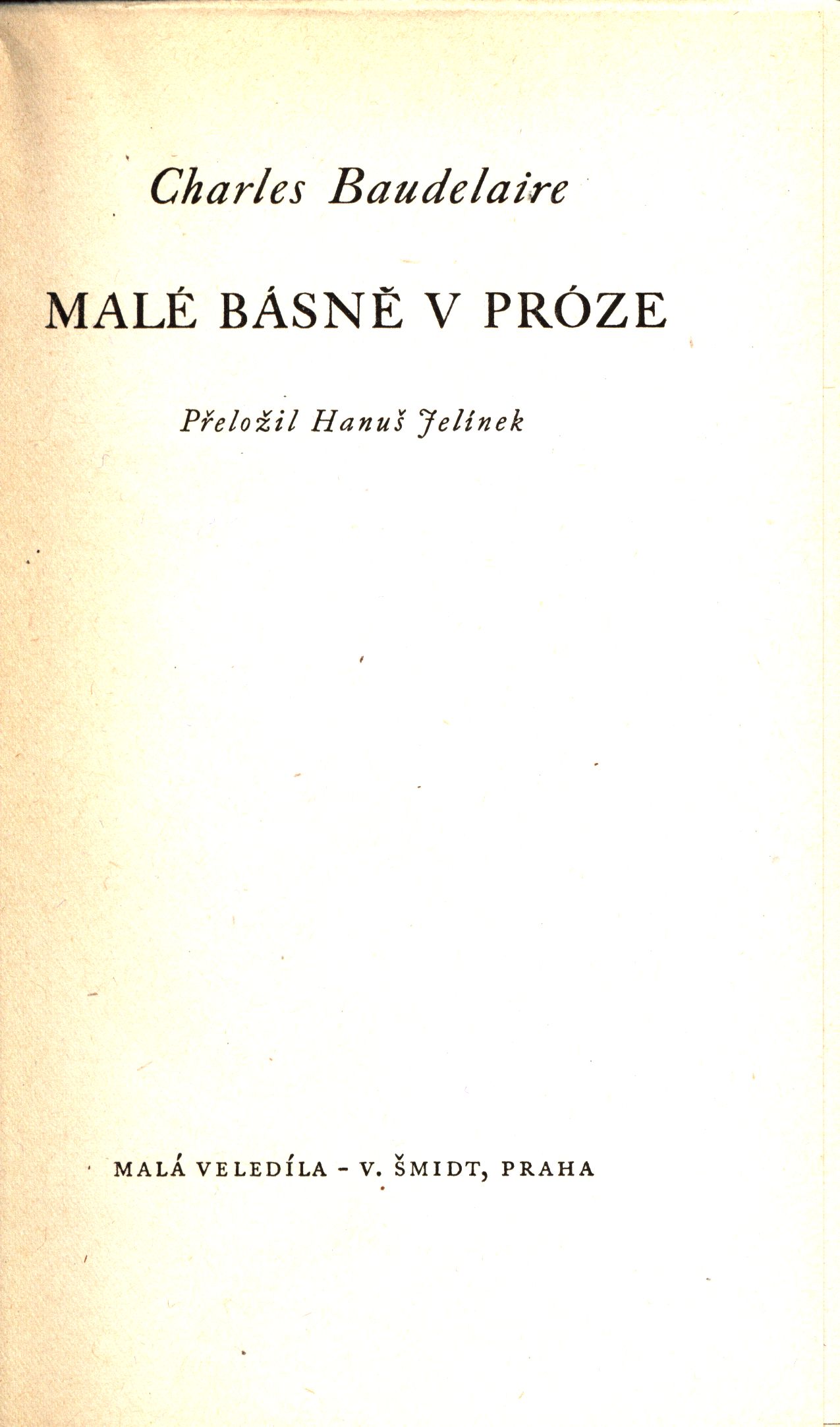 Názvové údaje Malé básně v próze / Charles Baudelaire ; přeložil Hanuš Jelínek ; vyzdobil Zdeněk Sklenář ; typograficky upravil Method Kaláb Osobní jméno Baudelaire, Charles, 1821-1867 (Autor) Další autoři Jelínek, Hanuš, 1878-1944 (Překladatel) Sklenář, Zdeněk, 1910-1986 (Autor obálky) Kaláb, Method, 1885-1963 (Typograf) Korp. Vilém Šmidt (nakladatelství) (Nakladatel, vydavatel) Průmyslová tiskárna v Praze (Tiskař) Údaje o vydání II. vydání Nakladatel Praha : V. Šmidt, 1946 Výrobce Průmyslová tiskárna Rozsah 119 stran ; 18,5 cm ISBN (Brožováno) Edice Malá veledíla ; sv. 2