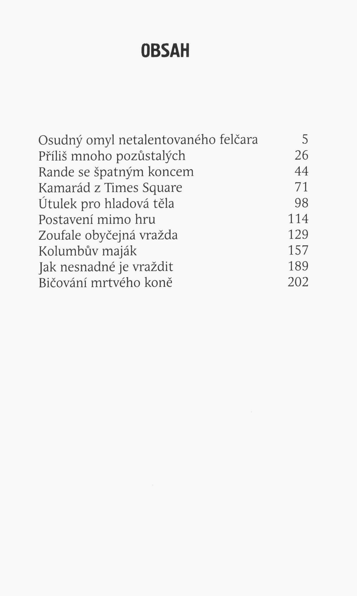 Anotace "Nezavraždila jsem ho, ale když se nyní o něm dozvídám to, o čem jsem neměla ani tušení, přeji si, aby byl skutečně mrtev!" vykřikla při výslechu manželka úspěšného, ale nyní nezvěstného podnikatele. Krátce nato se zhroutila a musela jí být poskytnuta lékařská pomoc. Dramatická scéna v jedné z povídek naznačuje bolestně vypjaté lidské vztahy, v jejichž líčení je Roman Cílek nadmíru zkušeným tvůrcem. Soubor deseti detektivních povídek zkušeného autora tohoto žánru přináší příběhy, v nichž vyostřené vztahy mezi lidmi společně s negativními vlastnostmi jednotlivců vedou často až ke spáchání těžkých zločinů. Druh dok. monografie Klíčová slova česká próza * detektivní povídky * soubor povídek MDT 821.162.3-3 * 821.162.3 * 82-3 * 82-32 Uživatelské pole PNP U sign. C12b17381 (vázaný výtisk) lepenková vazba s barevným fotografickým polepem. - Nakladatelská značka. - Proti titulu tiráž s copyrightem a edicí. - Titulní list. - Obsah. - Ediční seznam se značkou. - Upoutávka na zadní straně obálky, opakují se značky Rozsah: 141, [3] s. Rozměr: 18,6 cm Signatura Přír.číslo Lokace Info C12b 17381 0636/2017 Sbírka