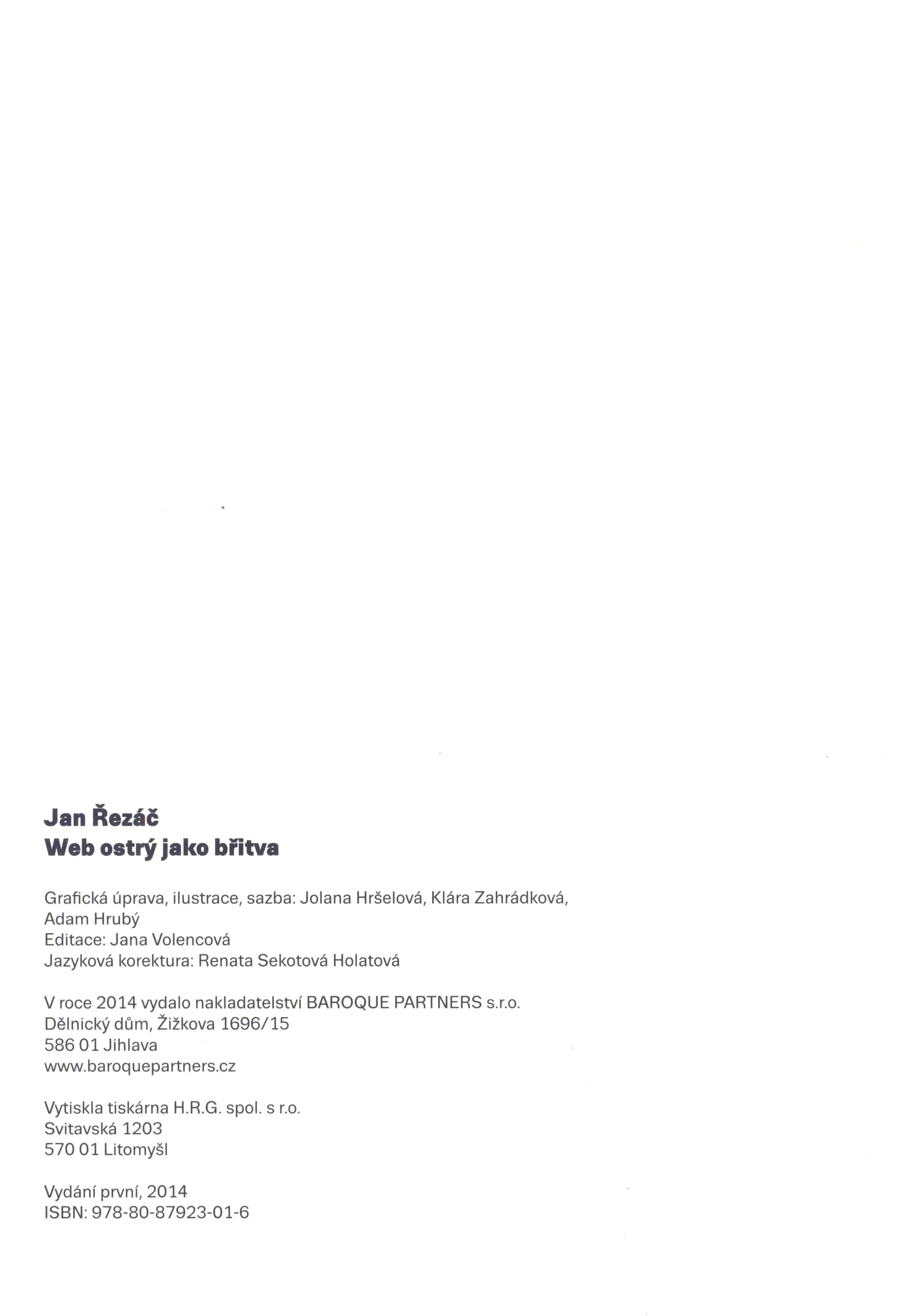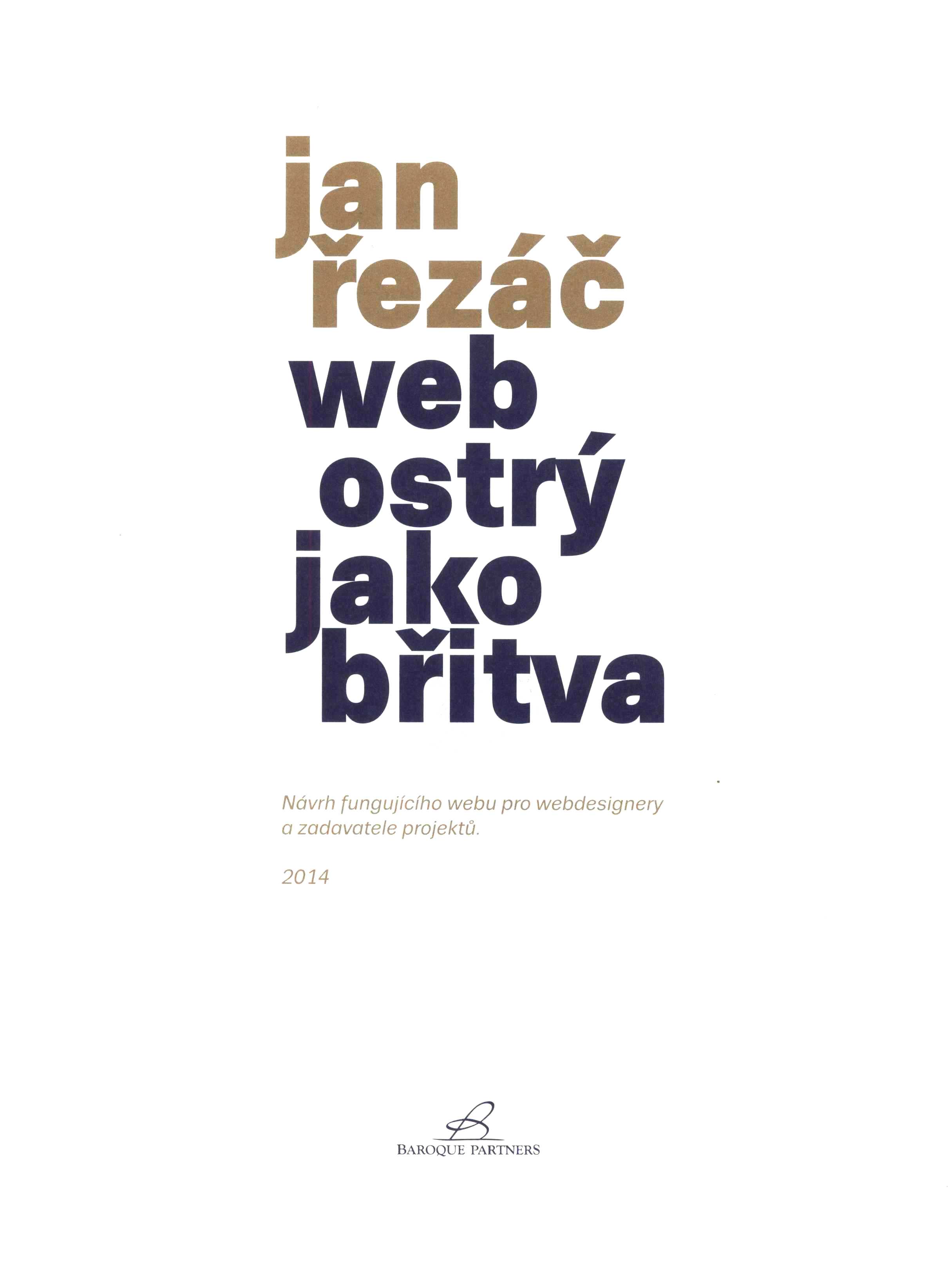 Názvové údaje Web ostrý jako břitva : návrh fungujícího webu pro webdesignery a zadavatele projektů / Jan Řezáč ; grafická úprava, ilustrace, sazba: Jolana Hršelová, Klára Zahrádková, Adam Hrubý Osobní jméno Řezáč, Jan, 1984- (Autor) Další autoři Hršelová, Jolana, 1982- (Knižní grafik) Zahrádková, Klára, 1990- (Ilustrátor) Hrubý, Adam, 1984- (Sazeč) (Knižní grafik) Korp. Baroque Partners (nakladatelství) (Nakladatel, vydavatel) HRG Litomyšl (tiskárna) (Tiskař) Údaje o vydání Vydání 1. Nakladatel Jihlava : Baroque Partners, 2014 Výrobce Litomyšl : H.R.G. spol. s.r. Rozsah 211 stran : ilustrace ; 29 cm ISBN 978-80-87923-01-6 (brožováno) Země vyd. Česko Jazyk dok. čeština Poznámky Modrá obálka se zlacenou ilustrací a s dvoubarevným textem. - Na přední záložce podnázev a anotace knihy. - Na rubu modré přední strany obálky bílý text s obsahem knihy. - Přiznaná šitá vazba. - Patitul s nakladatelskou značkou a s dvoubarevným textem. - Dvoubarevný text a nakladatelská značka na titulním listu. - Úvod autora. - V knize barevné listy, různobarevný text, barevné ilustrace. - Marginálie. - Závěr autora. - O autorovi.