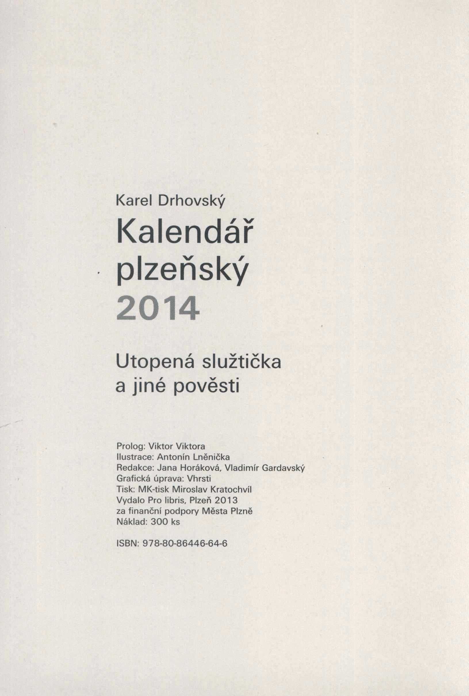 1. Názvové údajeKalendář plzeňský 2014 : kratochvilné čtení na každý měsíc. Utopená služtička a jiné pověsti / Karel Drhovský