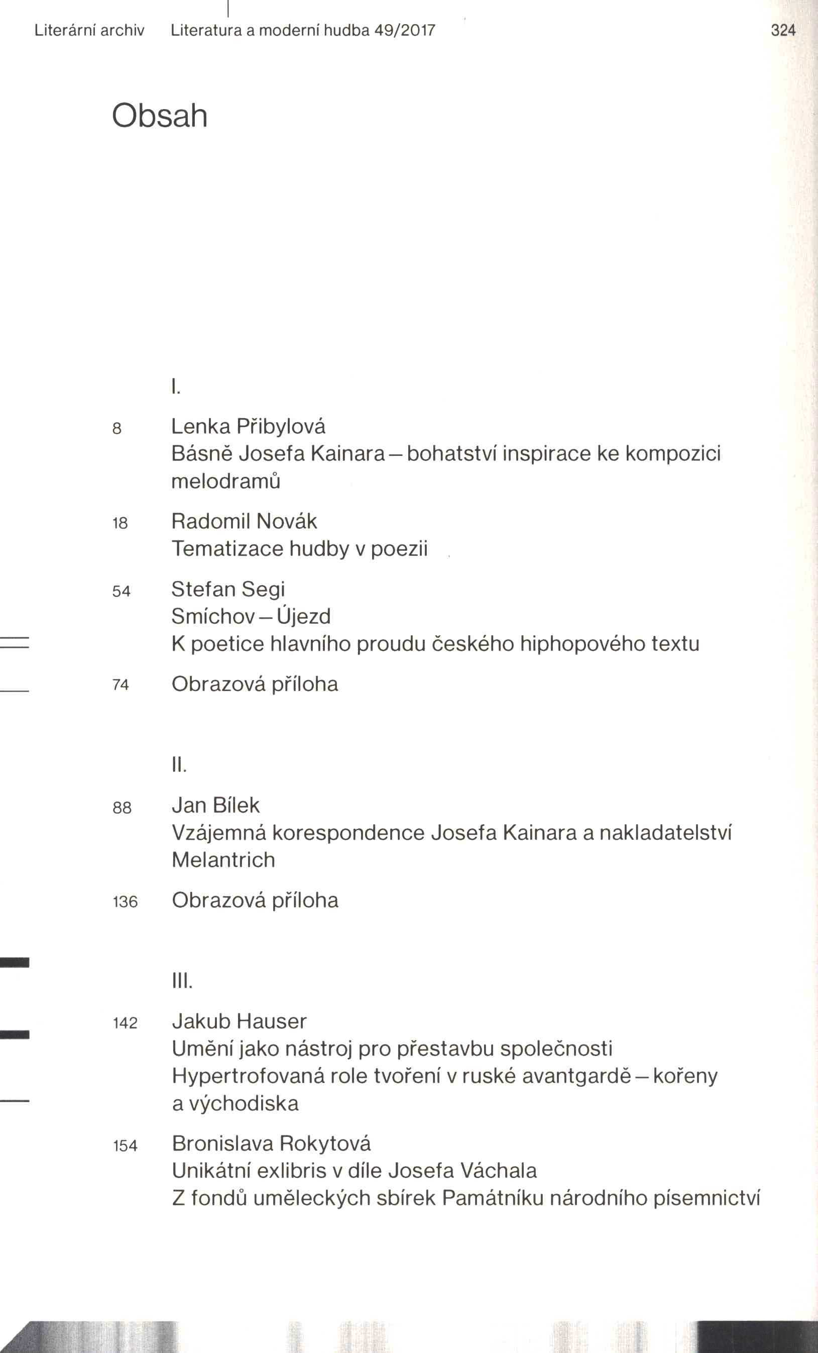 Názvové údaje Literární archiv : sborník Památníku národního písemnictví = Jahrbuch des Museums der tschechischen Literatur = Annual of the Museum of Czech Literature = Almanach du Musée de la littérature tchèque. Literatura a moderní hudba. Ke 100. výročí narození Josefa Kainara Další autoři Schreiberová, Jarmila, 1949- (Šéfredaktor, odpovědný redaktor) Sudzinová, Tereza, 1991- (Šéfredaktor, odpovědný redaktor) Paton, Derek, 1958- (Překladatel) Bohner, Sébastien, 1975- (Knižní grafik) Bosák, Petr, 1985- (Knižní grafik) Jansa, Robert, 1985- (Knižní grafik) Macháček, Adam, 1980- (Knižní grafik) Korp. Památník národního písemnictví (muzeum literatury) (Nakladatel, vydavatel) Indigoprint (tiskárna) (Tiskař) Roč., číslo 49, 2017 Údaje o vydání Vydání první Nakladatel Praha : Památník národního písemnictví, 2017 Výrobce Indigoprint Rozsah 327 stran : ilustrace, fotografie, portréty, faksimile ; 23 cm ISBN 978-80-87376-42-3 (brožováno) ISSN 0231-5904 Země vyd. Česko Jazyk dok. čeština Poznámky Zdob. obálka. - Autogram a čb. kresba na patitulu. - Čb. i barevné fotografie, portréty a faksimile. - 250 výtisků