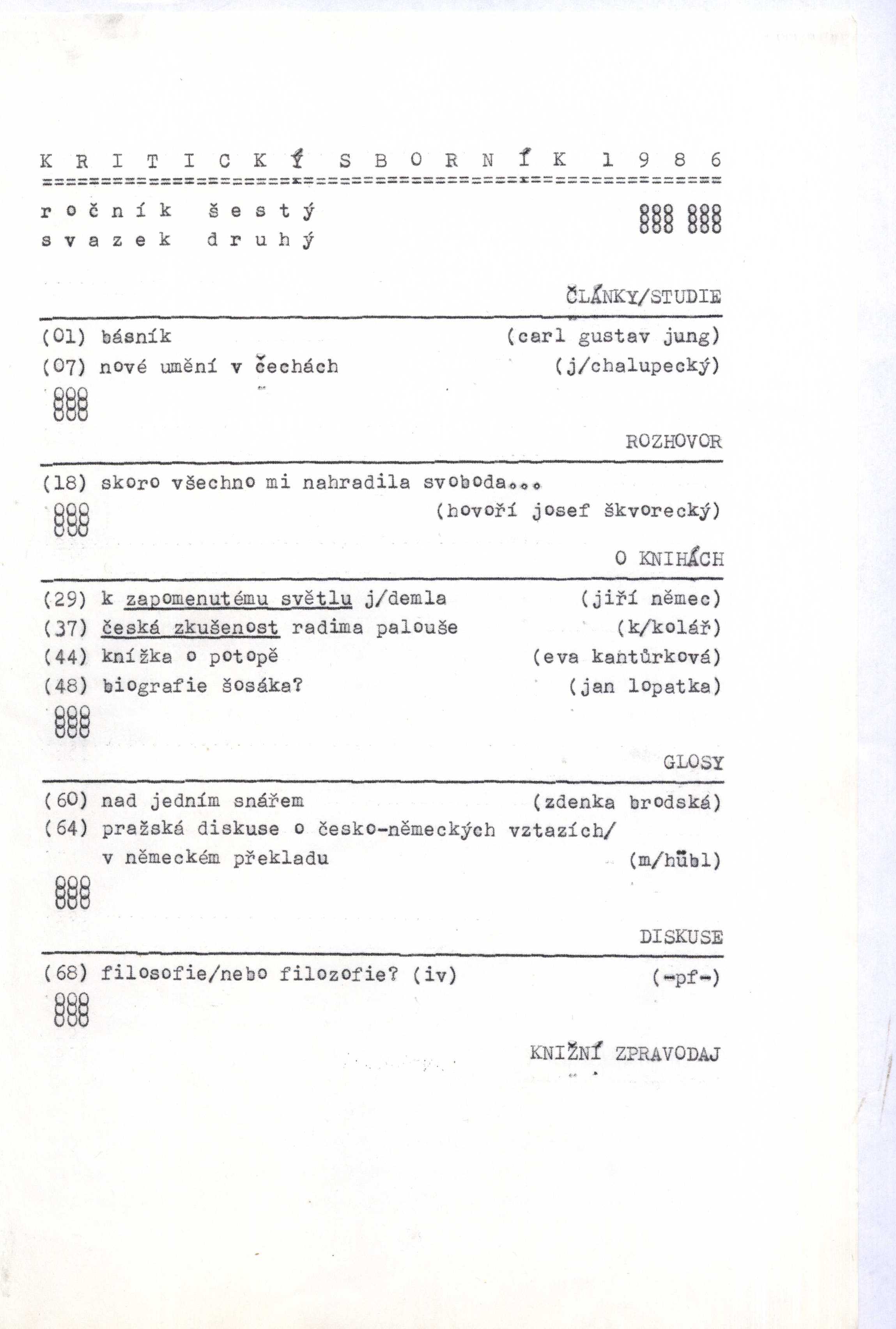 Názvové údaje Kritický sborník Roč., číslo Ročník 6, svazek 1-4 + Obsahy 1981-1985, 1986 Nakladatel [Praha] : [nakladatel není známý], 1986 Rozsah 30 cm Země vyd. Česko Jazyk dok. čeština Poznámky Strojopis na bílém, popř. žlutém průklepovém papíru. - Listy sepnuté sešívačkou do kartonových desek. - Přiloženy Obsahy Kritického sborníku za roky 1981-1985 (13 listů sepnutých do kartonových desek). - Samizdat
