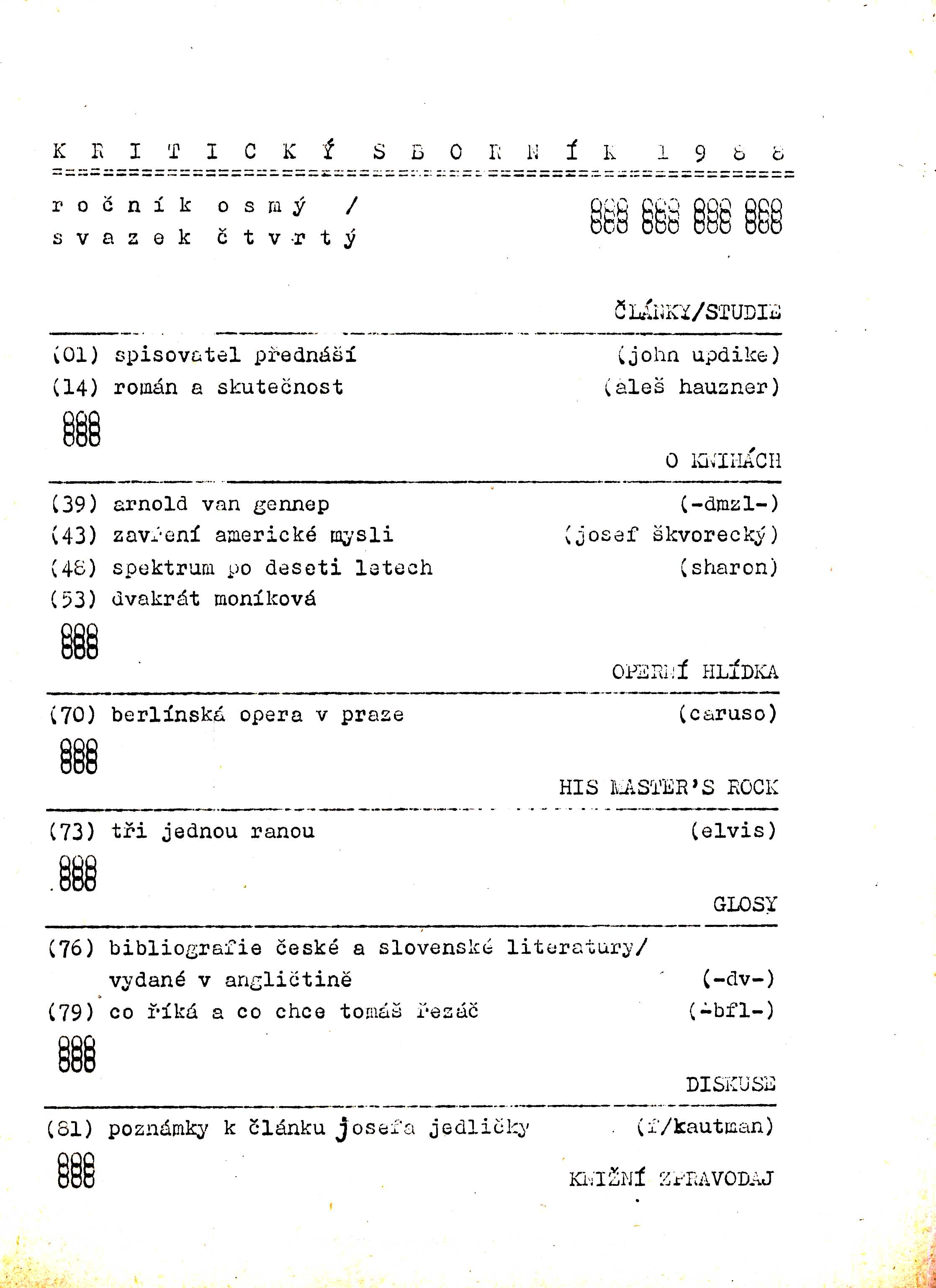 Názvové údaje Kritický sborník Roč., číslo Ročník 8, svazek 1-4, 1988 Nakladatel [Praha] : [nakladatel není známý], 1988 Rozsah 30 cm Země vyd. Česko Jazyk dok. čeština Poznámky Svazek 1-3 strojopis na bílém, popř. barevném průklepovém papíru, svazek 4 rozmnožen. - Listy sepnuté sešívačkou do kartonových desek. - Samizdat