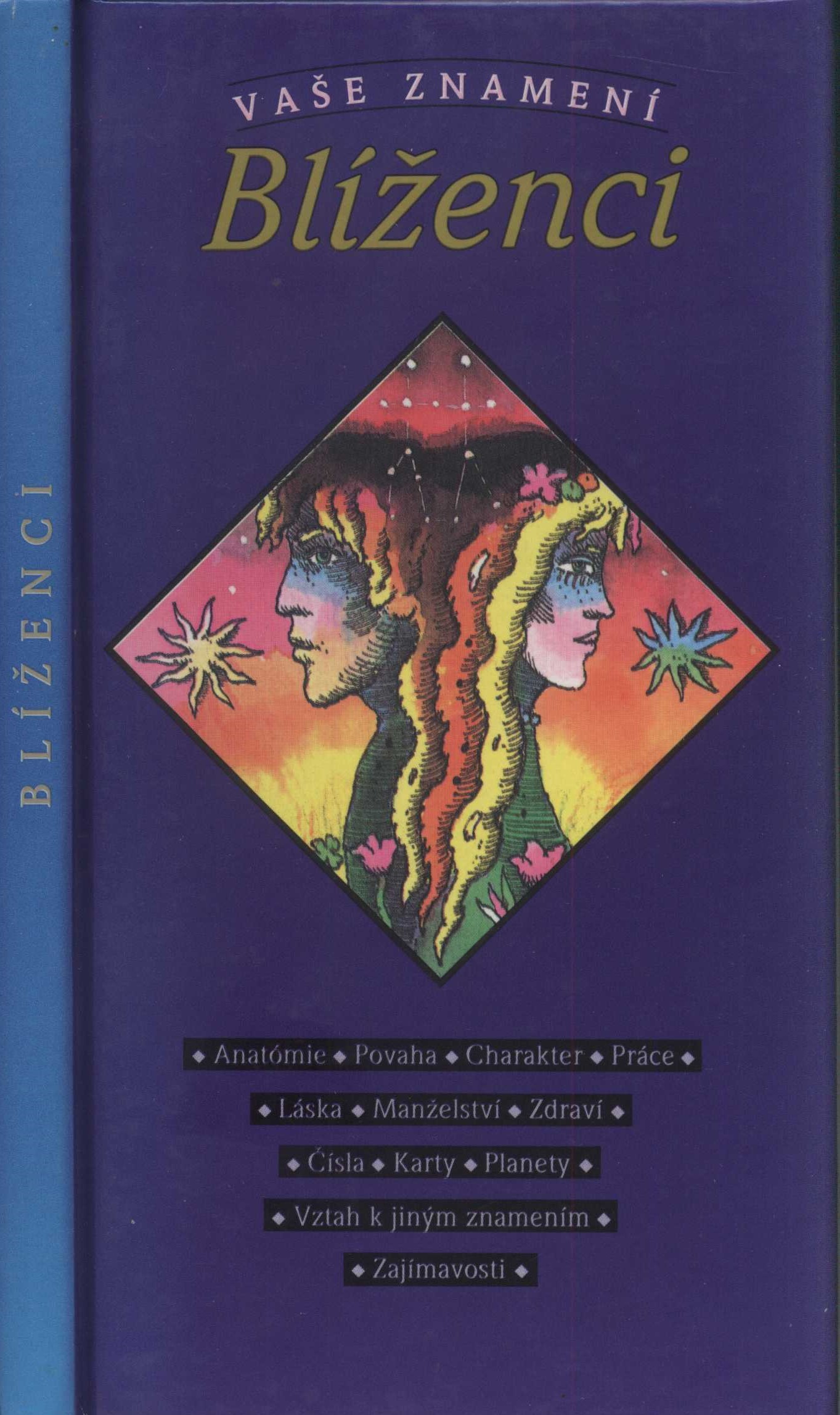 Poznámka o dalších původcích Translation Natália Pončáková Druh dok. monografie Název na hřbetu Blíženci Poznámky o skryté bibliografii a rejstřících Obsahuje bibliografii Klíčová slova slovenská literatura * astrologie * znamení * astrologické znamení * Blíženci * ilustrace MDT 821.162.4 * 133.52 * (084.1) Uživatelské pole PNP Knihovna V. Zinkové. U sign. VZinková 0472 (vázaný výtisk) barevnou ilustrací zdobená vazba, lakovaná. - Žluté předsádkové listy. - Patitul. - Barevnou ilustrací zdobený titulní list. - Iniciály. - Barevné ilustrace v textu. - Doslov. - Použitá litearatura. - Obsah. - Tiráž. - Znamení zvěrokruhu na zadní straně vazby. U sign. VZinková 0472 vepsaná dedikace proti titulu (černě, propiskou): "Drahé Violce v červnu 1995 ... [nečit.] mnoho štěstí každý rok! ♥" Rozsah: 109, [3] s. Rozměr: 19,6 cm. Signatura Přír.číslo Lokace Info VZinková 0472 0649/2019 Sbírka