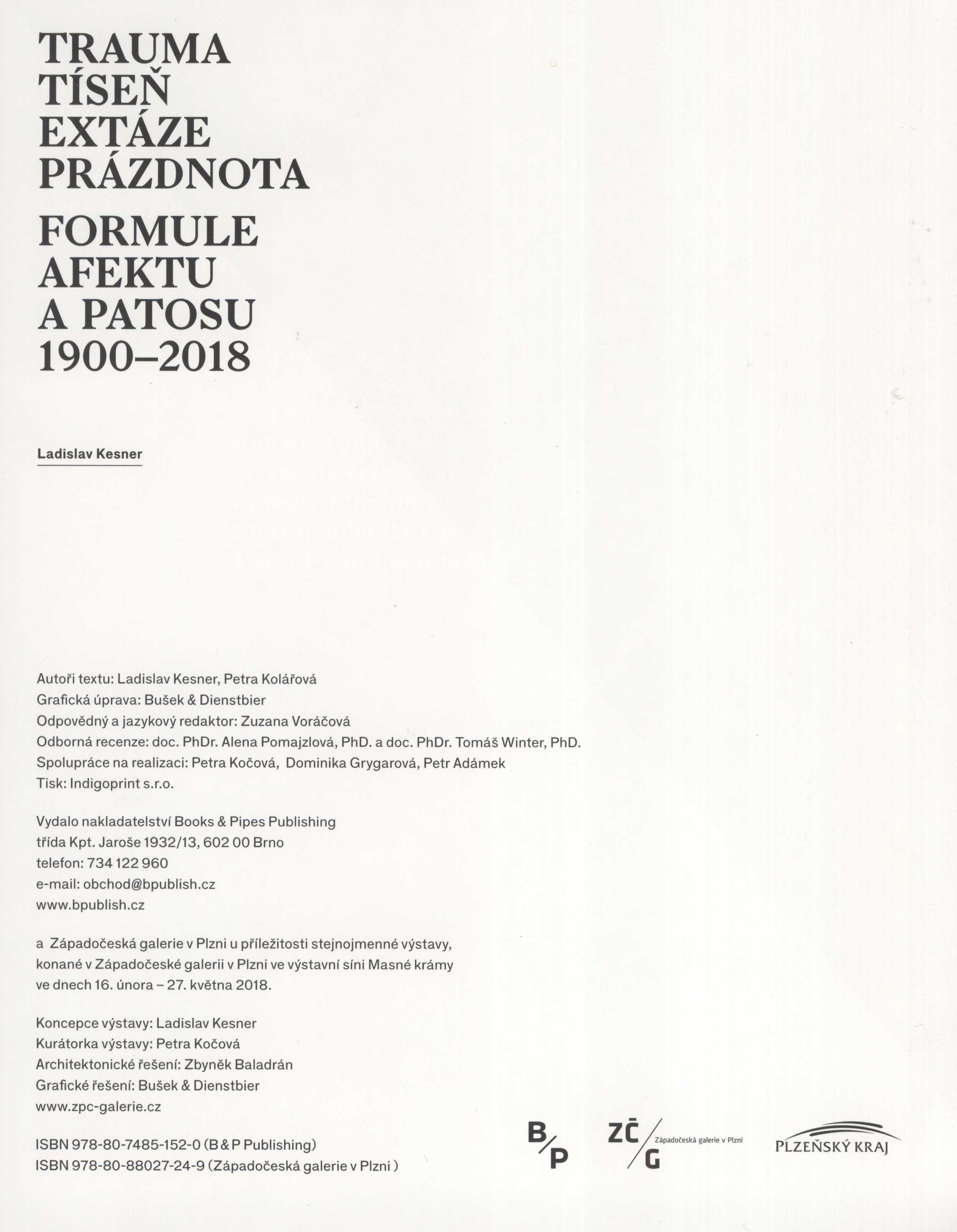 Názvové údaje Trauma, tíseň, extáze, prázdnota : formule afektu a patosu 1900-2018 / Ladislav Kesner ; autoři textu: Ladislav Kesner, Petra Kolářová ; grafická úprava: Bušek & Dienstbier (Martin Bušek a Jan Dienstbier) Osobní jméno Kesner, Ladislav, 1961- (Autor) (Autor koncepce) Další autoři Kolářová, Petra, (Autor) (Kurátor výstavy) 1979- Bušek, Martin, 1984- (Knižní grafik) (Jiná role) Dienstbier, Jan, 1978- (Knižní grafik) (Jiná role) Korp. Výstavní síň Masné krámy (Plzeň, Česko) (Organizátor akce) Books & Pipes Publishing (nakladatelství) (Nakladatel, vydavatel) Západočeská galerie (Plzeň, Česko) (Nakladatel, vydavatel) Indigoprint (tiskárna) (Tiskař) Nakladatel Brno : Books & Pipes Publishing ; v Plzni : Západočeská galerie, 2018 Výrobce [Praha] : Indigoprint s.r.o. Rozsah 277 stran : ilustrace (převážně barevné), portréty, faksimile ; 26 cm ISBN 978-80-7485-152-0 (B&P Publishing ; brožováno) 978-80-88027-24-9 (Západočeská galerie ; brožováno) Země vyd. Česko Jazyk dok. čeština Poznámky Bílá obálka s barevnou reprodukcí, zlatý tlačený text (i na hřbetu), nakladatelská značka na hřbetu. - Na záložkách stručné biografie autorů. - Nakladatelská značka na vakátě. - Copyrighty (obrazové podklady). - Frontispis. - Obsah. - Úvod L. Kesnera. - Texty. - Černobílé, tónované a barevné fotografie, reprodukce, ilustrace, kresby, faksimile s popisky. - Zdroje ilustrací. - O autorech. - Značka a loga nakladatelů v tiráži. - Logo galerie a anotace knihy na zadní straně obálky.