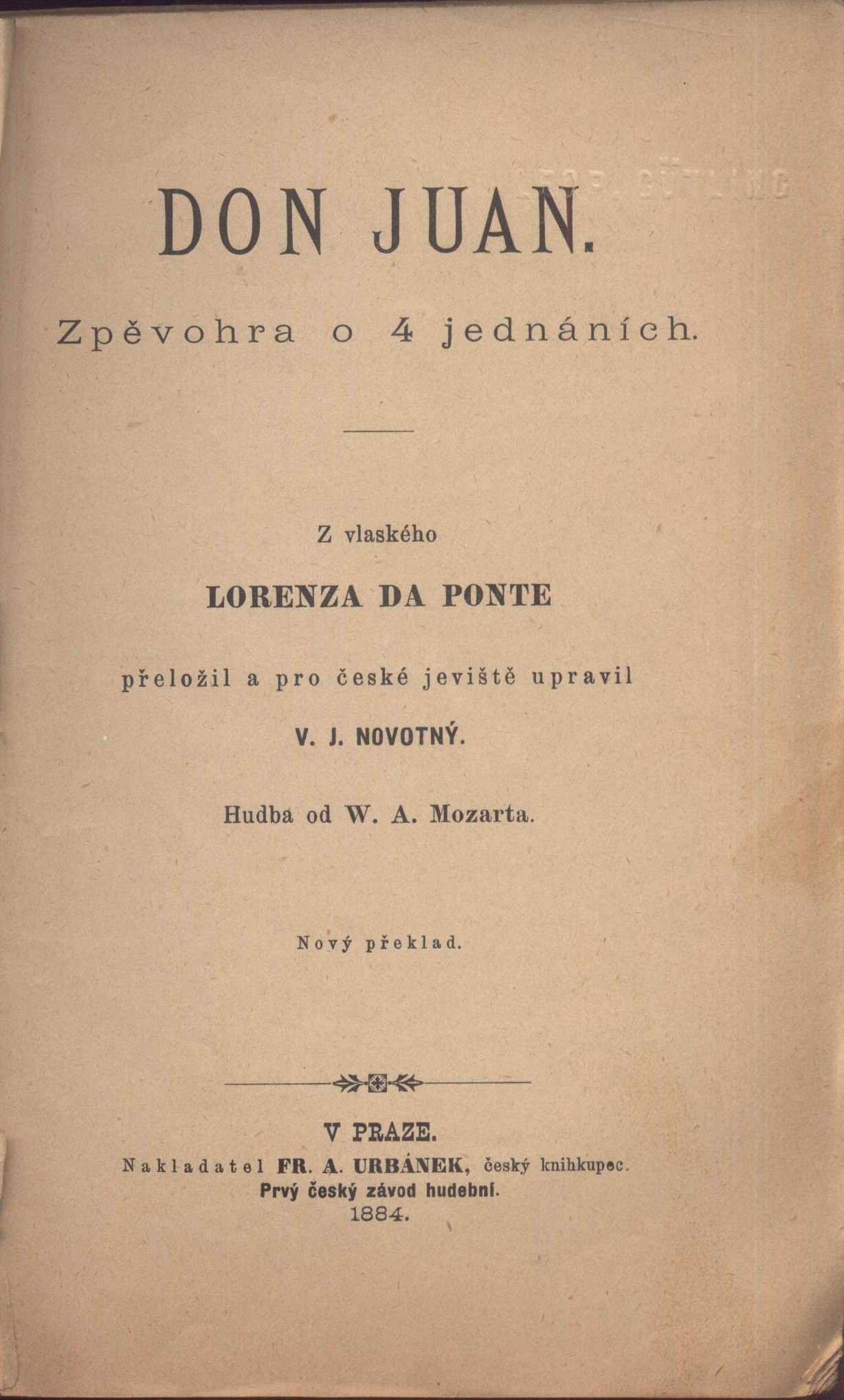 Názvové údaje Don Juan : zpěvohra o 4 jednáních / z vlaského Lorenza da Ponte přeložil a pro české jeviště upravil V.J. Novotný ; hudba od W.A. Mozarta Osobní jméno Da Ponte, Lorenzo, 1749-1838 (Autor) Další autoři Novotný, Václav Juda, 1849-1922 (Autor adaptace, upravovatel) (Překladatel) (Autor úvodu atd.) Mozart, Wolfgang Amadeus, 1756-1791 (Skladatel) Korp. Fr. A. Urbánek (nakladatelství) (Nakladatel, vydavatel) Alois R. Lauermann (nakladatelství, tiskárna, knihtiskárna, komisionářství) (Tiskař) Další var.názvy Zpěvohra o 4 jednáních Údaje o vydání Druhé vydání, nový překlad Nakladatel V Praze : Nakladatel Fr. A. Urbánek, český knihkupec, 1884 Výrobce V Praze : Alois R. Lauermann dříve Militký a Novák Rozsah 114 stran ; 18 cm ISBN (Brožováno) Edice Urbánkova Bibliotéka operních a operetních textův ; řada druhá, svazek 21.
