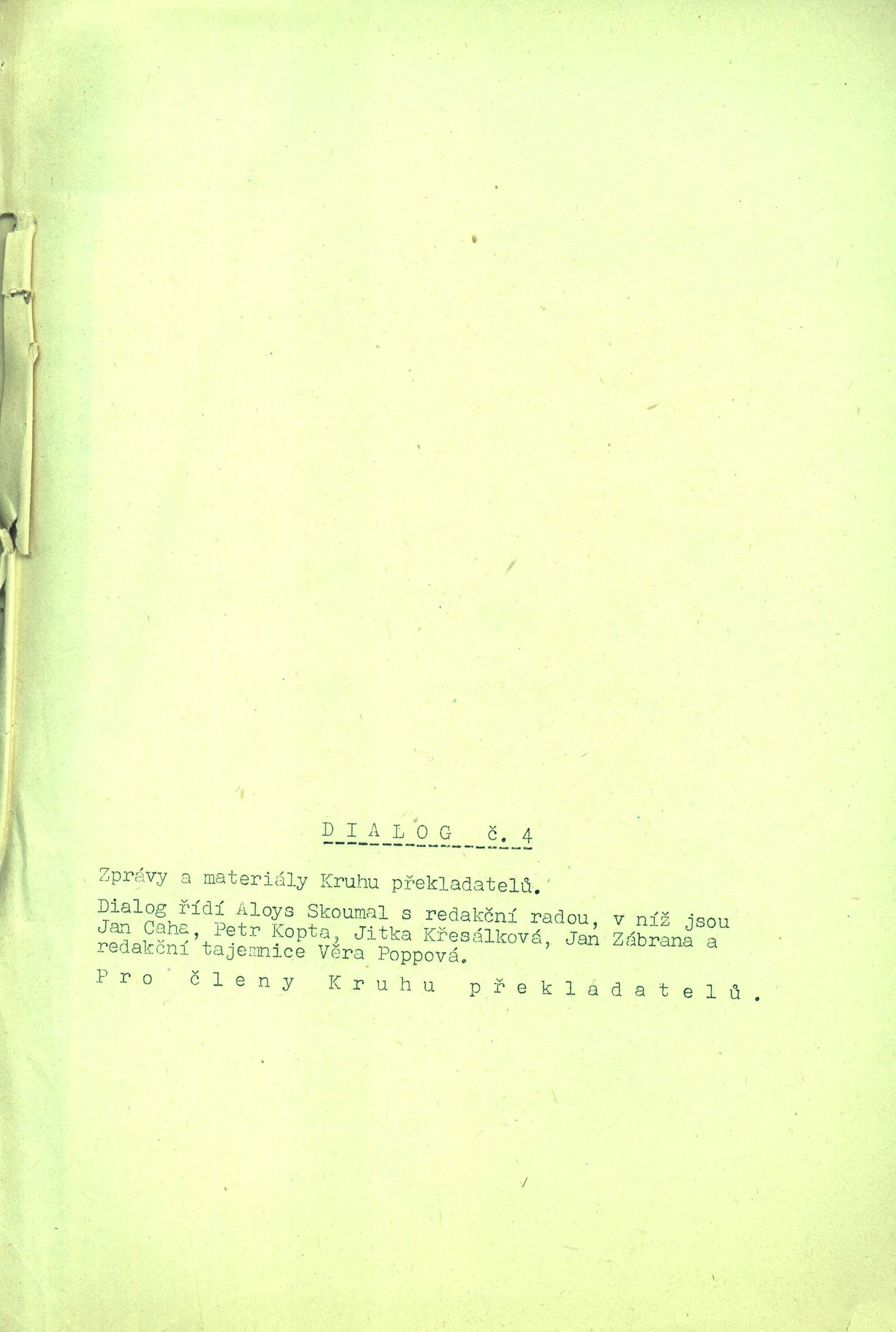 Názvové údaje Dialog : zprávy a materiály Kruhu překladatelů / řídí Aloys Skoumal s redakční radou Osobní jméno Skoumal, Aloys, 1904-1988 (Šéfredaktor, odpovědný redaktor) Další autoři Kruh překladatelů (profesní organizace) (Nakladatel, vydavatel) Roč., číslo Číslo 4, 1960 Nakladatel [Praha] : Kruh překladatelů, 1960 Rozsah 185 stran ; 30 cm Země vyd. Česko Jazyk dok. čeština Poznámky Strojopis. - Jednotlivé stati, články, zápisky, různé a poznámky. - Obsah.