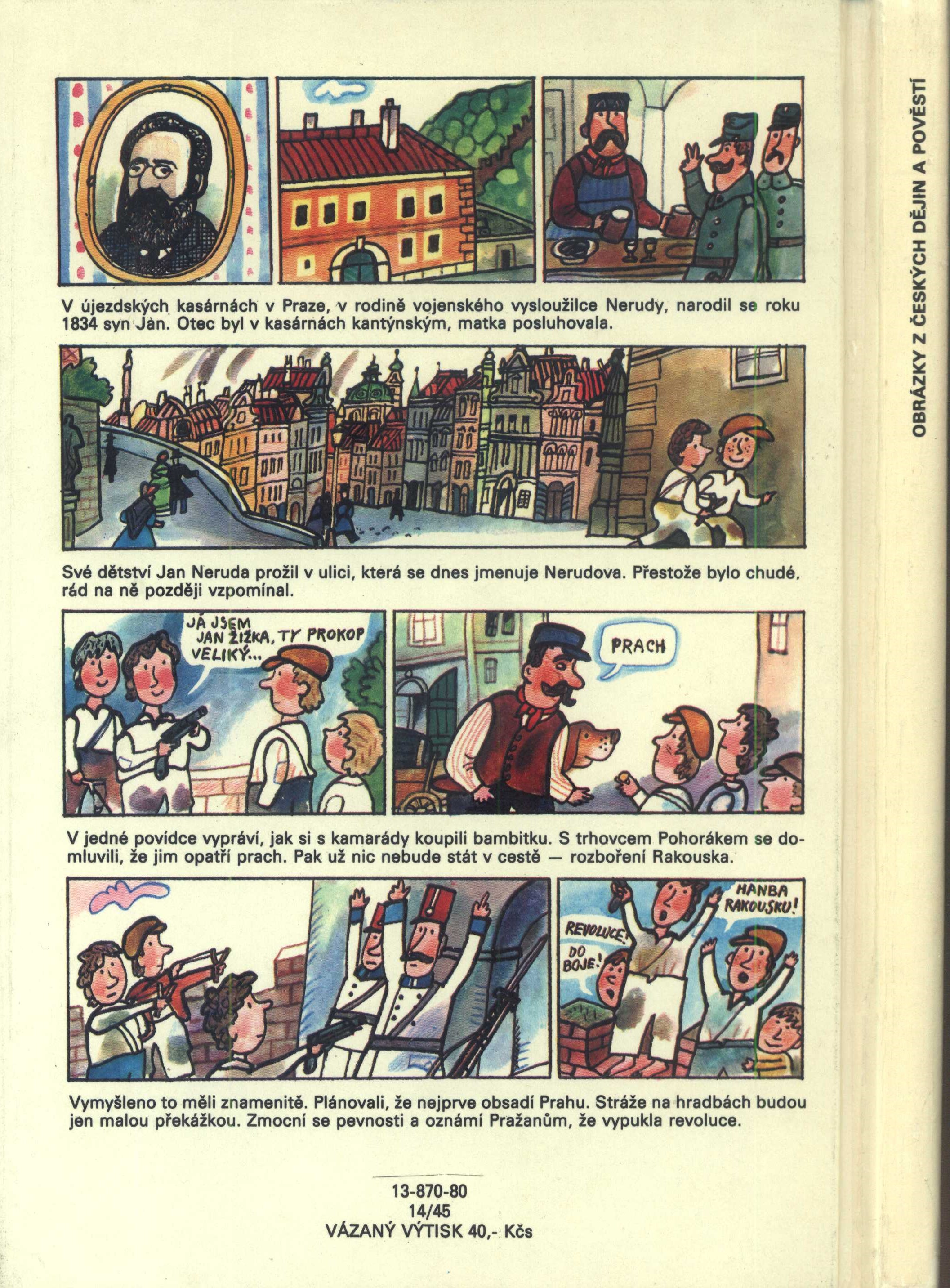 Anotace Knížka pro malé čtenáře vypráví obrázky a textem dějiny našeho národa od starých pověstí až po národní obrození a sociální uvědomování na sklonku minulého století. Druh dok. monografie Klíčová slova česká literatura * literatura pro děti a mládež * historie * české dějiny * české pověsti * Adla Z. * Černý J. * ilustrovaný komiks * ilustrace * Kalousek J. * r. 1980 MDT 821.162.3 * 821-93 * 82-32 * 82-34 * (084.1) * 94(437.31) Adr. el. zdr. http://krameriusndk.nkp.cz/search/handle/uuid:170931b0-c1c7-11e6-bd3b-005056827e52 Uživatelské pole PNP Knihovna V. Zinkové. U sign. VZinková 0807 (vázaný výtisk) barevnou ilustrací zdobená vazba (na kartonu papírový polep, lakováno). - Ilustrované předsádky. - Rozložená titulní dvoustrana s barevnou ilustrací (s. 8-9). - Od s. 12 barevně ilustrovaný komiks s textem. - Rozložená tiráž s barevnou ilustrací. - Ukázka na zadní straně vazby. Rozsah: 151, [1] s. Rozměr: 24,5 cm. Signatura Přír.číslo Lokace Info VZinková 0807 2206/2019 Sbírka