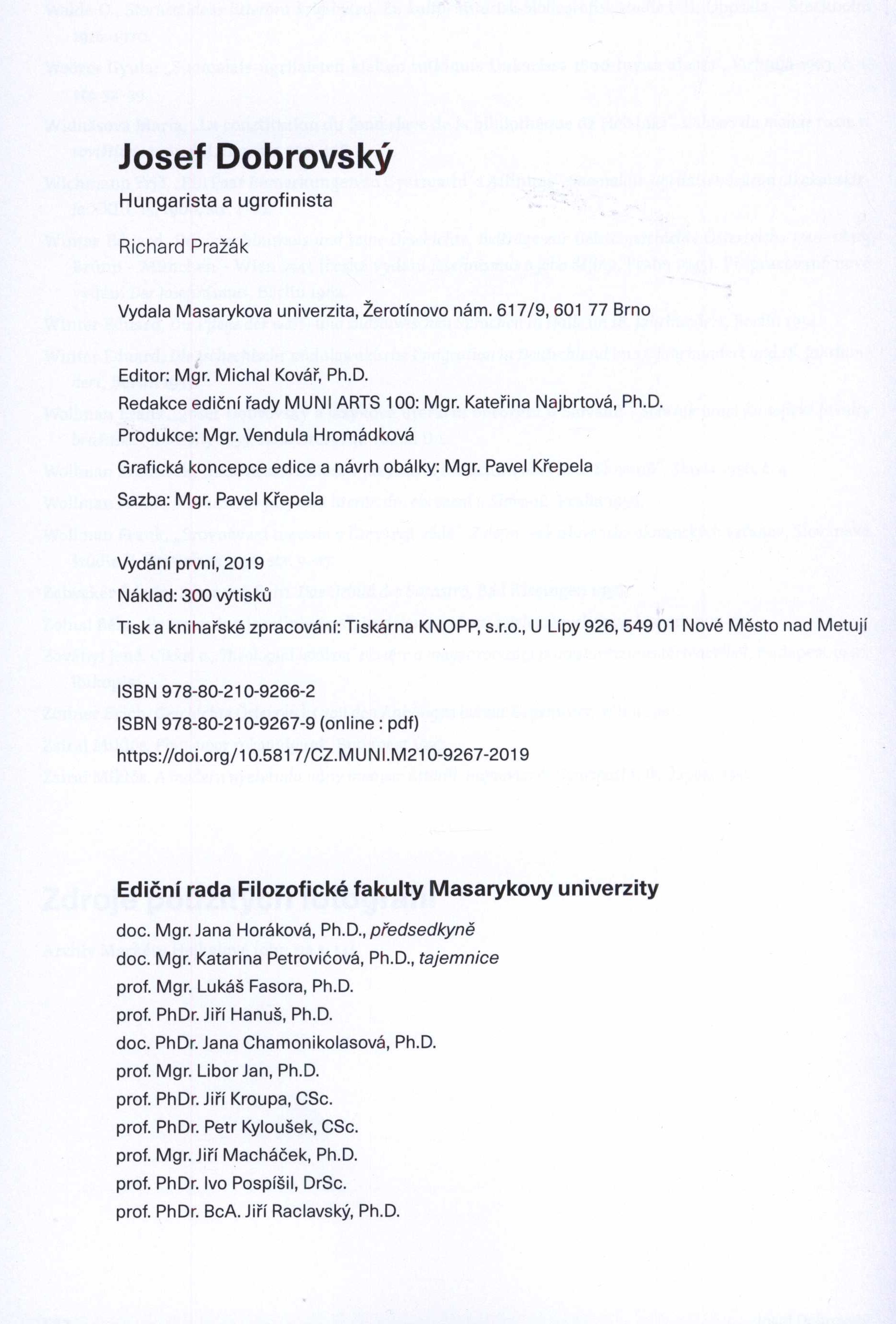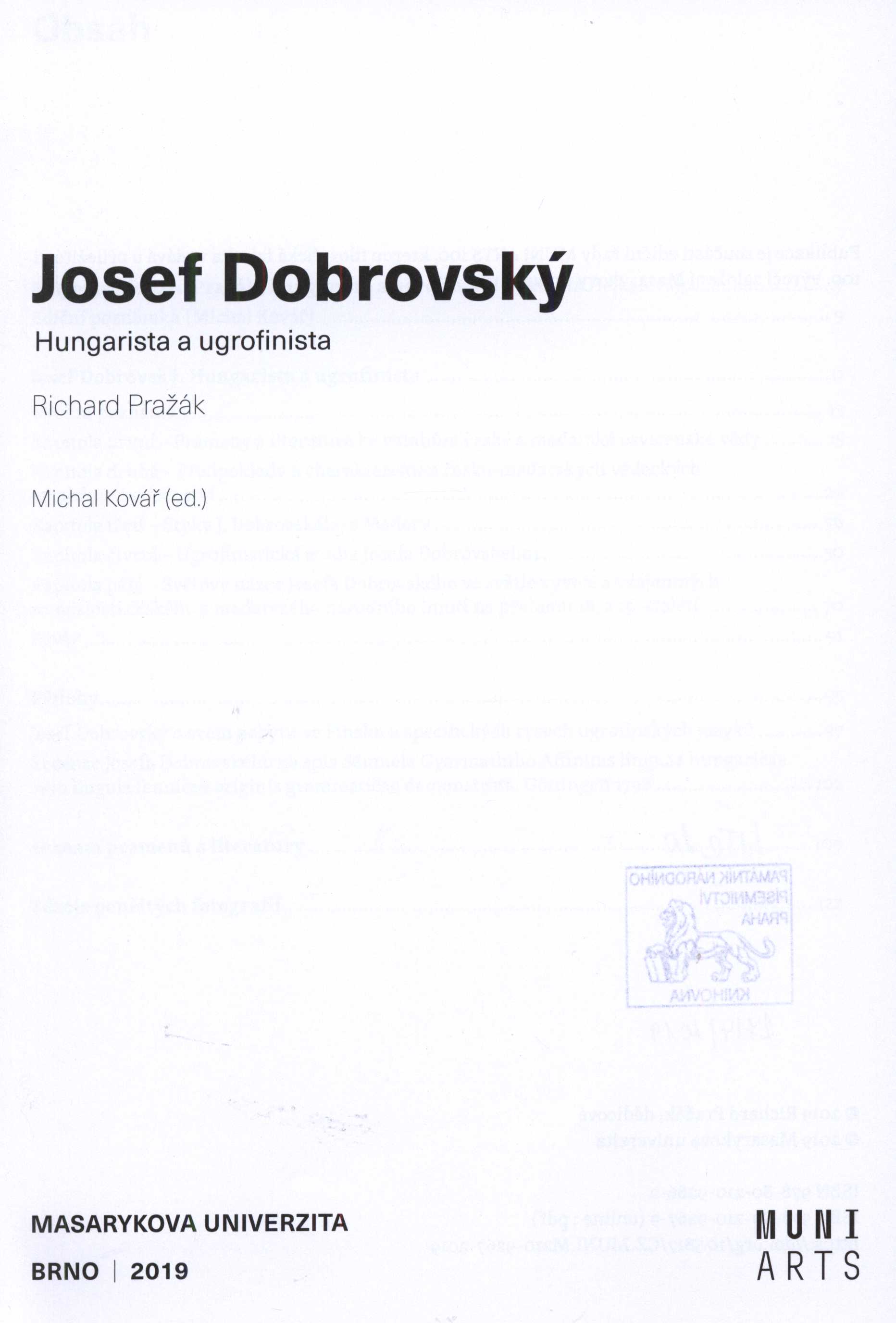 1. Názvové údajeJosef Dobrovský : hungarista a ugrofinista / Richard Pražák ; Michal Kovář (ed.) ; grafická koncepce edice a návrh obálky Pavel Křepela