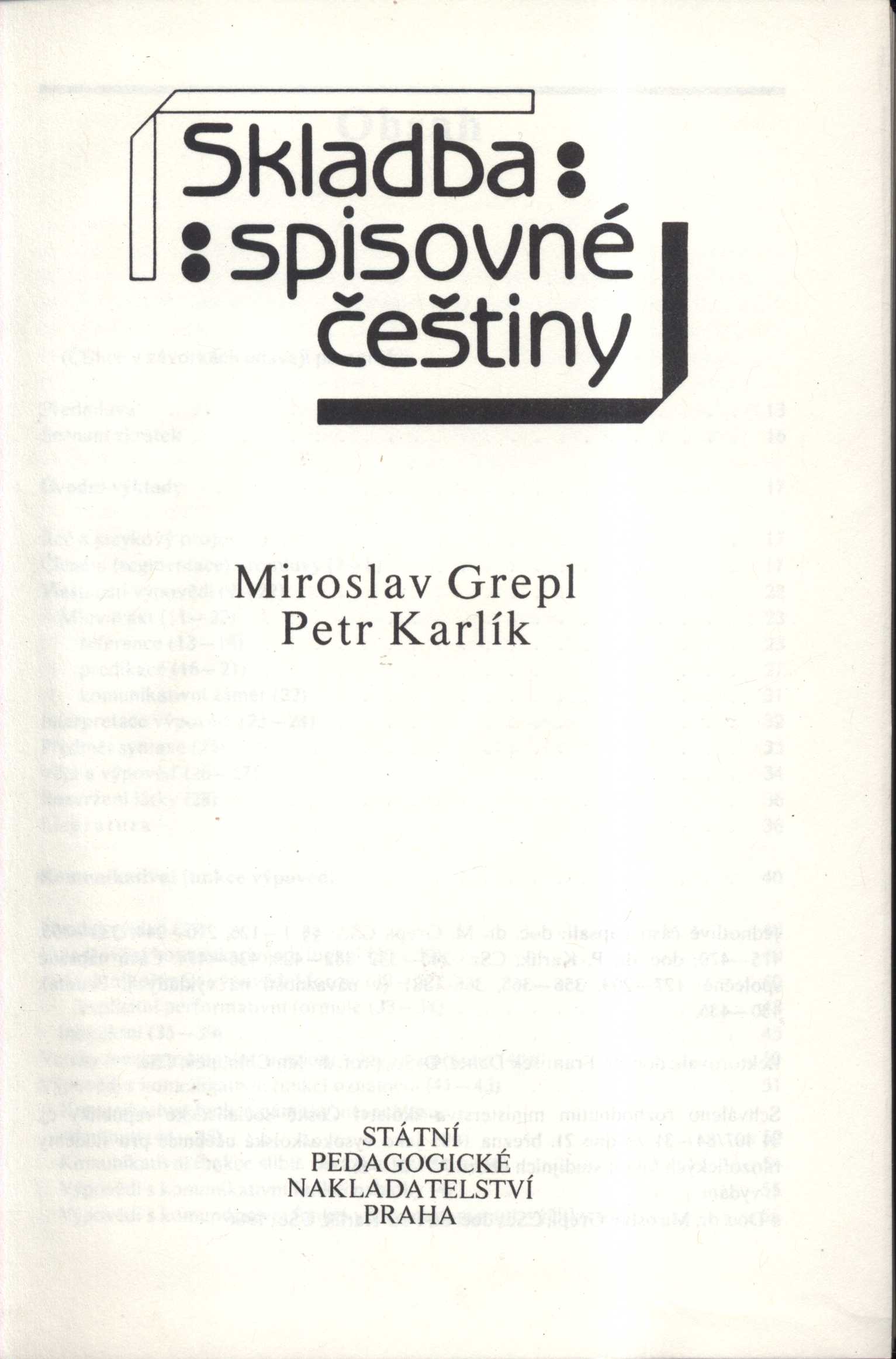 Názvové údaje Skladba spisovné češtiny / Miroslav Grepl, Petr Karlík Osobní jméno Grepl, Miroslav, 1929-2021 (Autor) Další autoři Karlík, Petr, 1951- (Autor) Korp. Státní pedagogické nakladatelství (Nakladatel, vydavatel) Tiskařské závody, n.p. (Tiskař) Údaje o vydání 1. vydání Nakladatel Praha : Státní pedagogické nakladatelství, 1986 Výrobce Praha : Tiskařské závody Rozsah 474 stran ; 20 cm ISBN (Vázáno) Edice Učebnice pro vysoké školy, (Státní pedagogické nakladatelství)