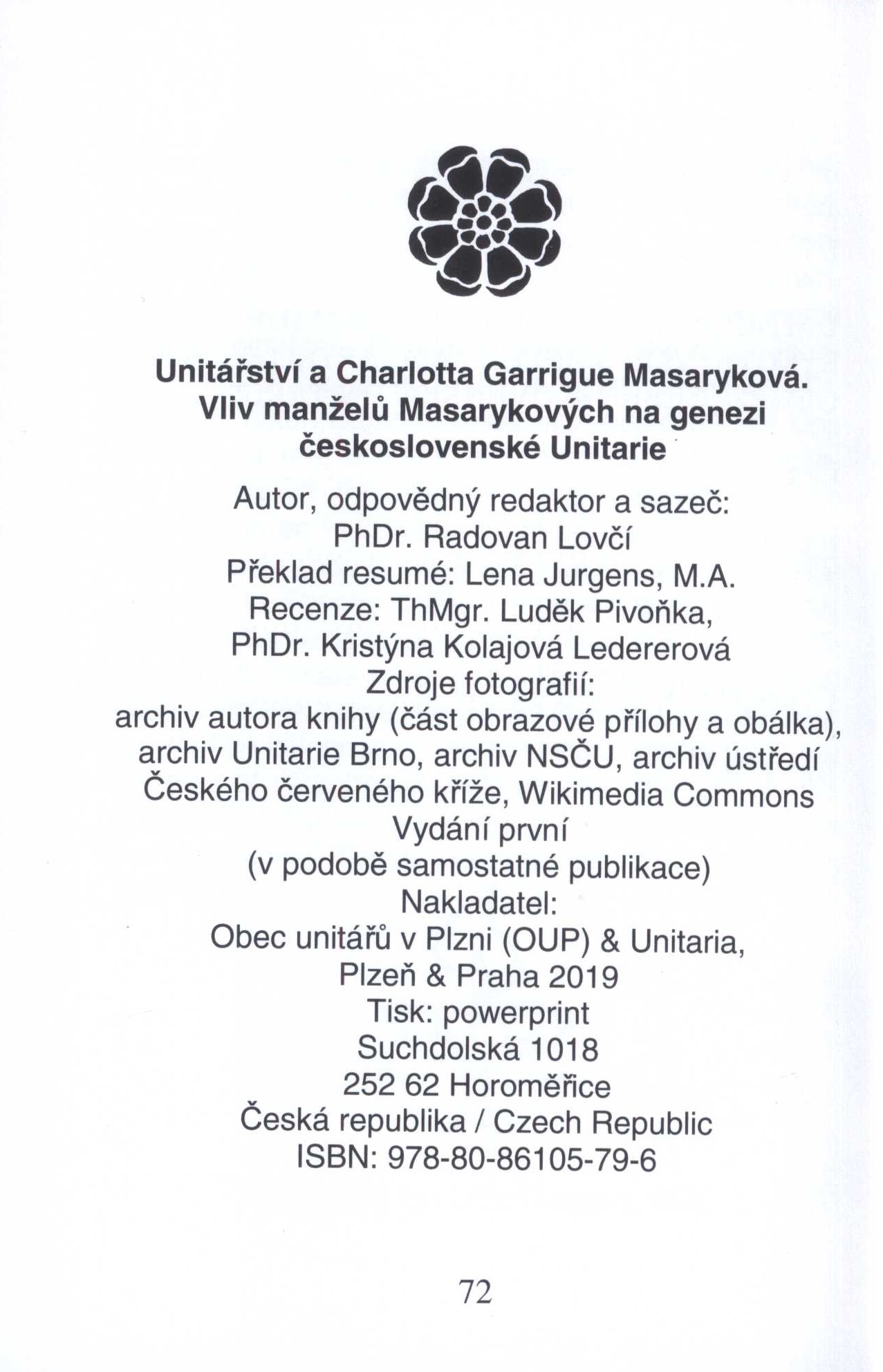 Názvové údaje Unitářství a Charlotta Garrigue Masaryková : vliv manželů Masarykových na genezi československé Unitarie / Radovan Lovčí ; překlad resumé: Lena Jurgens Osobní jméno Lovčí, Radovan, 1977- (Autor) (Autor úvodu atd.) (Redaktor, výkonný redaktor) (Sazeč) Další autoři Jurgens, Lena (Překladatel) Korp. Unitáři. Obec unitářů v Plzni (Nakladatel, vydavatel) Powerprint (firma) (Tiskař) Údaje o vydání Vydání první (v podobě samostatné publikace) Nakladatel V Plzni : Obec unitářů (OUP) v nakladatelství Unitaria, 2019 Rozsah 72 stran : ilustrace, portréty ; 19 cm ISBN 978-80-86105-79-6 (vázáno) Země vyd. Česko Jazyk dok. čeština Poznámky Oranžová vazba s tónovaným portrétem, dvoubarevný text. - Na rubu titulního listu vydavatel, drobná černobílá ilustrace a copyrighty. - Úvod autora. - Knižní podoba přednášky. - Drobné černobílé ilustrace. - Obrazový doprovod (černobílé fotografie, portréty s popisky). - Obsah. - Anotace knihy na zadní straně vazby.