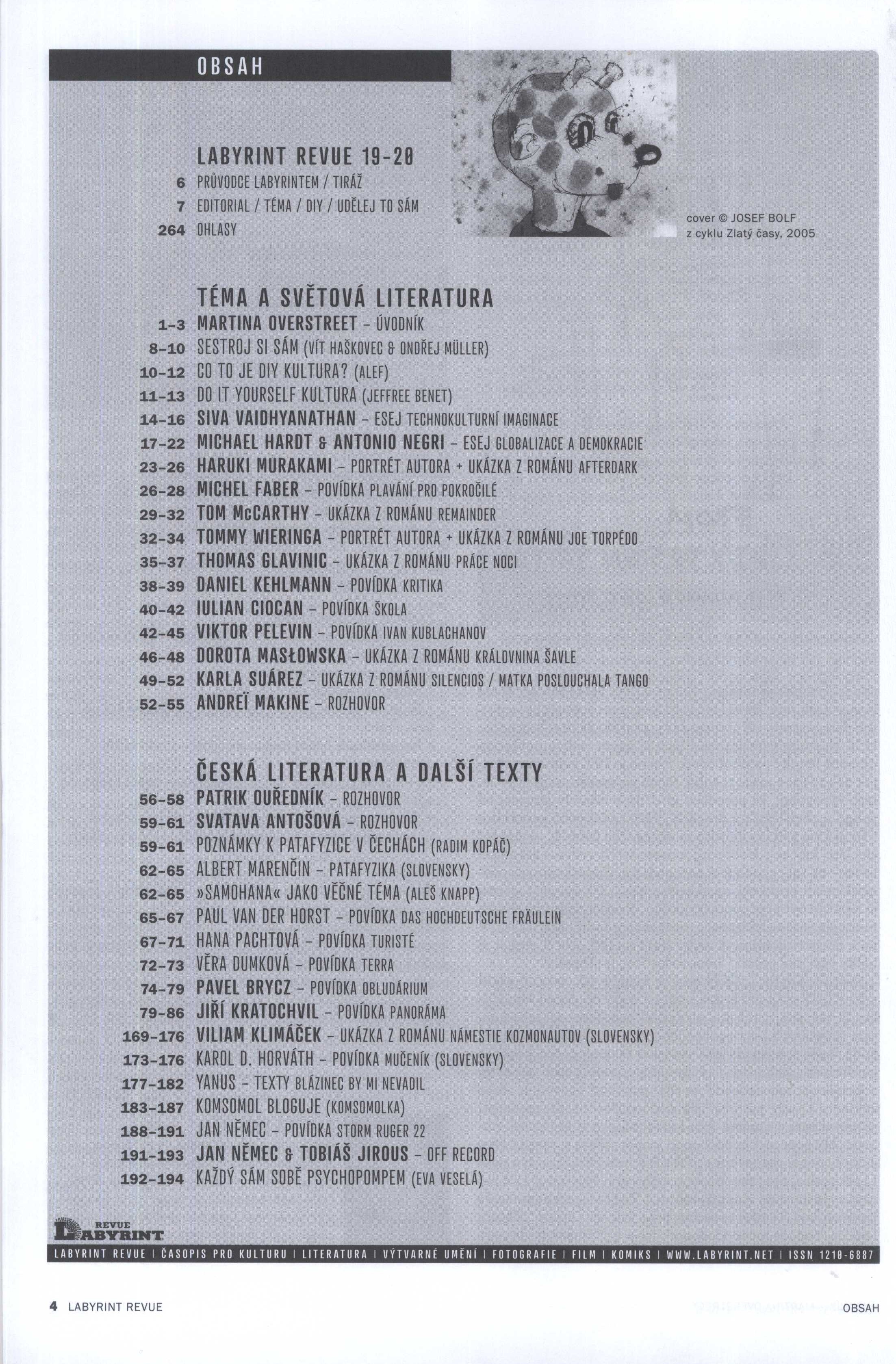 Názvové údaje Labyrint revue : časopis pro kulturu. DIY - Udělej to sám Další autoři Dvořák, Joachim, 1966- (Šéfredaktor, odpovědný redaktor) Korp. Labyrint (nakladatelství) (Nakladatel, vydavatel) Roč., číslo Číslo 19-20, 2006 Nakladatel Praha : Labyrint - Via Vestra, 2006 Výrobce M.I.B. Production Service Rozsah 304 stran : ilustrace, fotografie, portréty ; 29 cm ISSN 1210-6887 Země vyd. Česko Jazyk dok. čeština Poznámky Černobílé a barevné ilustrace, fotografie a portréty