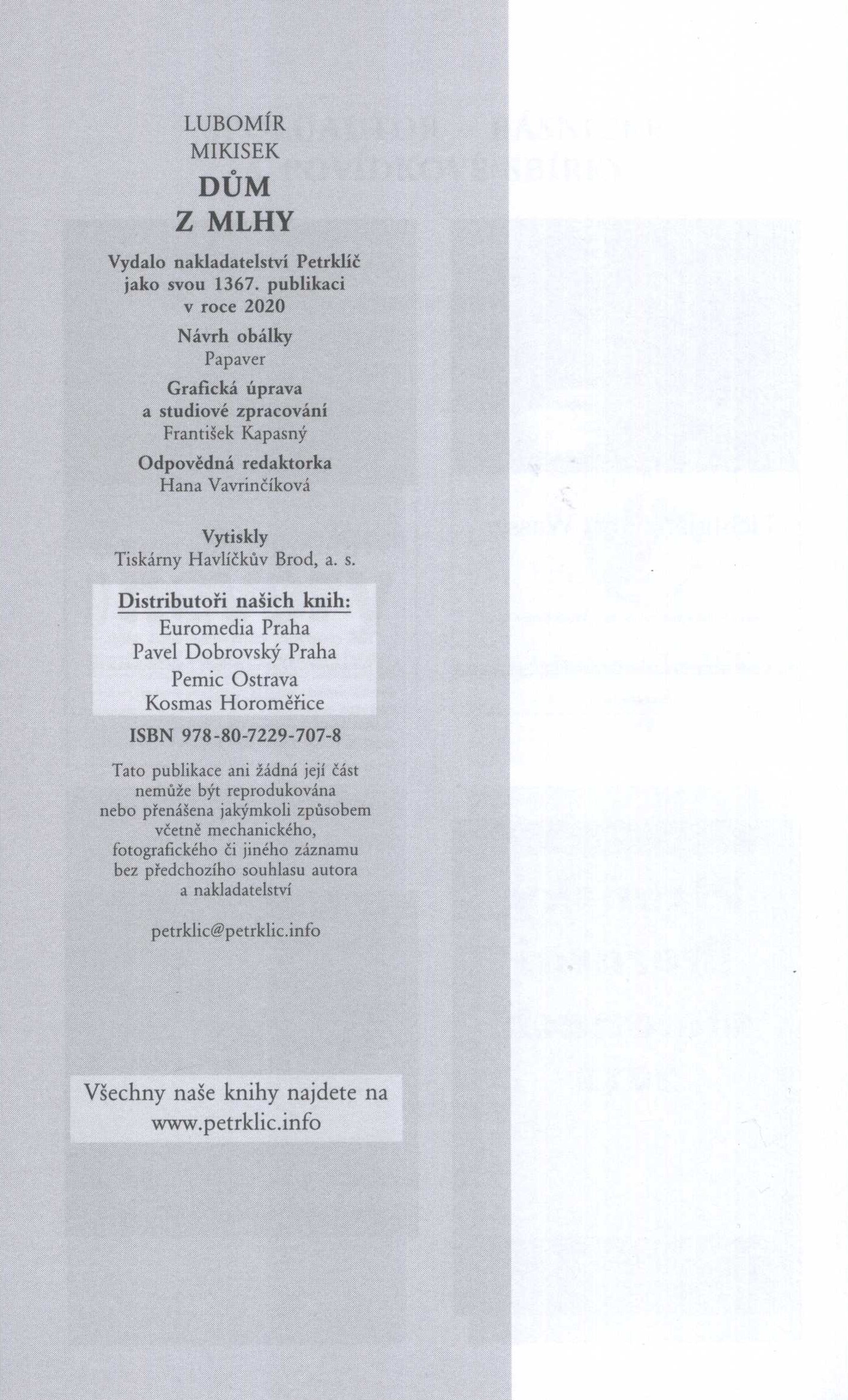 Názvové údaje Dům z mlhy / Lubomír Mikisek ; grafická úprava a studiové zpracování František Kapasný Osobní jméno Mikisek, Lubomír, 1950- (Autor) Další autoři Kapasný, František, 1959- (Knižní grafik) (Jiná role) Korp. Nakladatelství Petrklíč (Nakladatel, vydavatel) Tiskárny Havlíčkův Brod (firma) (Tiskař) Nakladatel [Praha] : Petrklíč, 2020 Výrobce Havlíčkův Brod : Tiskárny Havlíčkův Brod, a.s. Rozsah 154 stran ; 21 cm ISBN 978-80-7229-707-8 (brožováno) Země vyd. Česko Jazyk dok. čeština Poznámky Obálka s černobílou fotografií, černý text, nakladatelská značka (i na hřbetu). - Patitul. - Nakladatelská značka na titulním listu. - Poděkování. - Obsah. - Upoutávky na další knihy autora. - Anotace knihy, černobílé foto autora a jeho stručná biografie a bibliografie na zadní straně obálky.
