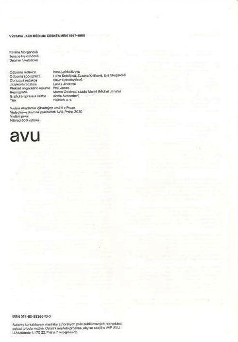 Názvové údaje Výstava jako médium : české umění 1957 - 1999 / Pavlína Morganová, Terezie Nekvindová, Dagmar Svatošová ; grafická úprava a sazba Adéla Svobodová Osobní jméno Morganová, Pavlína, 1974- (Autor) (Autor úvodu atd.) Další autoři Nekvindová, Terezie, 1980- (Autor) (Autor úvodu atd.) Svatošová, Dagmar, 1974- (Autor) (Autor úvodu atd.) Svobodová, Adéla, 1978- (Knižní grafik) (Sazeč) Korp. Akademie výtvarných umění v Praze. Vědecko-výzkumné pracoviště (Nakladatel, vydavatel) Tiskárna Helbich (Tiskař) Údaje o vydání Vydání 1. Nakladatel Praha : Akademie výtvarných umění. Vědecko-výzkumné pracoviště AVU, 2020 Výrobce [Brno] : Helbich, a.s. Rozsah 1035 stran : ilustrace, faksimile ; 31 cm ISBN 978-80-88366-13-3 (vázáno) Země vyd. Česko Jazyk dok. čeština Poznámky Žlutá plátěná vazba s černým textem (i na hřbetu a zadní straně). - Modrý drobný text na předsádkách. - Obsah. - Předmluva autorek. - Úvodní studie (drobné černobílé a barevné fotografie, ilustrace, faksimile s popisky). - Archiv výstav (černobílé a barevné fotografie, faksimile s popisky). - Text a dokumentace na straně 782-996 na křídovém papíře. - Ediční poznámka.