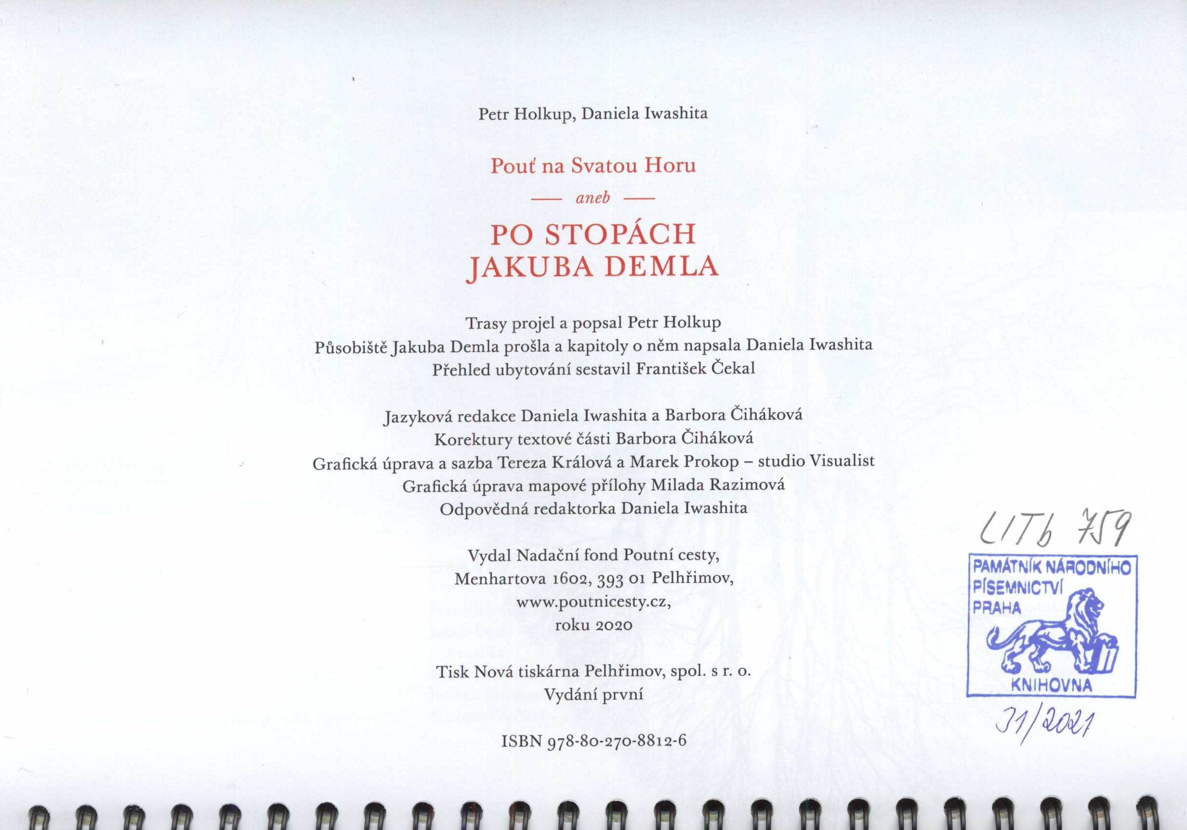 Názvové údaje Pouť na Svatou Horu, aneb, Po stopách Jakuba Demla / Petr Holkup, Daniela Iwashita ; grafická úprava a sazba Tereza Králová a Marek Prokop - studio Visualist ; grafická úprava mapové části Milada Razimová Osobní jméno Holkup, Petr, 1974- (Autor) Další autoři Iwashita, Daniela, 1971- (Autor) Králová, Tereza, 1983- (Knižní grafik) (Sazeč) Prokop, Marek (Knižní grafik) (Sazeč) Razimová, Milada (Knižní grafik) Korp. Nadační fond Poutní cesty (Nakladatel, vydavatel) Nová tiskárna Pelhřimov (tiskárna) (Herec) Údaje o vydání Vydání první Nakladatel Pelhřimov : Nadační fond Poutní cesty, 2020 Výrobce Nová tiskárna Pelhřimov, spol. s r. o. Rozsah 173 stran ; ilustrace (převážně barevné), portréty, faksimile, mapy ; 21 cm ISBN 978-80-270-8812-6 (kroužková vazba) Země vyd. Česko Jazyk dok. čeština Poznámky Název z obálky. - Zdobená barevná obálka. - Hlavní trasa. - Alternativní trasa. - Barevné, tónované a černobílé fotografie, portréty, drobné ilustrace a faksimile. - Mapová příloha. - Přehled ubytování. - Poděkování. - Autoři textů, fotografií a vyobrazení. - Obsahuje bibliografie. - Tištěno napříč.