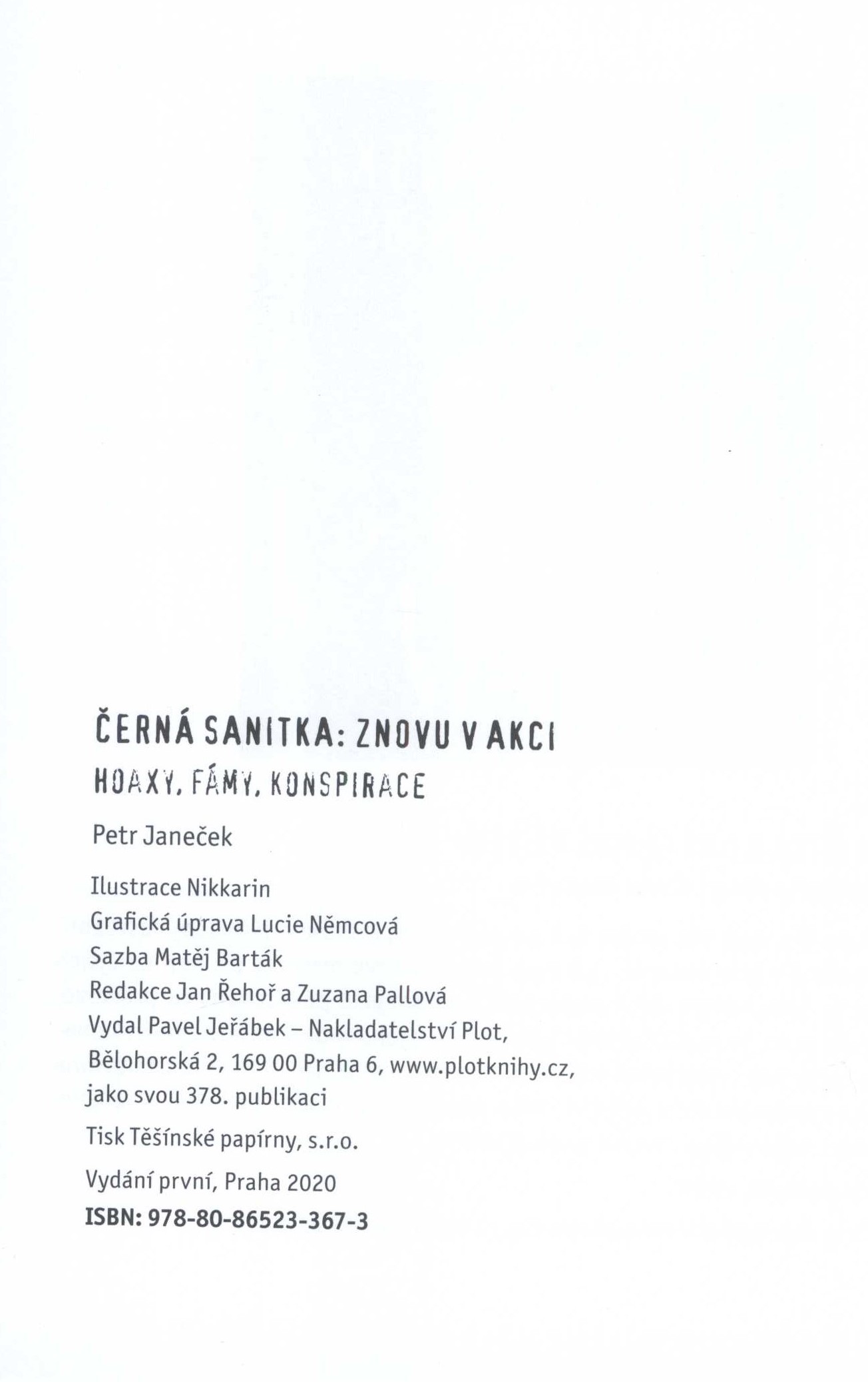 Názvové údaje Černá sanitka: znovu v akci : hoaxy, fámy, konspirace / Petr Janeček ; ilustrace Nikkarin ; grafická úprava Lucie Němcová Osobní jméno Janeček, Petr, 1978- (Autor) (Autor úvodu atd.) Další autoři Nikkarin, 1987- (Ilustrátor) Němcová, Lucie, 1975- (Knižní grafik) Korp. Nakladatelství Plot (Nakladatel, vydavatel) Těšínské papírny, s.r.o. (tiskárna) (Tiskař) Údaje o vydání Vydání první Nakladatel Praha : Pavel Jeřábek - nakladatelství Plot, 2020 Výrobce Český Těšín : Těšínské papírny, s.r.o. Rozsah 262 stran : ilustrace ; 19 cm ISBN 978-80-7428-367-3 (vázáno) Země vyd. Česko Jazyk dok. čeština Poznámky Černá vazba s barevnou ilustrací, barevný text. - Obsah. - Úvod autora. - Černobílé celostránkové ilustrace. - O autorovi a ilustrátorovi. - Texty. - Upoutávka a anotace knihy. - Anotace knihy na zadní straně vazby.