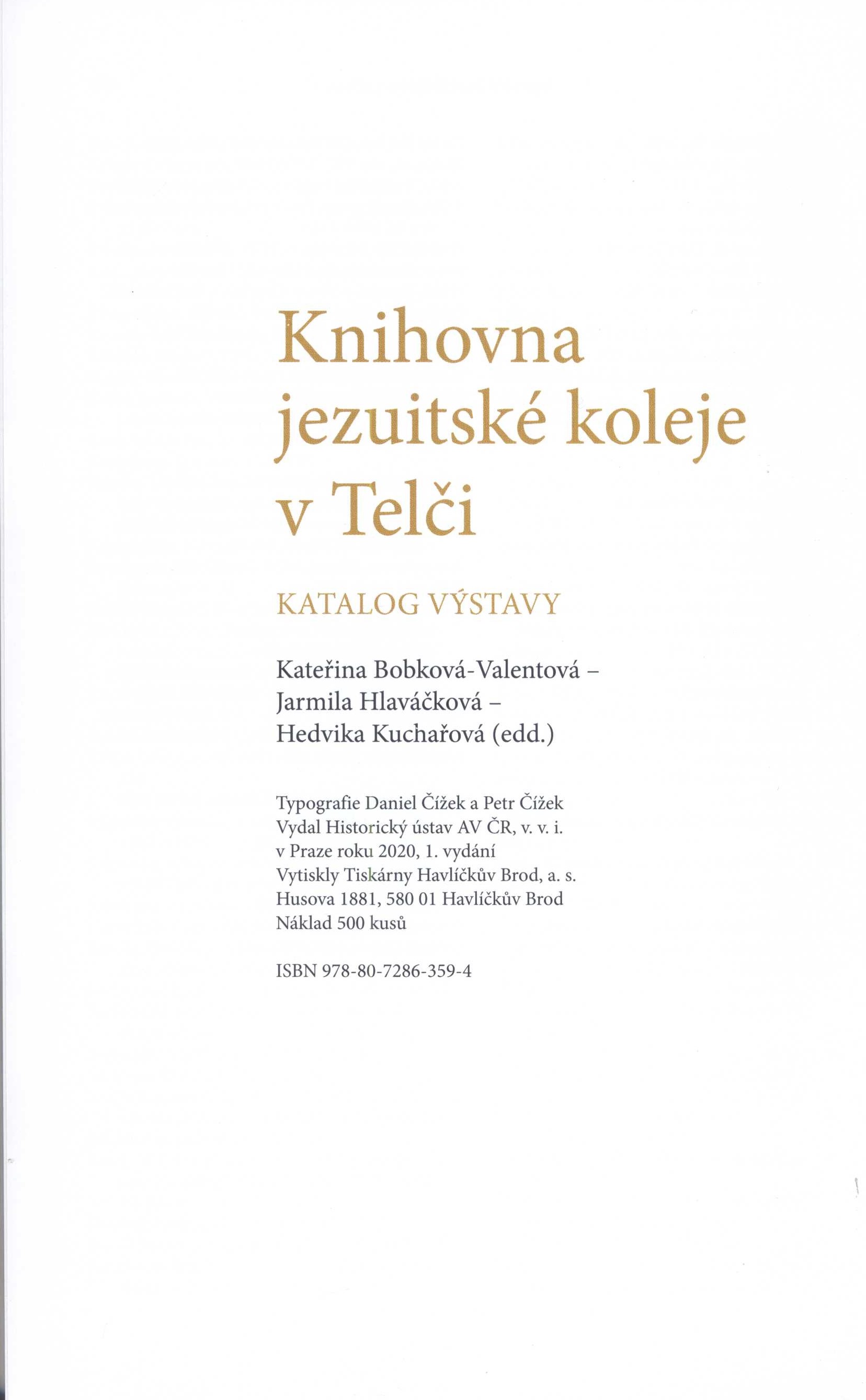 Názvové údaje Knihovna jezuitské koleje v Telči : katalog výstavy / Kateřina Bobková-Valentová, Jarmila Hlaváčková, Hedvika Kuchařová (edd.) Další autoři Valentová, Kateřina, 1971- (Editor) Hlaváčková, Jarmila (Editor) Kuchařová, Hedvika, 1971- (Editor) Čížek, Petr, 1971- (Typograf) Čížek, Daniel (Typograf) Korp. Historický ústav AV ČR (Nakladatel, vydavatel) Ústav teoretické a aplikované mechaniky (Akademie věd ČR) (Výzkumník) Národní památkový ústav (Výzkumník) Klášter premonstrátů (Nová Říše, Česko). Knihovna (Organizátor akce) Tiskárny Havlíčkův Brod (firma) (Tiskař) Další var.názvy Katalog výstavy Údaje o vydání 1. vydání Nakladatel Praha : Historický ústav, 2020 Výrobce Havlíčkův Brod : Tiskárny Havlíčkův Brod, a. s. Rozsah 171 stran : ilustrace (převážně barevné), plány, faksimile ; 23 cm ISBN 978-80-7286-359-4 (brožováno) Země vyd. Česko Jazyk dok. čeština Poznámky Na obálce pod názvem: Historický ústav AV ČR, Ústav teoretické a aplikované mechaniky AV ČR, Národní památkový ústav