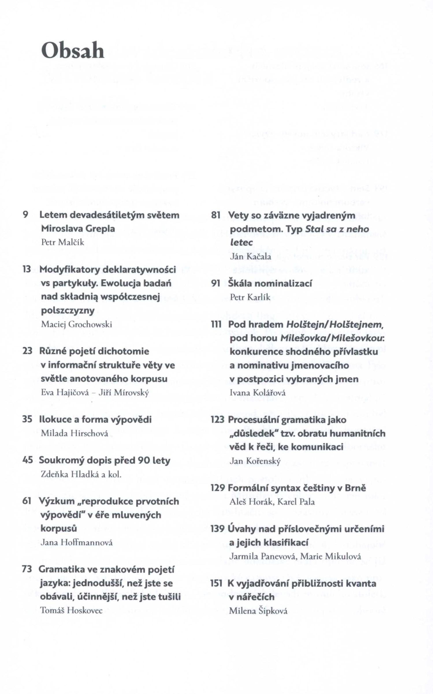 Anotace Jako pocta svému kolegovi a učiteli pak vznikl festschrift k 90. narozeninám M. Grepla Svět podle Grepla, do něhož přispělo 20 jazykovědců našich i zahraničních, reprezentujících různé generace, ale sdílejících Greplovo vědecké krédo. Festschrift obsahuje Greplovu bibliografii z let 2011–2016. Jazyková pozn. Částečně polský, slovenský a slovinský text Druh dok. monografie Poznámky o skryté bibliografii a rejstřících Obsahuje bibliografie a bibliografické odkazy Osobní hesla Grepl, Miroslav, 1929-2021 - lingvista, vysokoškolský pedagog, bohemista Chronologie 1929-2019 Předmětová hesla linguists - Czechia - 20th-21st centuries * linguistics * syntax * grammar * semantics Klíčová slova česká literatura * jubilejní publikace * sborník * sémantika * lingvistika * mluvnice * syntax * lingvisté * Grepl M. * Brno * Česko * stol. 20.-21. Žánr/forma jubilee books * papers of several authors MDT 81`367 * 81`36 * 8 * 81`37 * 821.162.3 * 81'1-051 * 81'1 * 81'367 * 81'36 * 81'37 * (437.3) * (082.2) * (082) Signatura Přír.číslo Lokace Info LITb 01774 0389/2023 Fond