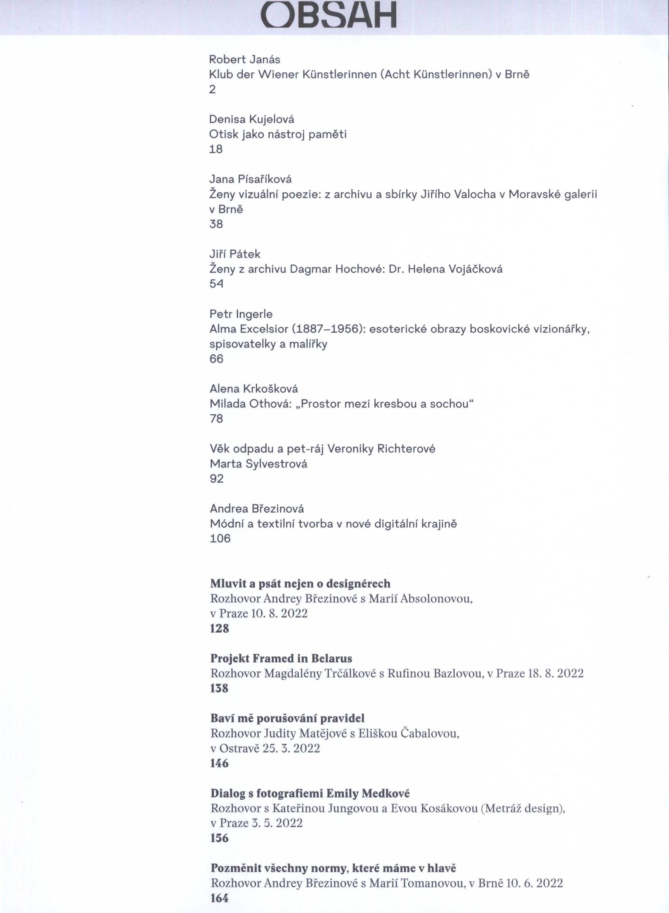 Názvové údaje Bulletin Moravské galerie v Brně. Ženy v umění a designu Další autoři Press, Jan, 1976- (Šéfredaktor, odpovědný redaktor) Kijonka, Lukáš, 1981- (Knižní grafik) Krůl, Michal, 1981- (Knižní grafik) Korp. Profitisk (tiskárna) (Tiskař) Roč., číslo Číslo 85, 2022 Nakladatel Brno : Moravská galerie v Brně, 2022 Výrobce Profi-tisk group s.r.o. Rozsah 172 stran : fotografie, portréty, faksimile ; 26 cm ISBN (Brožováno) ISSN 0231-5793 Země vyd. Česko Jazyk dok. čeština Poznámky Název části z obálky. - Převážně barevné fotografie, portréty a faksimile. - Resumé anglicky. - 250 výtisků