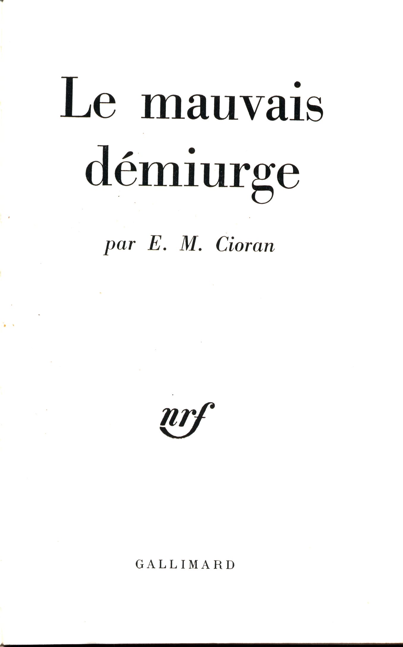 Názvové údaje Le mauvais démiurge / par E. M. Cioran Osobní jméno Cioran, Emil, 1911-1995 (Autor) Další autoři Gallimard (firma) (Nakladatel, vydavatel) Firmin-Didot (firma) (Tiskař) Nakladatel [Paris] : Gallimard, 1969 Výrobce Paris ; Mesnil ; Ivry : Firmin-Didot Rozsah 181 stran ; 19 cm ISBN (vázáno) Edice Les essais ; 147