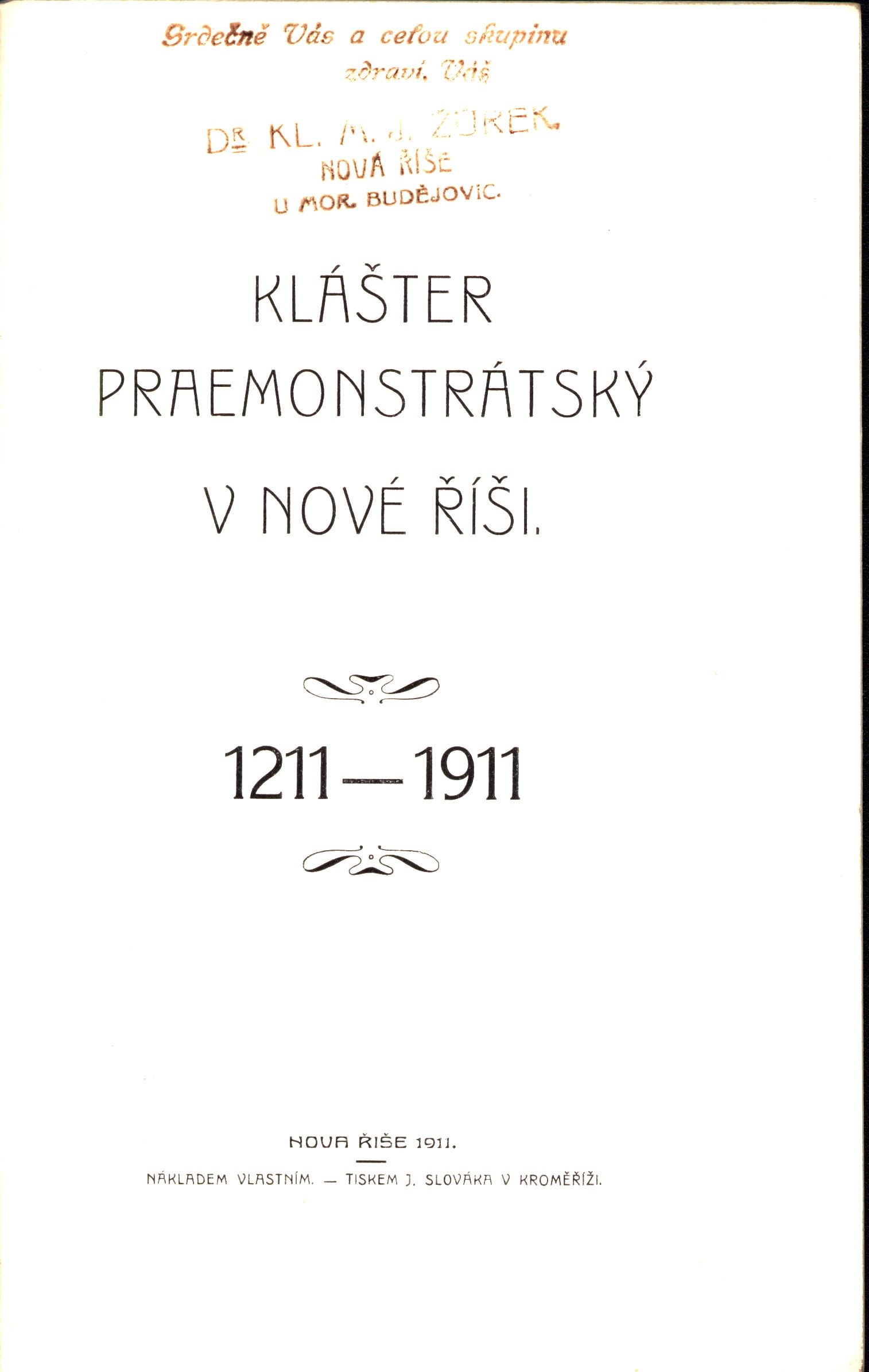 1. Názvové údajeKlášter praemonstrátský v Nové Říši : 1211-1911