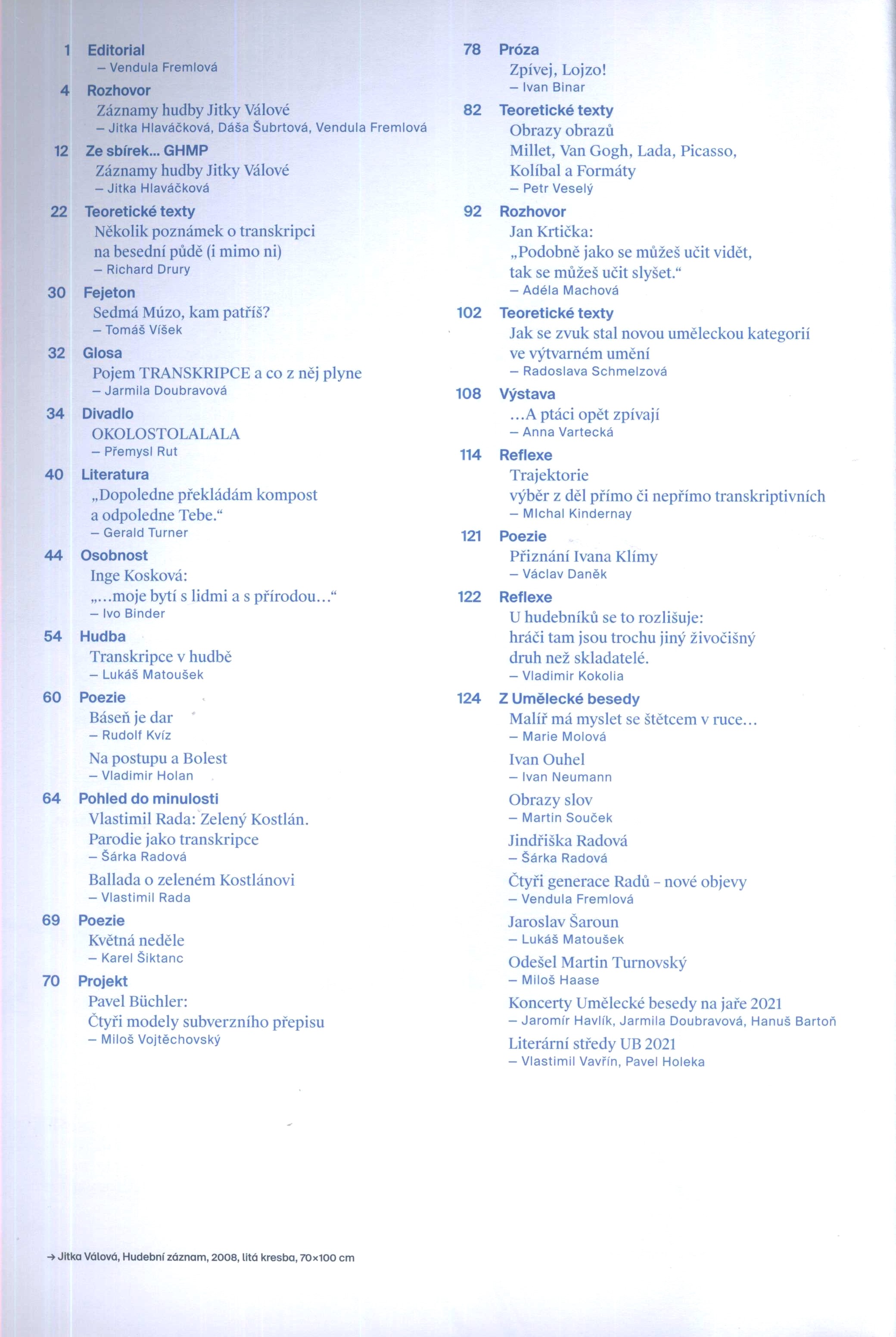 Poznámka o dalších původcích Šéfredaktorka Vendula Fremlová Redakční rada: Vlastimil Vavřín (předseda), Ivo Binder, Jarmila Doubravová, Richard Drury, Miloš Haase, Pavel Holeka, Lukáš Matoušek, Šárka Radová, Anna Vartecká, Tomáš Víšek Grafická úprava Marek Fanta Druh dok. PERIODIKA - Svázaný ročník periodika Rozlišovací název Transkripce Periodicita 2x ročně Nadřízená jednotka Život Osobní hesla Válová, Jitka, 1922-2011 - malířka * Kosková, Inge, 1940- - malířka, kreslířka, pedagožka * Ouhel, Ivan, 1945-2021 - malíř, grafik, kreslíř a pedagog * Suchý, Jiří, 1931 říjen 1.- - textař, zpěvák, autor pásem a her, divadelník, básník, spisovatel, skladatel, výtvarník a grafik Klíčová slova česká literatura * česká próza * česká poezie * výtvarné umění * výtvarní umělci * transkripce * hudba * hudební život * hudebníci * r. 2022 * revue MDT 72/76 * 72/76-051 * 78-051 * 821.162.3 * 821.162.3-3 * 821.162.3-1 * 730 * 73-051 * 73.04 Signatura Přír.číslo Lokace Info LITc 0822 0216/2025 Sbírka