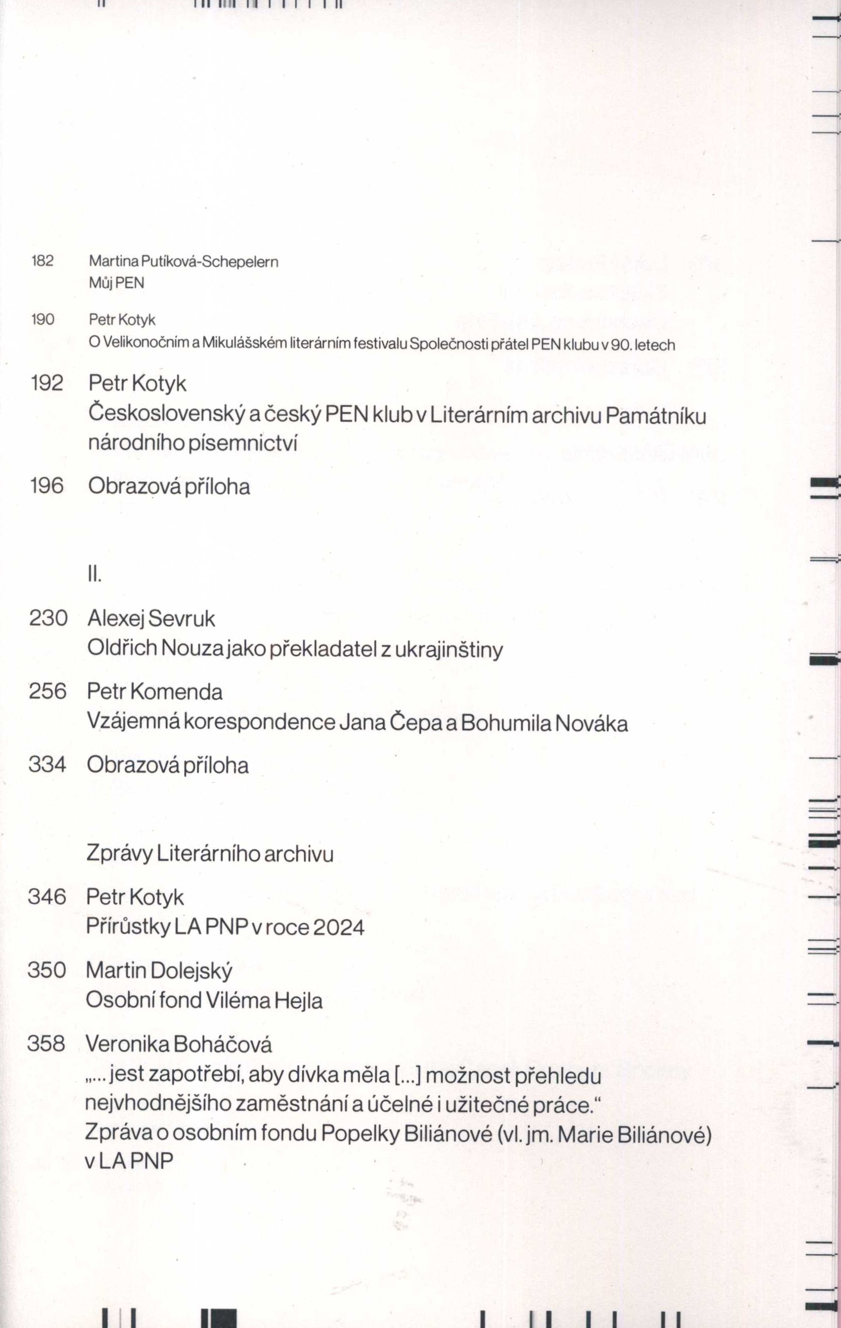 Názvové údaje Literární archiv : sborník Památníku národního písemnictví = Jahrbuch des Museums der tschechischen Literatur = Annual of the Museum of Czech Literature = Almanach du Musée de la littérature tchèque. PEN klub a jeho autoři Další autoři Krásenská, Klára, 1995- (Editor) (Šéfredaktor, odpovědný redaktor) Albert, Gwendolyn, 1967- (Překladatel) Korp. Památník národního písemnictví (muzeum literatury) (Nakladatel, vydavatel) Indigoprint (tiskárna) (Tiskař) Roč., číslo 57, 2025 Údaje o vydání Vydání první Nakladatel Praha : Památník národního písemnictví, 2025 Výrobce Indigoprint Rozsah 396 stran : ilustrace, portréty, faksimile ; 23 cm ISBN 978-80-88503-54-5 (v knize neuvedeno ; brožováno) ISSN 0231-5904 Země vyd. Česko Jazyk dok. čeština Poznámky Růžová typografická obálka se slepotiskem. - Zdobená ořízka. - Čb. i barevné ilustrace, fotografie, portréty a faksimile. - Seznam autorů. - 300 výtisků