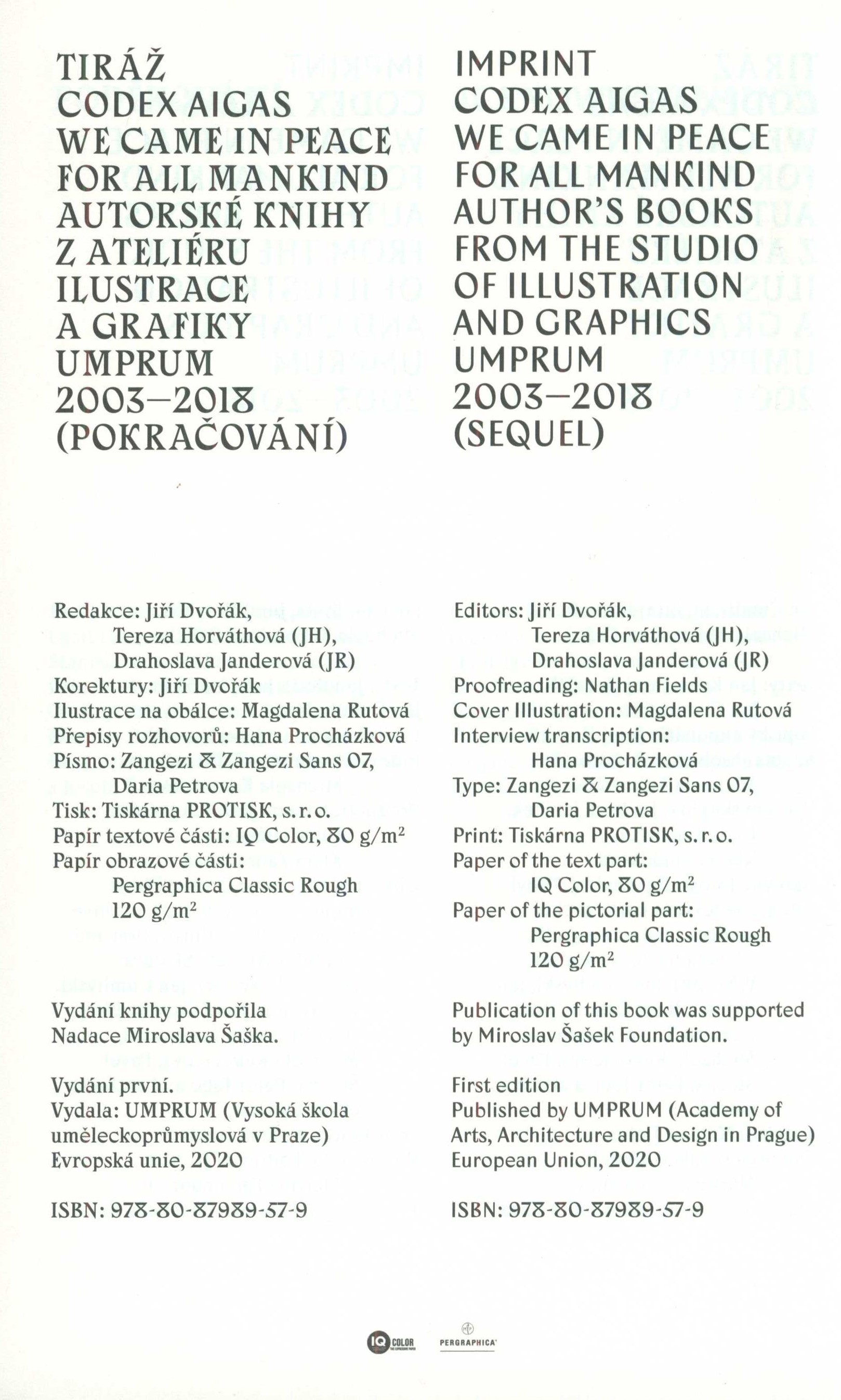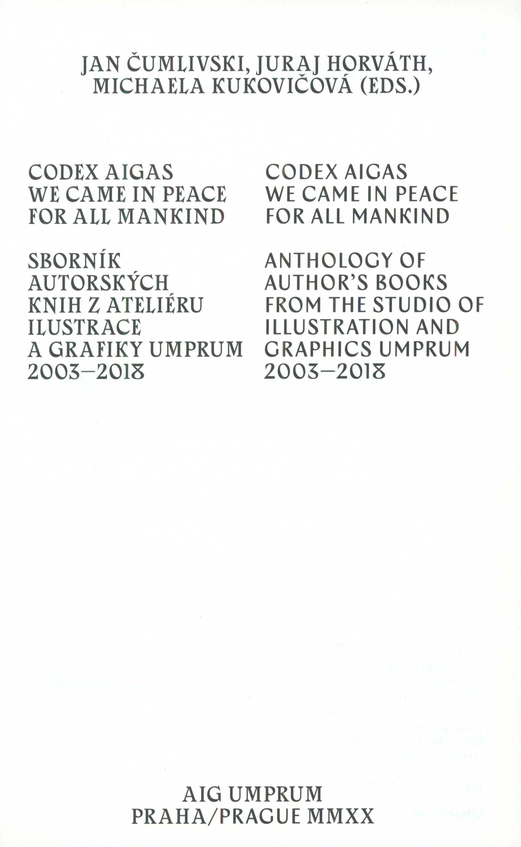 Názvové údaje Codex aigas - we came in peace for all mankind : sborník autorských knih z ateliéru ilustrace a grafiky UMPRUM 2003-2018 = anthology of author's books from the Studio of Illustration and Graphics UMPRUM 2003-2018 / Jan Čumlivski, Juraj Horváth, Michaela Kukovičová (eds.) ; barevné fotografie Ondřej Přibyl ; překlad Nathan Fields ; ilustrace na obálce Magdalena Rutová Další autoři Čumlivski, Jan, 1978- (Editor) Horváth, Juraj, 1974- (Editor) Kukovičová, Michaela, 1968- (Editor) Přibyl, Ondřej, 1978- (Fotograf) Fields, Nathan, 1977- (Překladatel) Rutová, Magdalena, 1988- (Ilustrátor) Korp. Vysoká škola uměleckoprůmyslová. Ateliér ilustrace a grafiky (Autor) (Nakladatel, vydavatel) Protisk (tiskárna, České Budějovice) (Tiskař) Údaje o vydání Vydání první Nakladatel Praha : AIG UMPRUM, 2020 Výrobce [České Budějovice] : Tiskárna PROTISK, s.r.o. Rozsah 952 stran : ilustrace (převážně barevné), faksimile ; 24 cm ISBN 978-80-87989-57-9 (brožováno) Země vyd. Česko Jazyk dok. čeština * angličtina Jazyk orig. čeština Poznámky Barevná ilustrace na obálce. - Souběžný český a anglický text. - Převážně barevné fotografické reprodukce a faksimile s popiskami. - Obsahuje bibliografické odkazy.