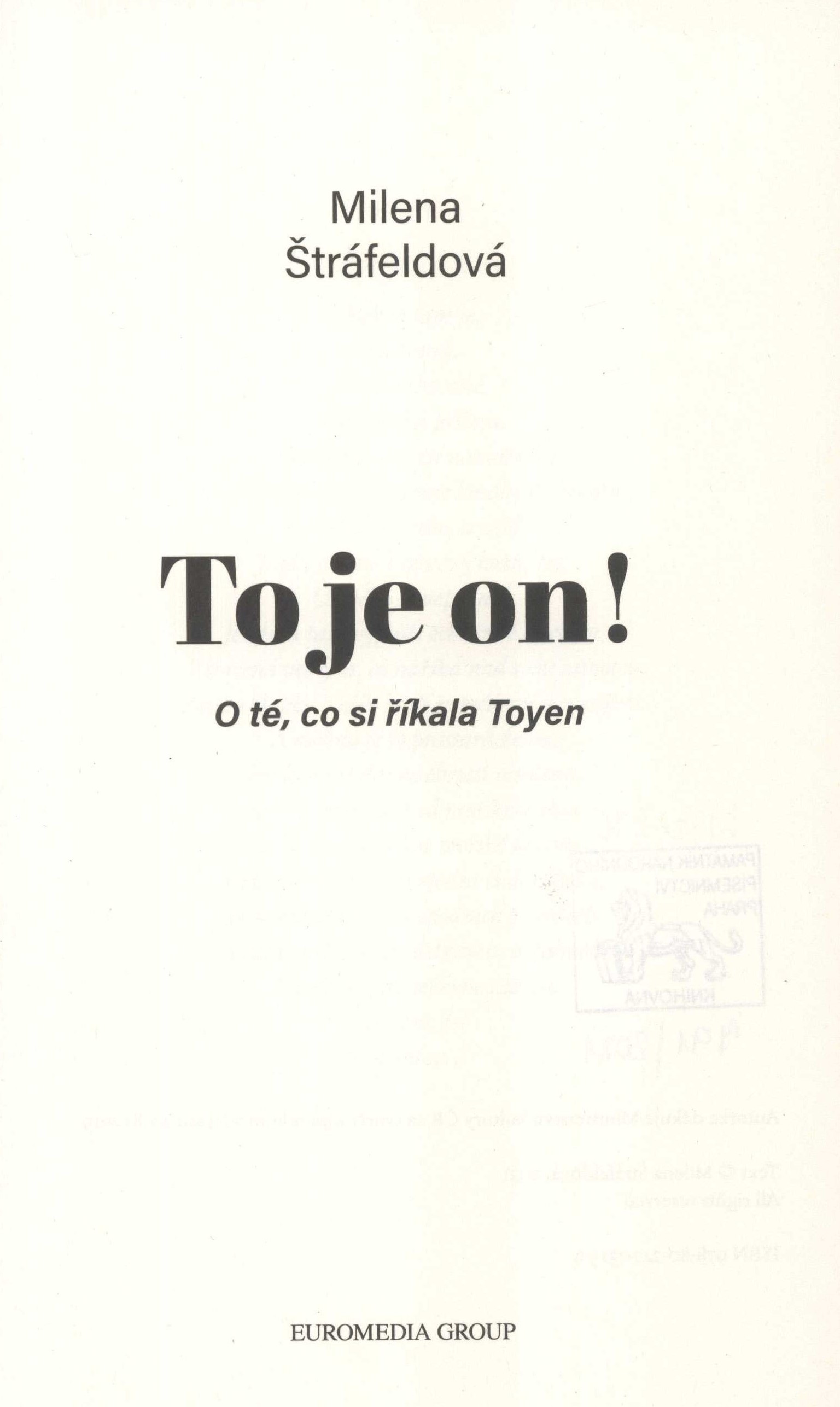 Anotace To je on! – Tři slova, ze kterých možná vzniklo umělecké jméno surrealistické malířky Toyen. Jméno stejně záhadné, jako byla sama. Jako by za sebou stále zametala stopy. Svá svědectví tak o ní podali jiní. Malíř Jindřich Štyrský, se kterým vytvořila celoživotní uměleckou dvojici. Židovský básník Jindřich Heisler, kterého až do konce války skrývala ve své žižkovské garsonce, protože odmítl nastoupit do transportu. Její přátelé z Devětsilu Vítězslav Nezval, Jaroslav Seifert nebo Karel Teige. Nebo francouzští surrealisté, když v r. 1947 odešla do pařížského exilu. Díky těmto svědectvím, ale i na základě pátrání v archivech v Česku a ve Francii, napsala Milena Štráfeldová její beletrizovaný životopis. Příběh Marie Čermínové, rodačky z pražského Smíchova, kterou sám André Breton zařadil mezi deset nejvýznamnějších světových umělců 20. století. Druh dok. monografie Osobní hesla Toyen, 1902-1980 - malířka, grafička, ilustrátorka Klíčová slova česká literatura * próza * biografický román * malířky * umělkyně * Toyen * Česko * Francie * stol. 20. MDT 82-312.6 * 82-3 * 821.162.3 * 821.162.3-31 * 75.071.1-055.2 * 929 * (437.3) * (44) * (0:82-312.6) Uživatelské pole PNP "Vydala Euromedia Group, a.s., v edici Universum"--Tiráž Signatura Přír.číslo Lokace Info LITc 0276 0791/2021 Sbírka