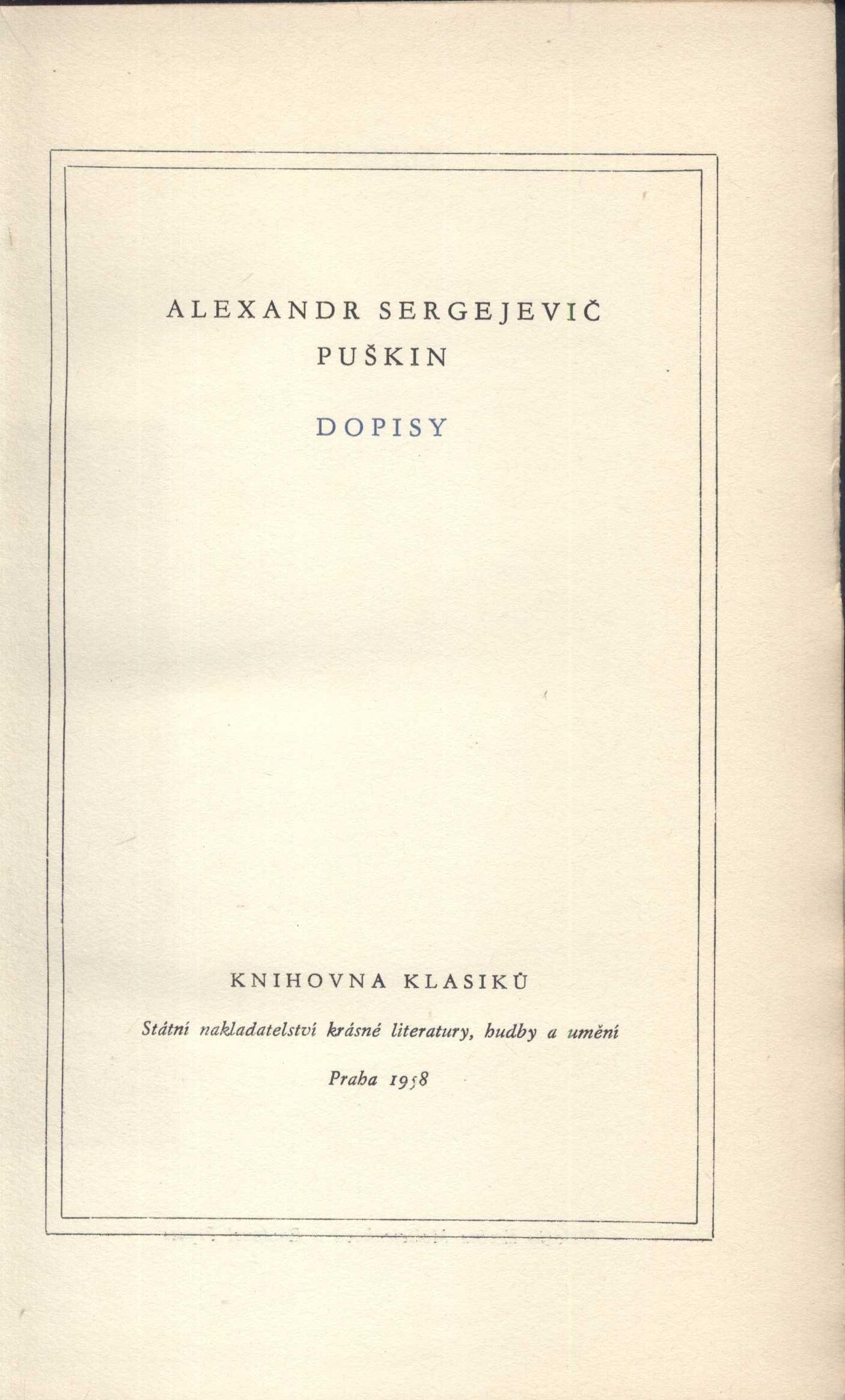 Názvové údaje Dopisy / Alexandr Sergejevič Puškin ; z ruského originálu A. S. Puškin: Polnoje sobranije sočinenij ... přeložili Ervína Moisejenková a Emanuel Frynta ; doslov a poznámky, vysvětlivky a jmenný rejstřík sestavila Jiřina Táborská ; graficky upravil František Muzika Osobní jméno Puškin, Aleksandr Sergejevič, 1799-1837 (Autor) Další autoři Moisejenková, Ervína (Překladatel) Frynta, Emanuel, 1923-1975 (Překladatel) Táborská, Jiřina, 1926-2004 (Autor doslovu, tiráže atd.) (Autor komentáře) Muzika, František, 1900-1974 (Knižní grafik) Korp. Státní nakladatelství krásné literatury, hudby a umění (Nakladatel, vydavatel) Tisk Brno (tiskárna) (Tiskař) Údaje o vydání První vydání Nakladatel Praha : Státní nakladatelství krásné literatury, hudby a umění, 1958 Výrobce Brno: Tisk, knižní výroba, n. p. Rozsah 510 stran ; 21 cm ISBN (Vázáno) Edice Knihovna klasiků