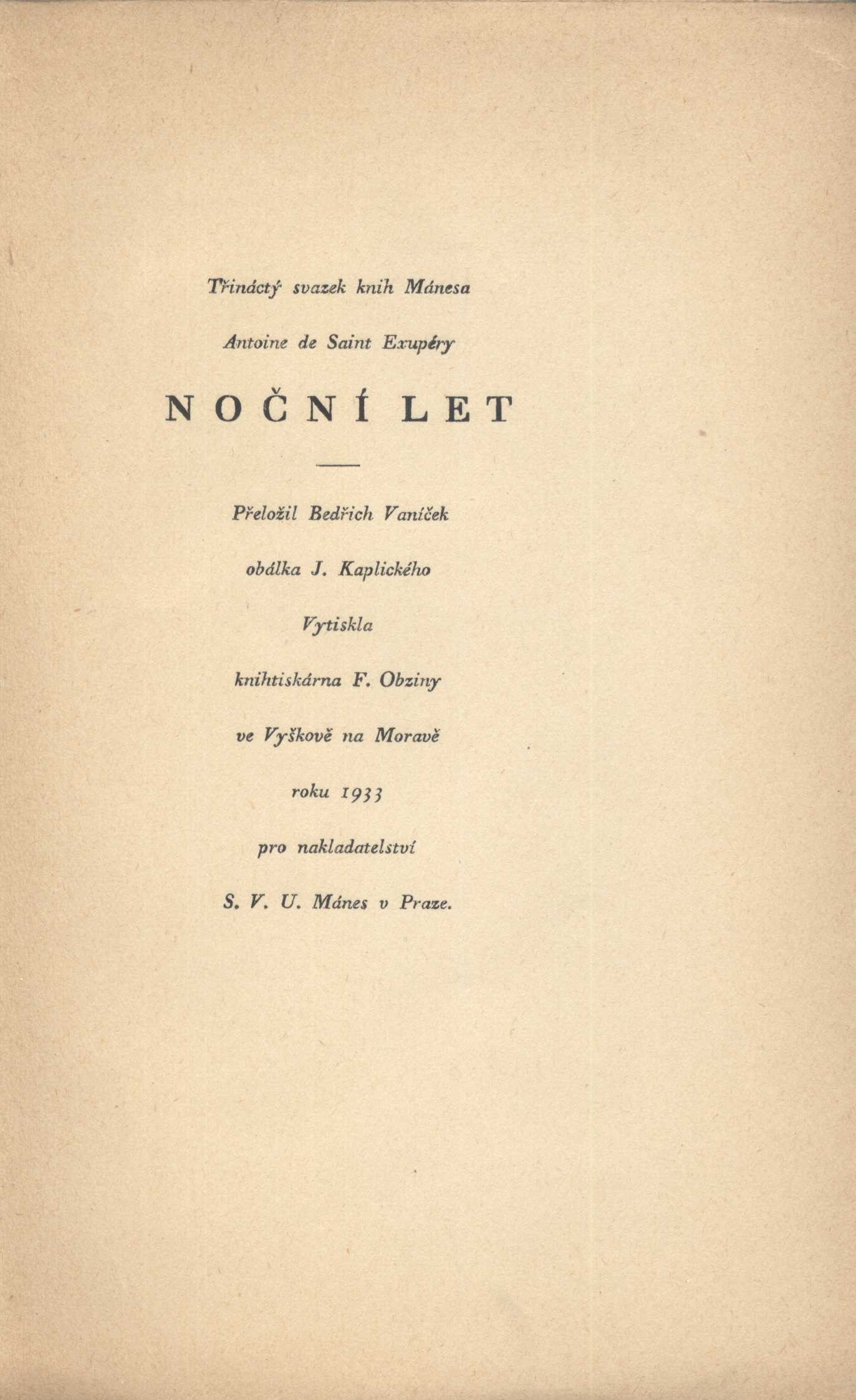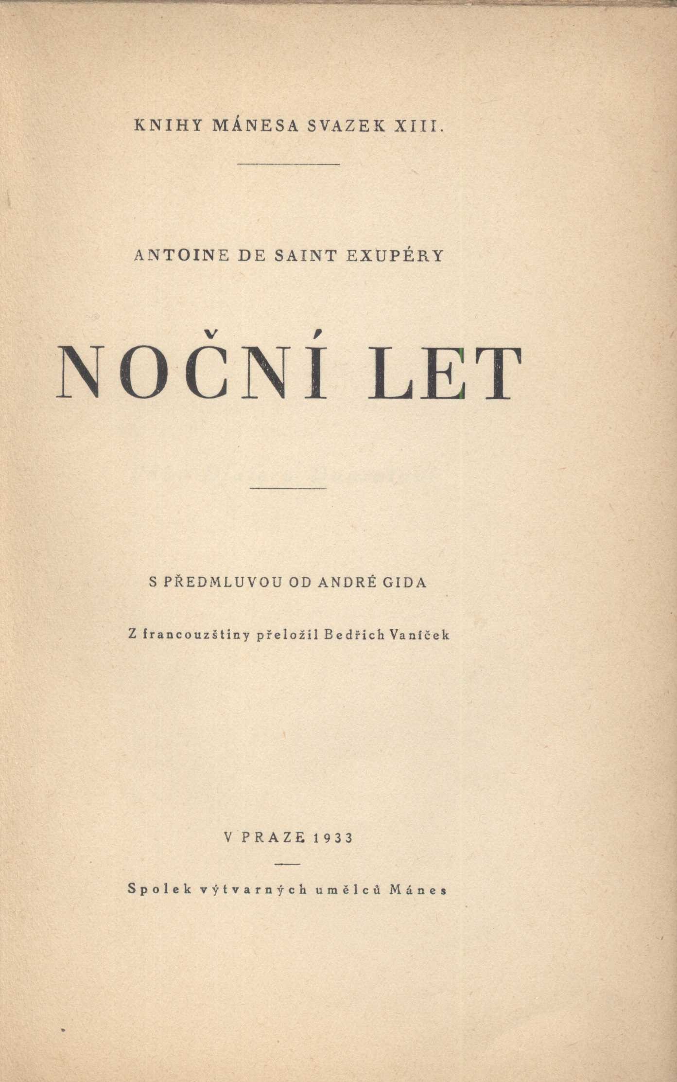 Názvové údaje Noční let / Antoine de Saint Exupéry ; s předmluvou od André Gida ; z francouzštiny přeložil Bedřich Vaníček Osobní jméno Saint-Exupéry, Antoine de, 1900-1944 (Autor) Další autoři Vaníček, Bedřich, 1885-1955 (Překladatel) Gide, André, 1869-1951 (Autor úvodu atd.) Kaplický, Josef, 1899-1962 Korp. Spolek výtvarných umělců Mánes (Nakladatel, vydavatel) František Obzina (tiskárna, nakladatelství) (Tiskař) Nakladatel V Praze : Spolek výtvarných umělců Mánes, 1933 Výrobce Ve Vyškově na Moravě : knihtiskárna F. Obziny Rozsah 124 stran ; 20 cm ISBN (Brožováno) Edice Knihy Mánesa ; svazek XIII.
