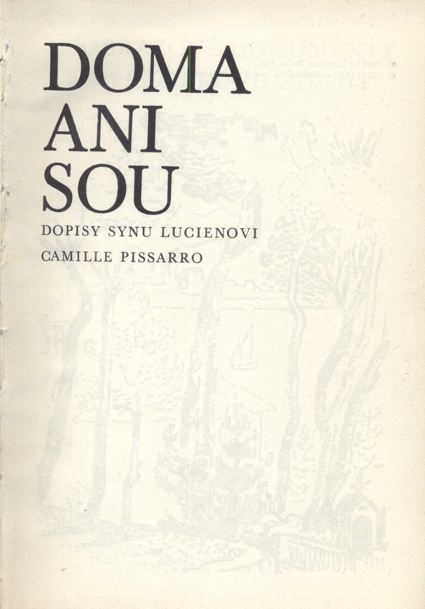 Názvové údaje Doma ani sou : dopisy synu Lucienovi / Camille Pissarro ; přeložila Věra Smetanová Osobní jméno Pissarro, Camille, 1830-1903 (Autor) (Umělec) Další autoři Smetanová, Věra, 1922-1967 (Překladatel) Fiala, Vlastimil, 1920-1993 (Autor úvodu atd.) Šejna, Felix, 1909-1997 (Autor obálky) (Výtvarník vazby) (Knižní grafik) Laudová, Věra, 1925- (Jiná role) Korp. Obelisk (nakladatelství) (Nakladatel, vydavatel) Státní tiskárna v Praze (Tiskař) Další var.názvy Dopisy synu Lucienovi Údaje o vydání Vydání první Nakladatel Praha : Obelisk, nakladatelství umění a architektury, 1970 Výrobce Praha : Státní tiskárna, n. p. závod 1 Rozsah 373 stran, 72 nečíslovaných stran obrazové přílohy, 4 nečíslované listy barevné obrazové přílohy : ilustrace, reprodukce (částečně barevné), fotografie ; 21 cm ISBN (Vázáno) Země vyd. Česko Jazyk dok. čeština Jazyk orig. francouzština Poznámky Předmluva Vlastimil Fiala