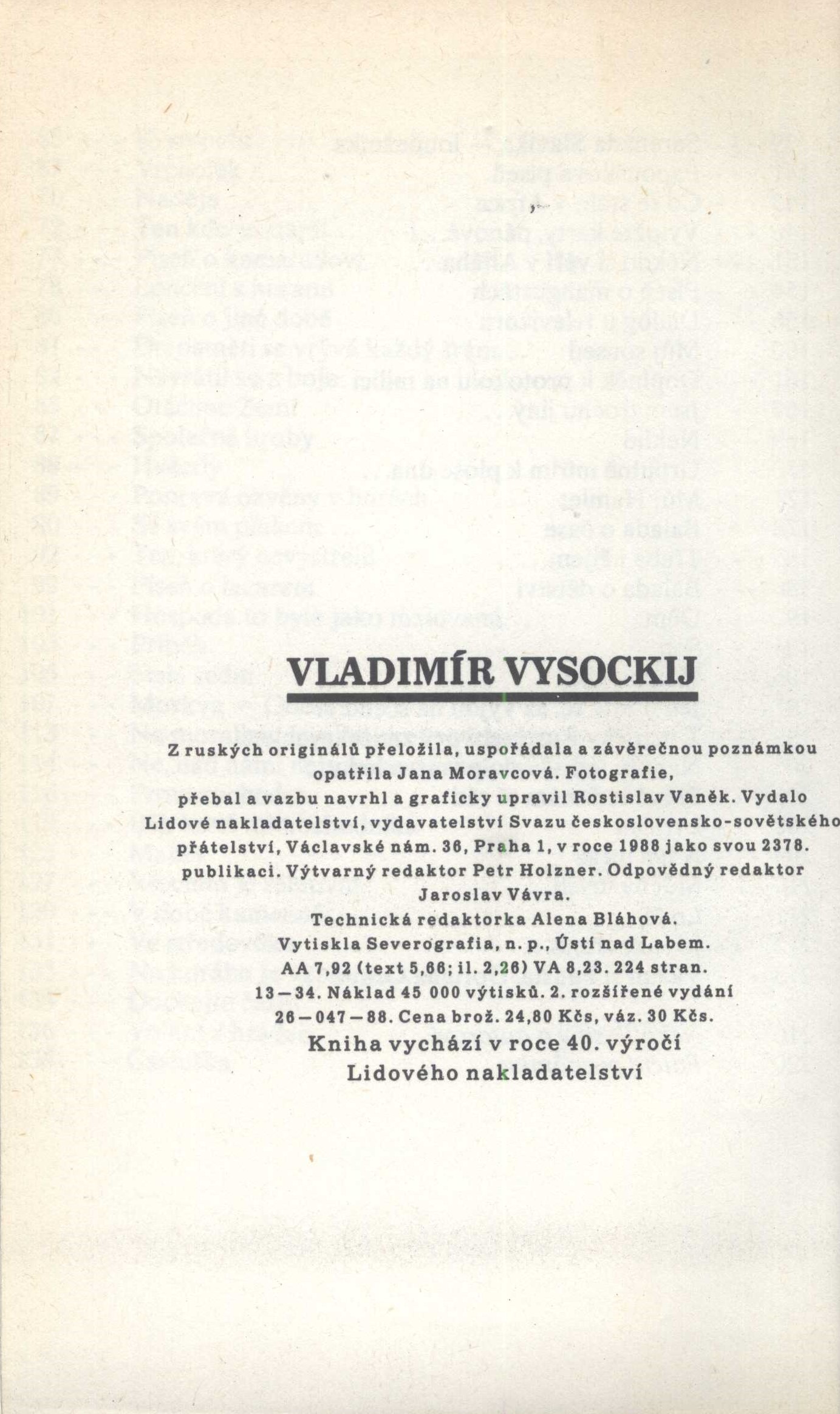 Title information Vladimír Vysockij / z ruských originálů přeložila, uspořádala a závěrečnou poznámkou opatřila Jana Moravcová Personal name Vysockij, Vladimir, 1938-1980 (Author) Další autoři Moravcová, Jana, 1937-2018 (Translator) (Compiler) (Commentator) Vaněk, Rostislav, 1945- (Photographer) (Bookjacket designer) (Binding designer) (Book designer) Corporation Lidové nakladatelství (Publisher) Severografia Ústí nad Labem (tiskárna) (Printer) (Printer of plates) Edition statement 2. rozšířené vydání Publication Praha : Lidové nakladatelství, 1988 Manufacture Ústí nad Labem : Severografia, n. p. Scope 218 stran : ilustrace, fotografie ; 21 cm ISBN (Vázáno) Country Czech Republic Language Czech Language of the original Russian Note Fotografie, přebal a vazbu navrhl a graficky upravil Rostislav Vaněk