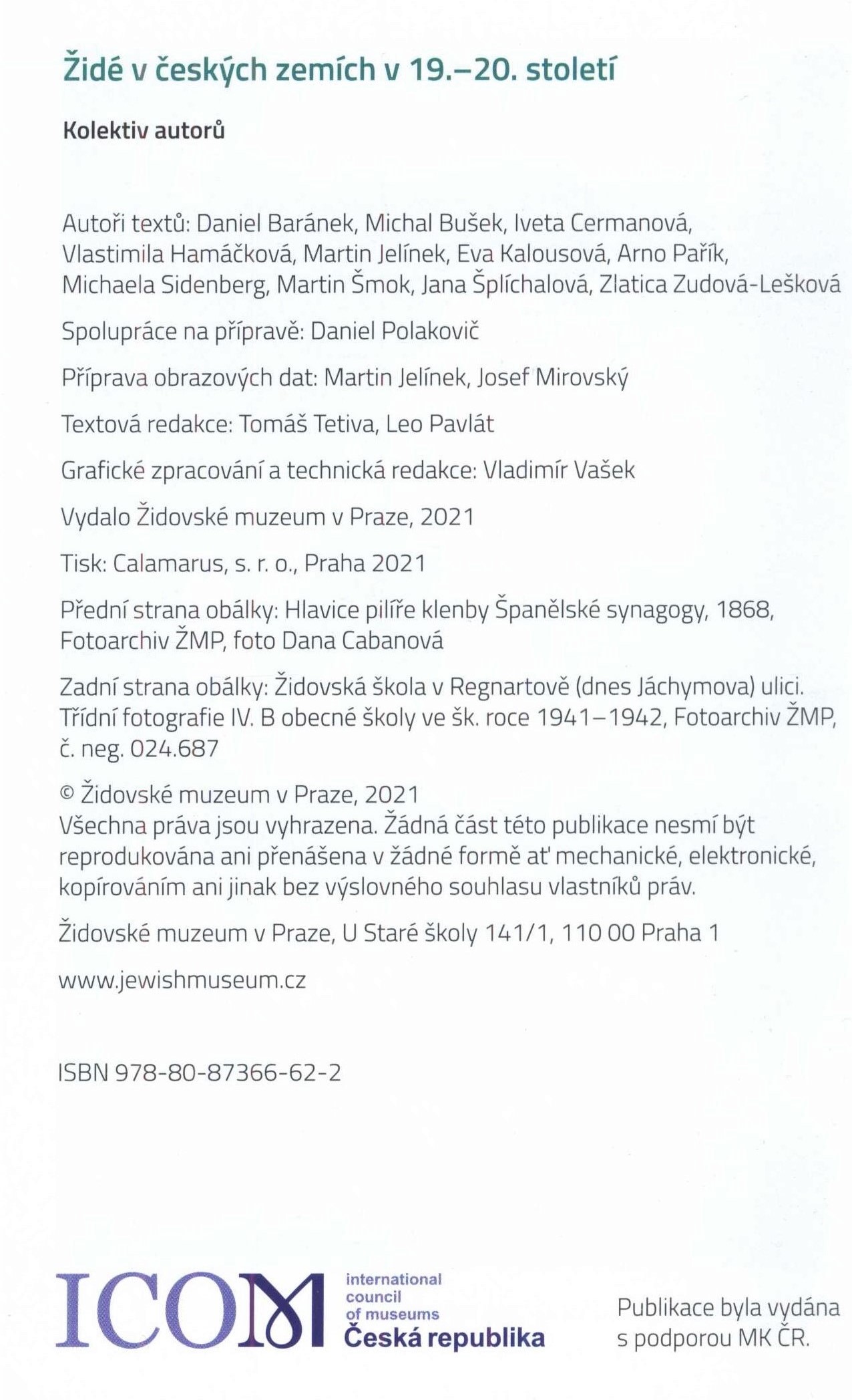 Názvové údaje Židé v českých zemích v 19.-20. století / kolektiv autorů ; grafické zpracování a technická redakce Vladimír Vašek Další autoři Vašek, Vladimír, 1974- (Knižní grafik) Korp. Židovské muzeum (Praha, Česko) (Nakladatel, vydavatel) Calamarus (tiskárna) (Tiskař) Nakladatel V Praze : Židovské muzeum, 2021 Výrobce Calamarus, s.r.o. Rozsah 99 stran : ilustrace (převážně barevné), portréty, faksimile ; 20 cm ISBN 978-80-87366-62-2 (brožováno) Země vyd. Česko Jazyk dok. čeština Poznámky Zdobená barevná obálka a titulní list. - Převážně barevné ilustrace, fotografie, portréty a faksimile s popiskami. - Obsahuje bibliografii. - Seznam poskytovatelů obrazového materiálu.