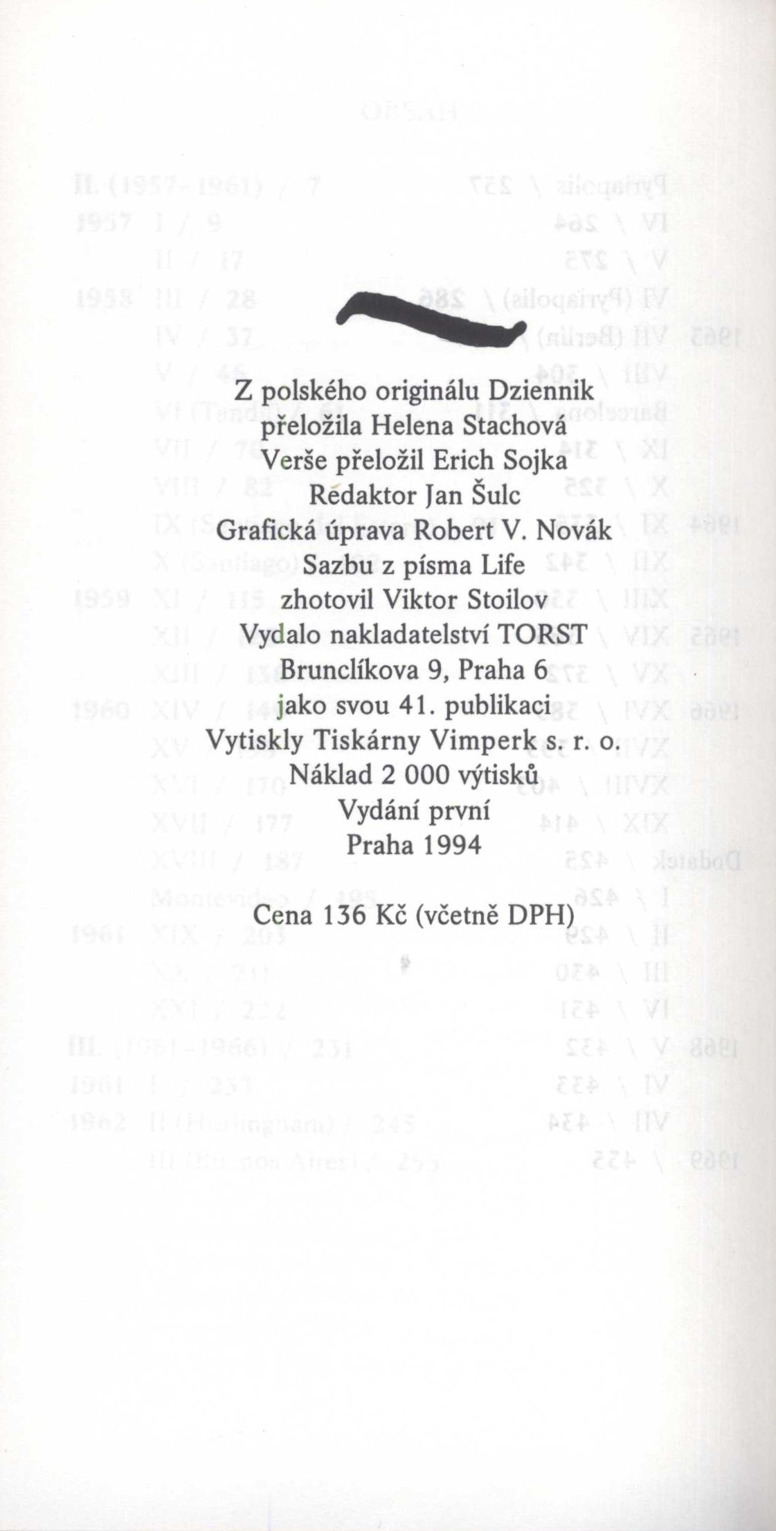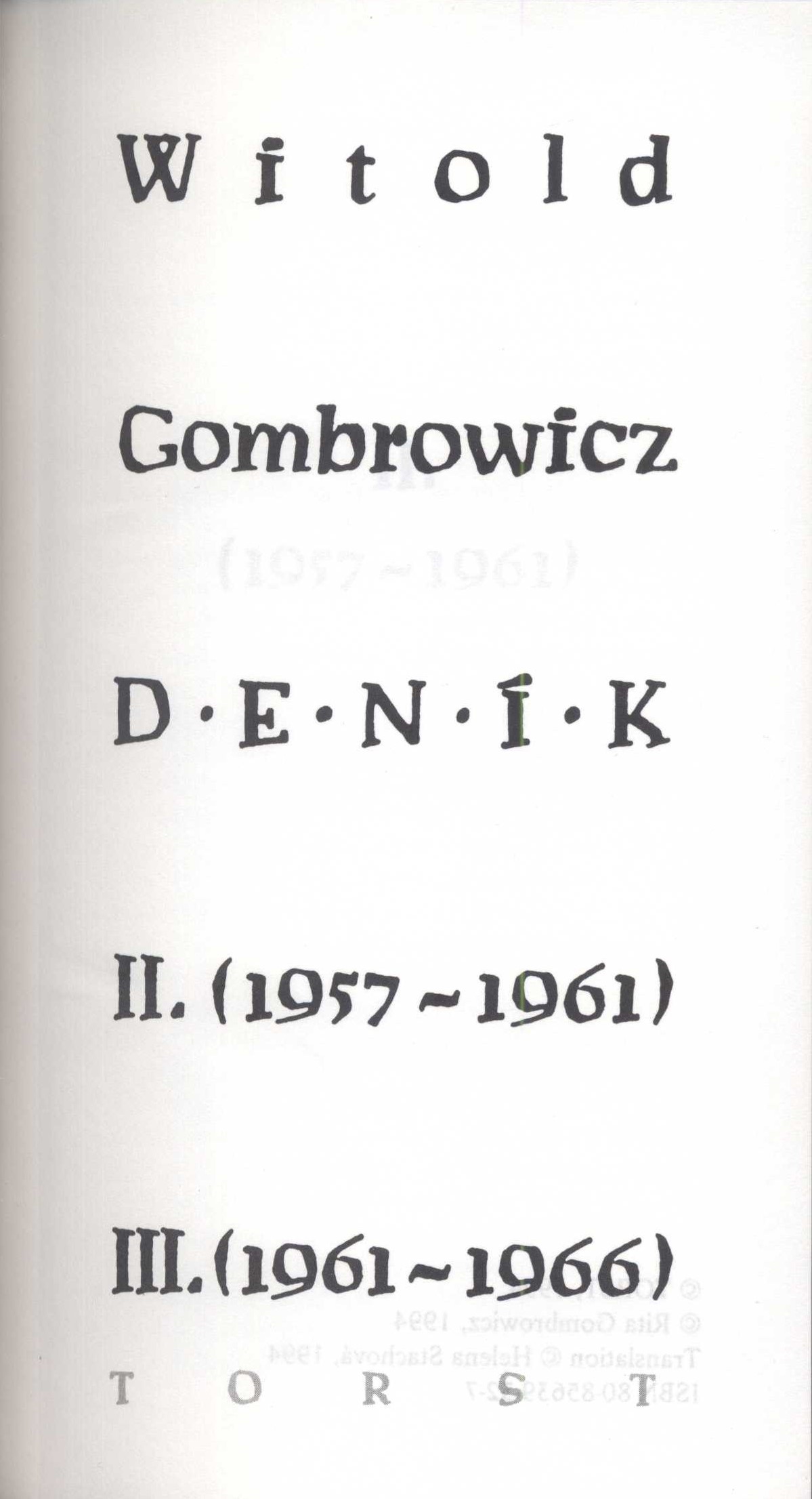 Názvové údaje Deník. II. (1957-1961) ; III. (1961-1966) / Witold Gombrowicz ; z polského originálu Dziennik přeložila Helena Stachová Osobní jméno Gombrowicz, Witold, 1904-1969 (Autor) Další autoři Stachová, Helena, 1931- (Překladatel) Sojka, Erich, 1922-1997 (Překladatel) Novák, Robert V., 1962- (Knižní grafik) Stoilov, Viktor, 1961- (Sazeč) Korp. Nakladatelství Torst (Nakladatel, vydavatel) Tiskárny Vimperk (firma) (Tiskař) Údaje o vydání Vydání první Nakladatel Praha : Torst, 1994 Výrobce [Vimperk] : Tiskárny Vimperk s. r. o. Rozsah 445 stran ; 20 cm ISBN 80-85639-18-1 (vázáno) Země vyd. Česko Jazyk dok. čeština Jazyk orig. polština Poznámky Verše přeložil Erich Sojka