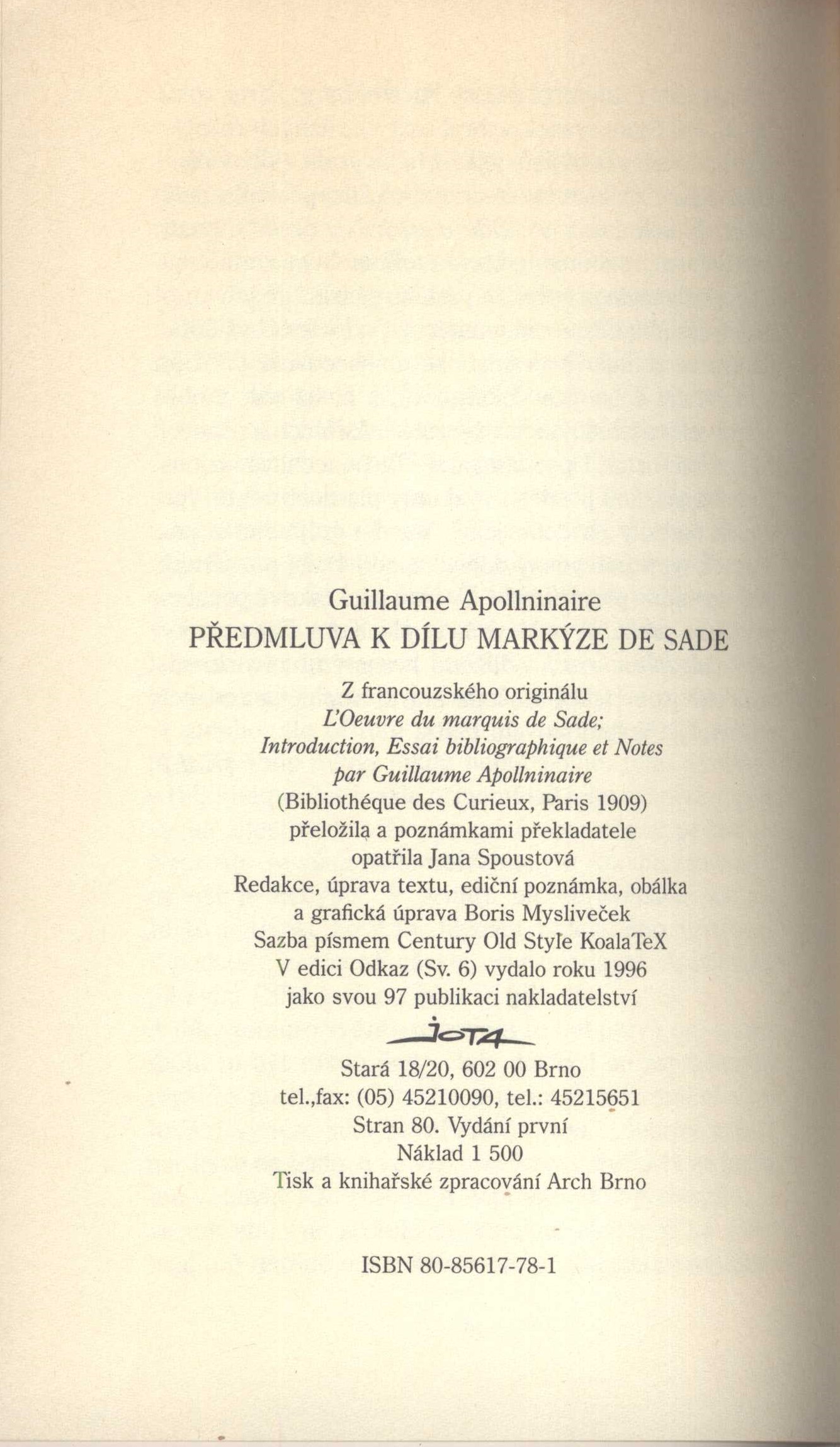 Odkaz, (Jota)Země vyd. Česko Jazyk dok. čeština Jazyk orig. francouzština Poznámky Redakce, úprava textu, ediční poznámka, obálka a grafická úprava Boris Mysliveček