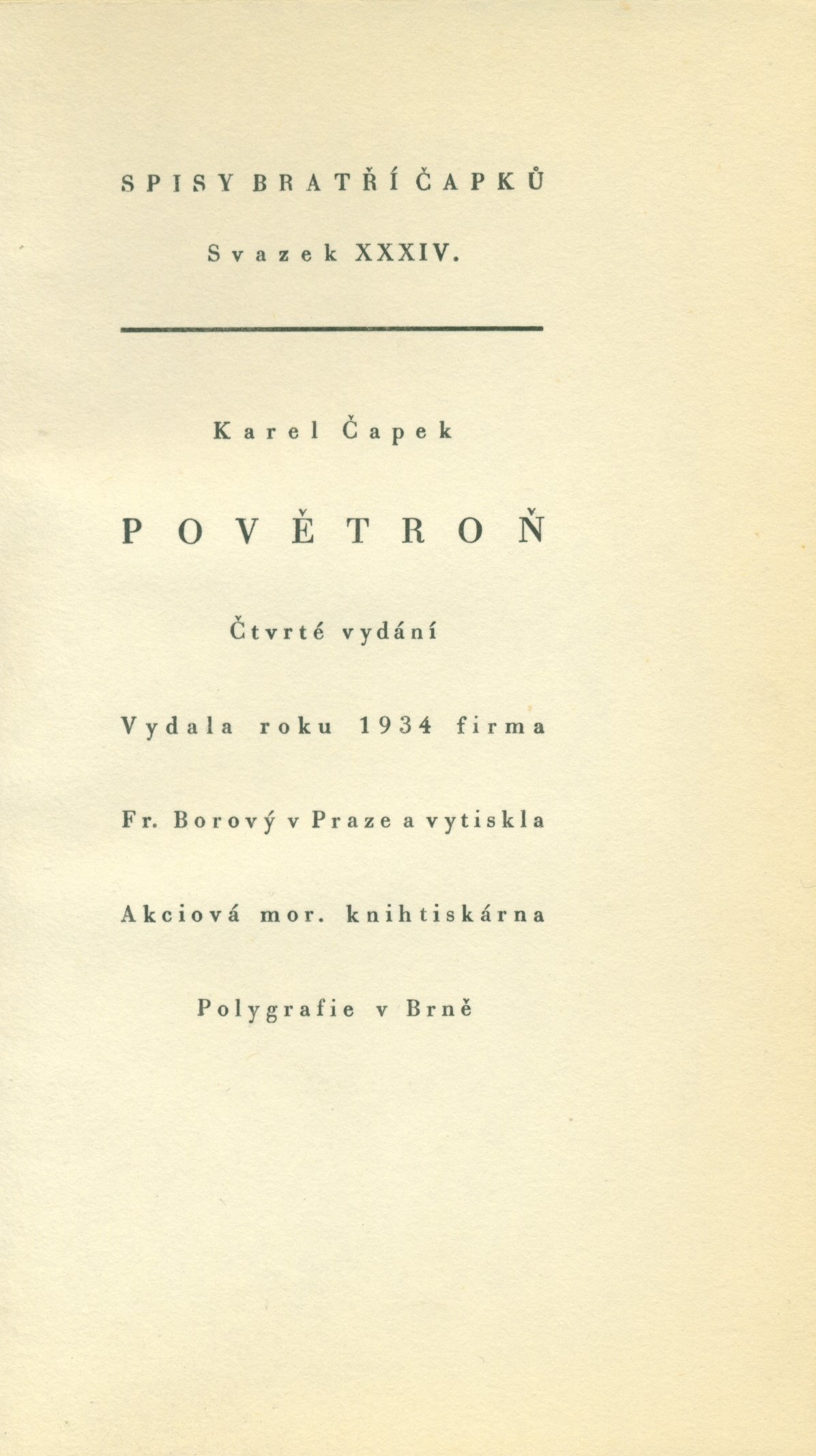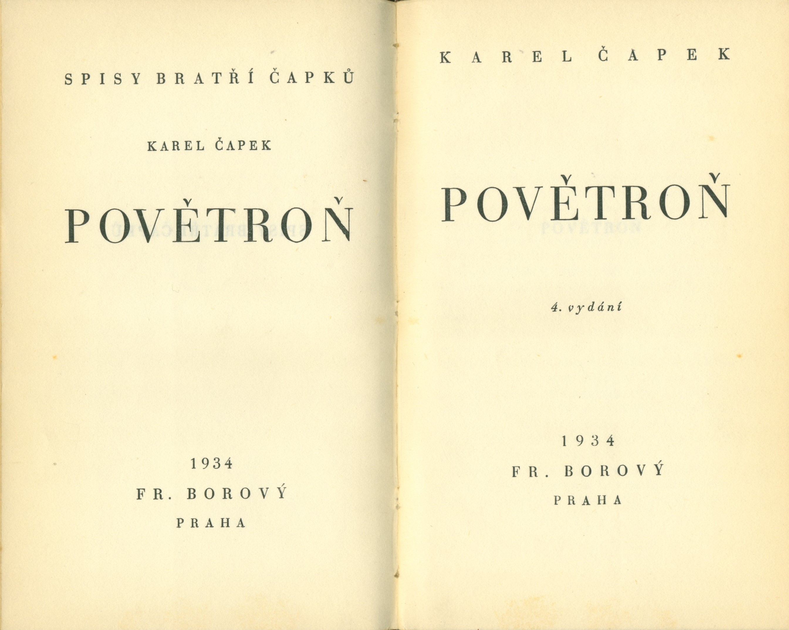 Názvové údaje Povětroň / Karel Čapek Osobní jméno Čapek, Karel, 1890-1938 (Autor) Další autoři Fr. Borový (firma) (Nakladatel, vydavatel) Akciová moravská knihtiskárna Polygrafie (Tiskař) Údaje o vydání 4. vydání Nakladatel Praha : Fr. Borový, 1934 Výrobce V Brně : Akciová mor. knihtiskárna Polygrafie Rozsah 222 stran ; 19 cm ISBN (Vázáno) Edice Spisy bratří Čapků ; svazek XXXIV.