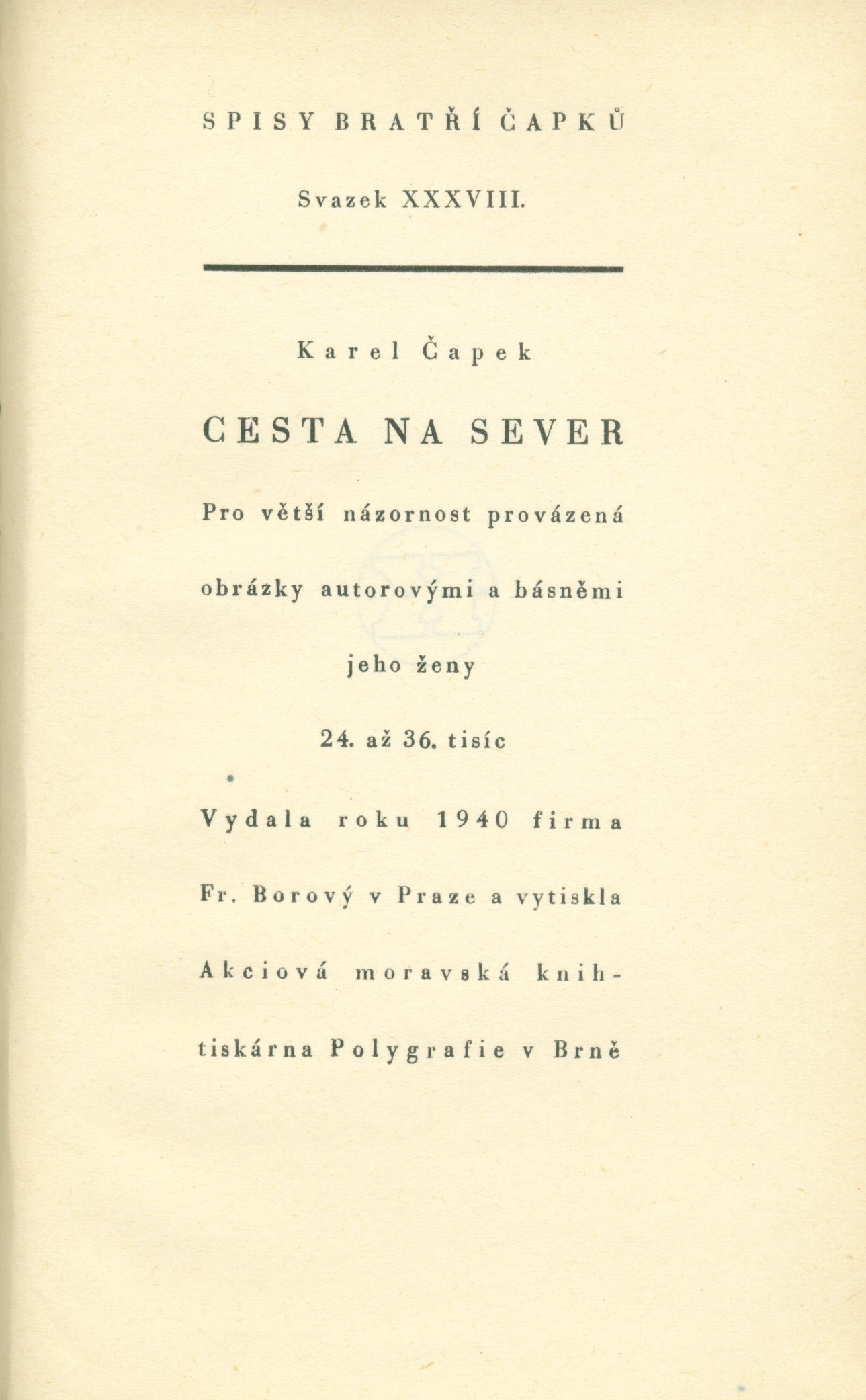Názvové údaje Cesta na sever : pro větší názornost provázená obrázky autorovými a básněmi jeho ženy / Karel Čapek Osobní jméno Čapek, Karel, 1890-1938 (Autor) (Ilustrátor) Další autoři Scheinpflugová, Olga, 1902-1968 (Autor) Muzika, František, 1900-1974 (Autor obálky) Korp. Fr. Borový (firma) (Nakladatel, vydavatel) Akciová moravská knihtiskárna Polygrafie (Tiskař) (Tiskař obrazu) Další var.názvy Pro větší názornost provázená obrázky autorovými a básněmi jeho ženy Údaje o vydání 24. až 36. tisíc Nakladatel Praha : Fr. Borový, 1940 Výrobce V Brně : Akciová mor. knihtiskárna Polygrafie Rozsah 285 stran, 1 nečíslovaný list barevné obrazové přílohy : ilustrace ; 19 cm ISBN (Vázáno) Edice Spisy bratří Čapků ; svazek XXXVIII.