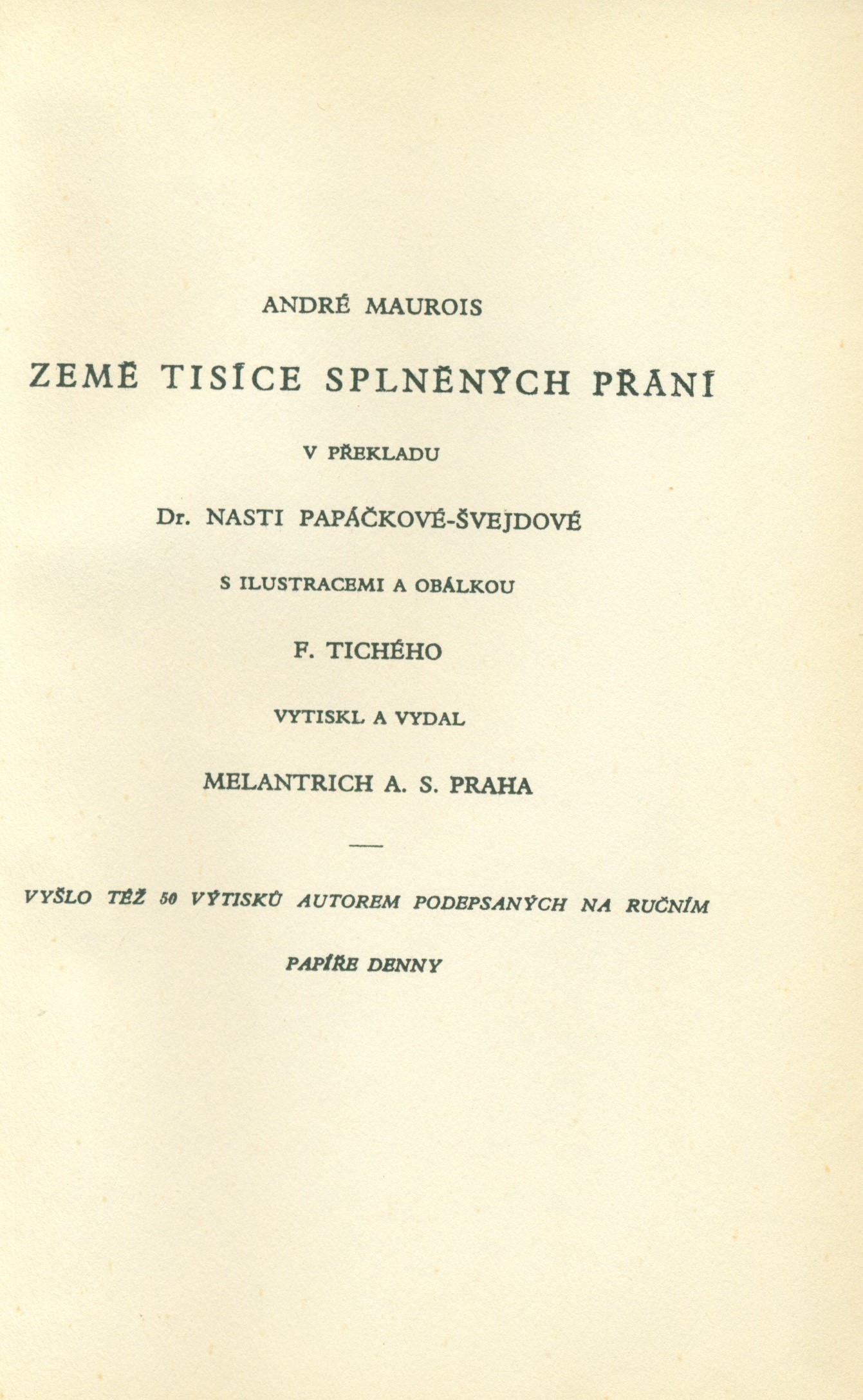 Názvové údaje Země tisíce splněných přání / André Mauroius ; v překladu Nasti Papáčkové-Švejdové Osobní jméno Maurois, André, 1885-1967 (Autor) Další autoři Švejdová, Nasťa (Překladatel) Tichý, František, 1896-1961 (Ilustrátor) (Autor obálky) Korp. Melantrich (nakladatelství) (Nakladatel, vydavatel) (Tiskař) (Tiskař obrazu) Nakladatel Praha : vytiskl a vydal Melantrich, a. s., 1929 Rozsah 67 stran : ilustrace ; 20 cm ISBN (Vázáno) Země vyd. Česko Jazyk dok. čeština Jazyk orig. francouzština Poznámky S ilustracemi a obálkou F. Tichého