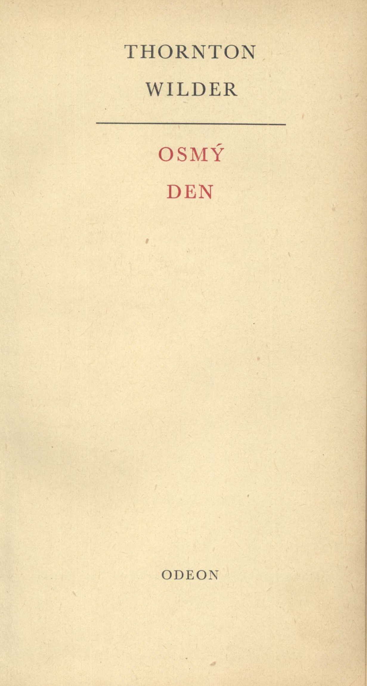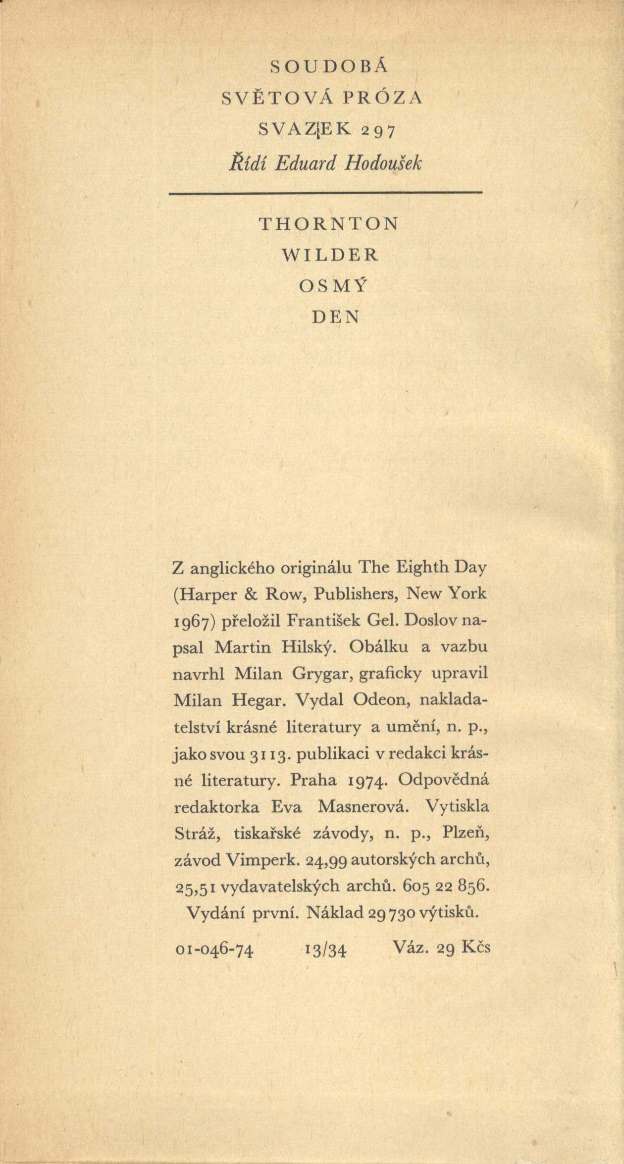 Názvové údaje Osmý den / Thornton Wilder ; z anglického originálu The Eighth Day ... přeložil František Gel Osobní jméno Wilder, Thornton, 1897-1975 (Autor) Další autoři Gel, František, 1901-1972 (Překladatel) Hilský, Martin, 1943- (Autor doslovu, tiráže atd.) Grygar, Milan, 1926- (Autor obálky) (Výtvarník vazby) Hegar, Milan, 1921-1987 (Knižní grafik) Korp. Odeon (nakladatelství) (Nakladatel, vydavatel) Stráž, tiskařské závody (Tiskař) Údaje o vydání Vydání první Nakladatel Praha : Odeon, 1974 Výrobce Vimperk : Stráž, tiskařské závody, n. p., Plzeň Rozsah 469 stran ; 21 cm ISBN (Vázáno) Edice Soudobá světová próza ; svazek 297