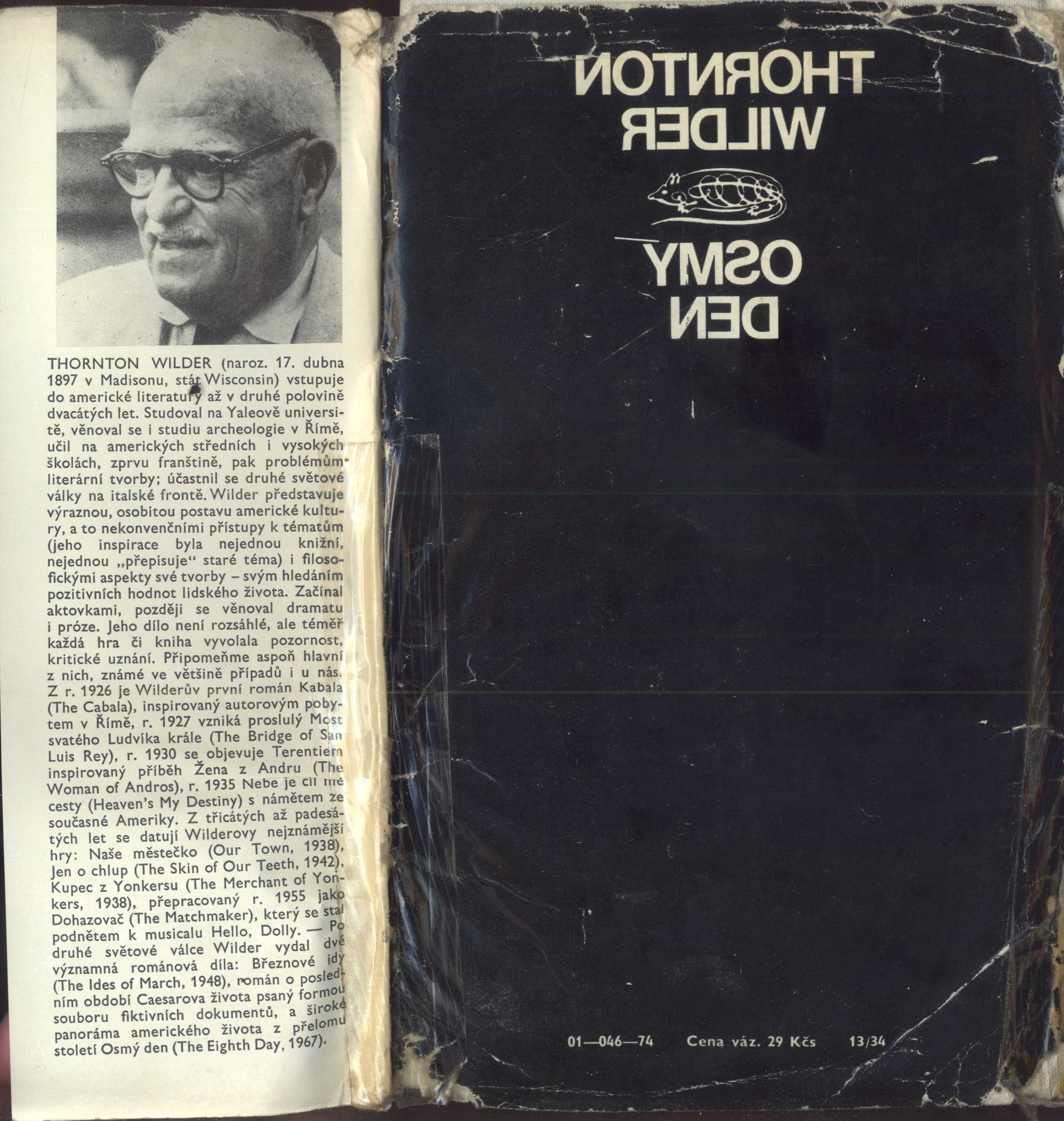 Anotace Realistický román amerického dramatika a prozaika přináší panoramatický pohled na americký život na sklonku minulého a na počátku tohoto století. V hornickém městečku je zastřelen vážený občan a z vraždy je obviněn a k smrti odsouzen jeho blízký spolupracovník a přítel rodiny, přičemž cestou na popraviště je mu umožněn útěk. Autor, který rozvíjí, dotváří a objasňuje maloměstskou tragédii vraždy z filosofického nadhledu, se v románě zamýšlí s ironií i s neochabující humanistickou vírou nad osmým dnem lidstva - dvacátým stoletím. Druh dok. monografie Poznámky o skryté bibliografii a rejstřících Bibliografie na záložce Název originálu Eighth day Osobní hesla Wilder, Thornton, 1897-1975 - americký spisovatel a dramatik Klíčová slova americká literatura * próza * román * Wilder T. * život lidu * Amerika * přelom 19. a 20. stol. * český překlad * Gel F. * r. 1974 MDT 821.111(73) * 82-3 * 82-31 * =030 Adr. el. zdr. http://krameriusndk.nkp.cz/search/handle/uuid:a11f5280-d4e5-11e2-bb18-005056827e51 Uživatelské pole PNP Knihovna R&A Hamanových - vázaný výtisk s obálkou. - Černá obálka s bílým textem i na hřbetu, na přední záložce upoutávka na knihu. - Bílá celoplátěná vazba s dvoubarevnou ražbou textu na hřbetu. - Barevná nakladatelská značka. - Edice a patitul. - Dvoubarevný titulní list. - Doslov. - Obsah. - Edice nad tiráží. - Na zadní záložce foto autora a poznámka o něm a jeho díle. - Zdobená i zadní strana obálky. Knihovna R&A Hamanových - slepovaná a podlepovaná narušená obálka, vazba mírně zašpiněná, zažloutlé listy místy ve hřbetu slepované, hnědé ořízky. Rozsah: 469, [6] s. Rozměr: 20,5 cm. Originál The Eighth Day vyšel poprvé v roce 1967. Signatura Přír.číslo Lokace Info R&AHamanovi 1285 0048/2022 Sbírka