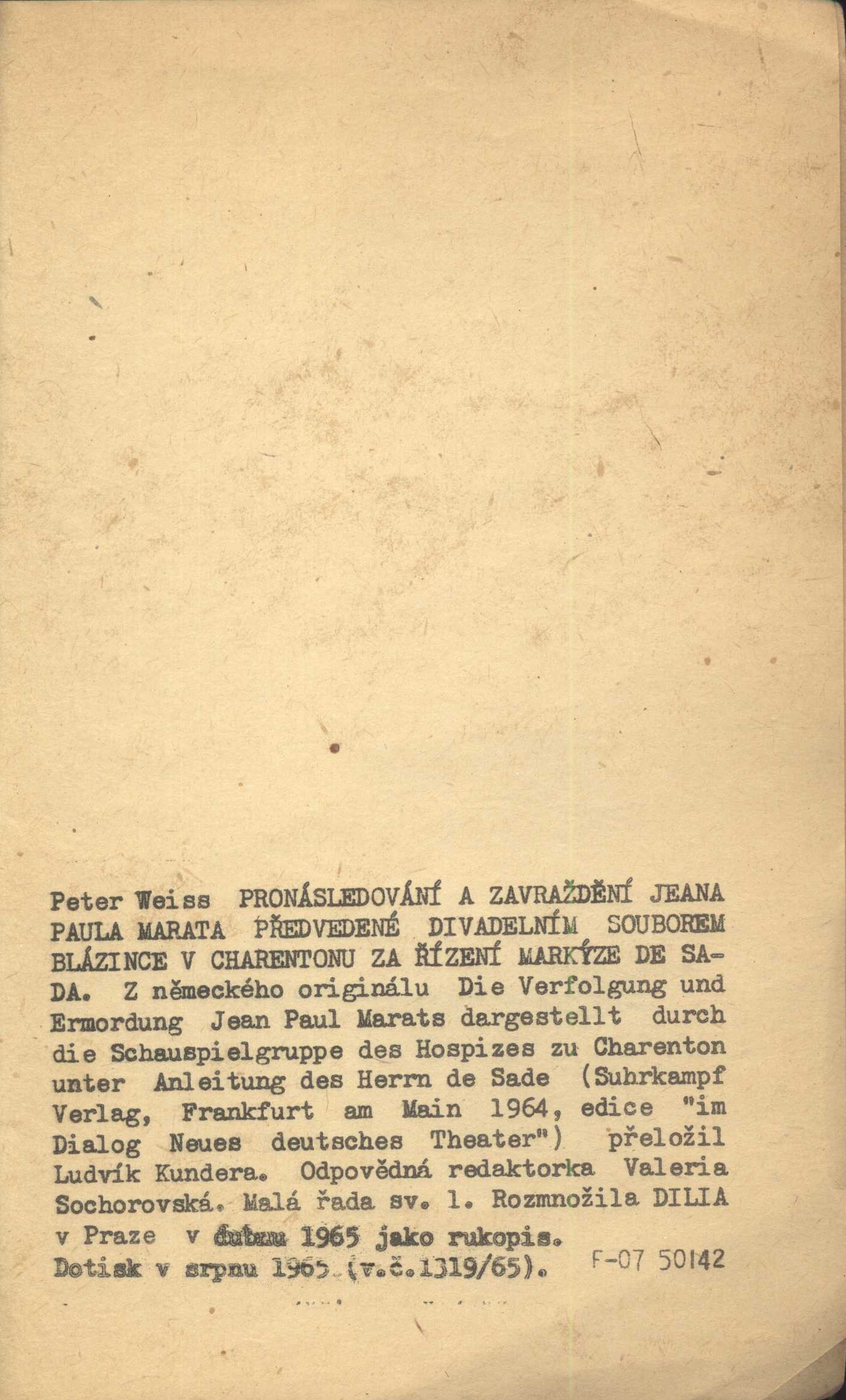 1. Názvové údajePronásledování a zavraždění Jeana Paula Marata předvedené divadelním souborem blázince v Charentonu za řízení markýze de Sada : drama o dvou dějstvích / Peter Weiss ; z německého originálu Die Verfolgung und Ermordung Jean Paul Marats dargestellt durch die Schauspielgruppe des Hospizes zu Charenton unter Anleitung des Herrn de Sade ... přeložil Ludvík Kundera